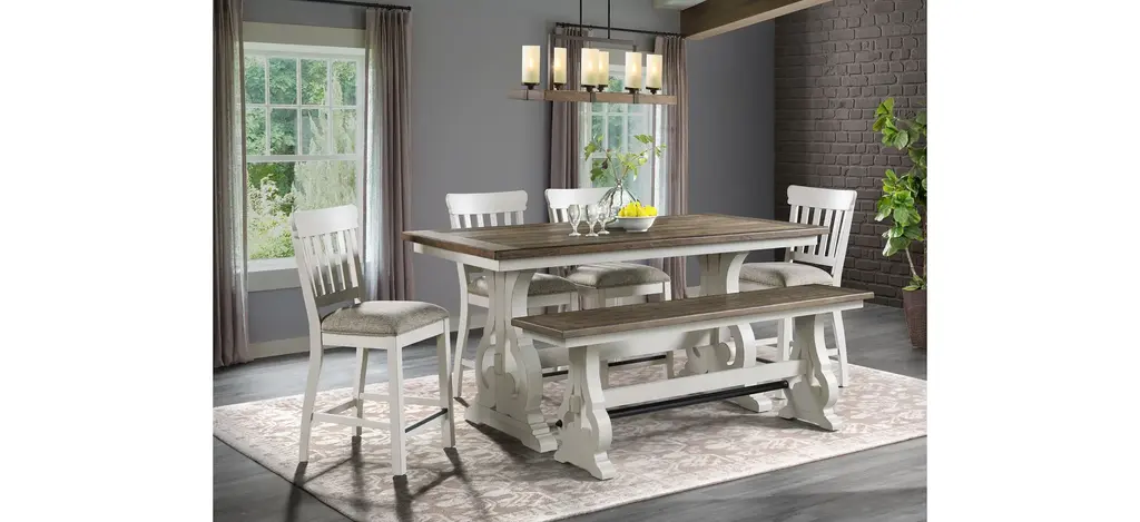 The Drake Counter Bench will fit perfectly in your traditional dining room. This bench is crafted of oak veneer and features side stretchers for added strength.