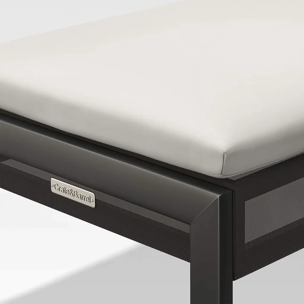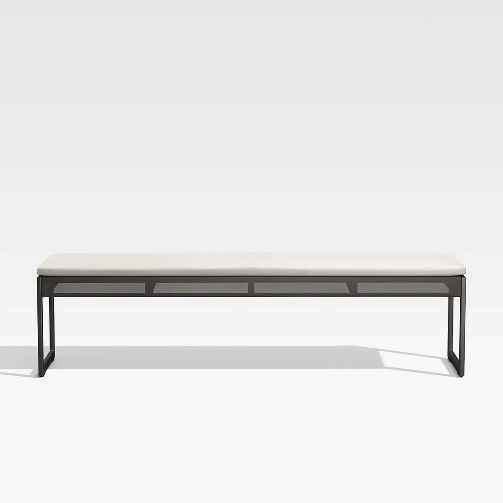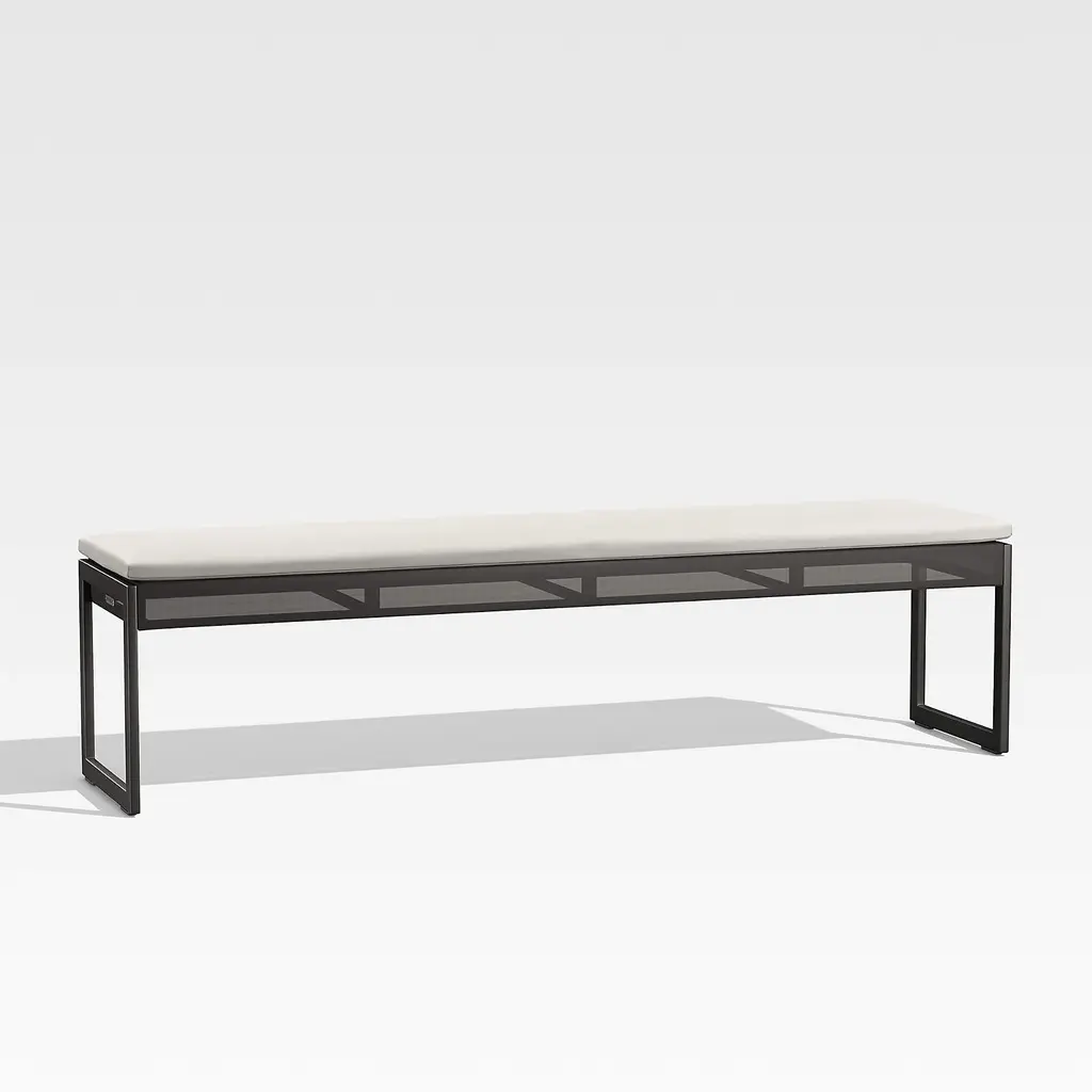 Our Dune collection creates a modern "indoor room" that lives outdoors. The urban-style black bench wraps fade-, mold-, tear- and stain-resistant mesh over a sleek aluminum frame. Adding graphic contrast and a layer of comfort, the crisply tailored cushion in a white weather-resistant fabric looks fresh all season long. Seating three, the bench pairs with our Dune dining table and chairs for a casual and contemporary outdoor dining experience.