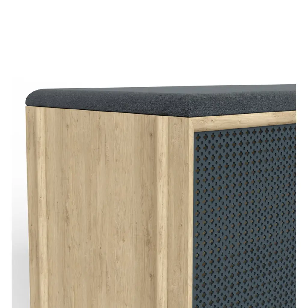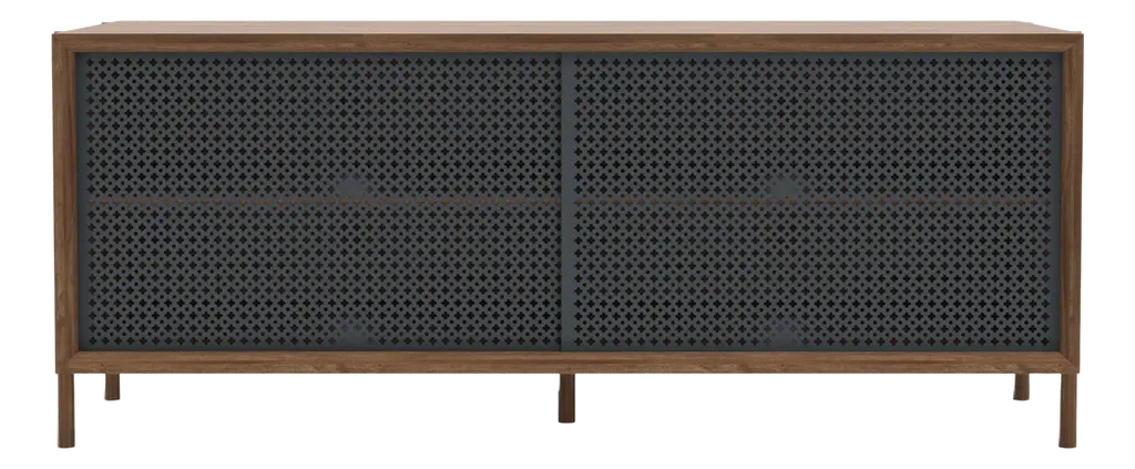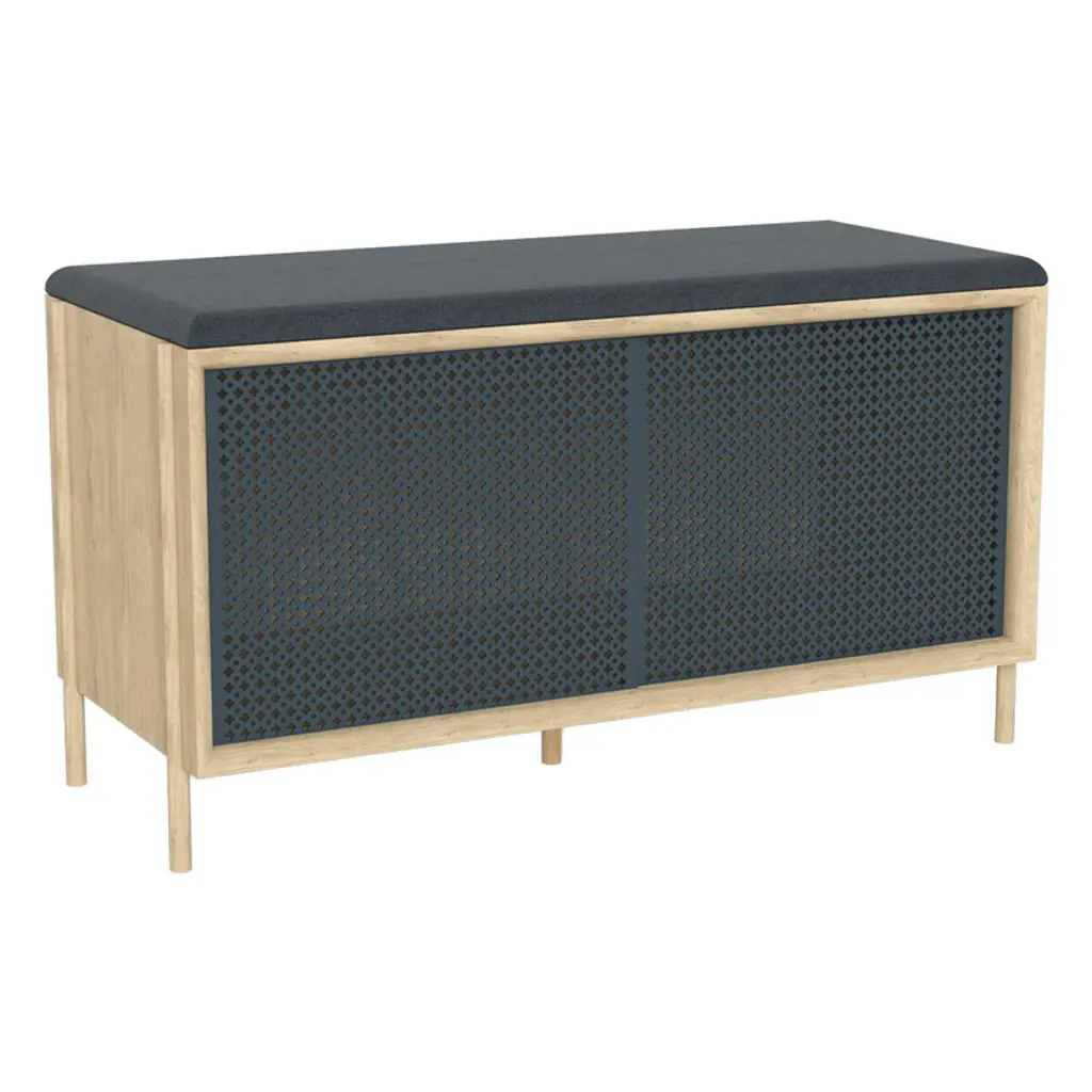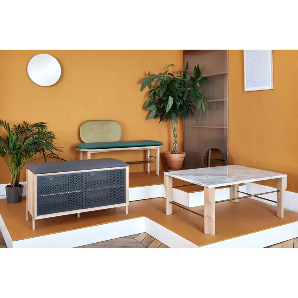 The Gabin bench by the French brand Hartô plays with the contrast of oak-veneered frame and metallic sliding doors. Equally great as a hallway bench or a storage bench in a lounge or dining area, the Gabin bench features a soft seat and plenty of storage space for shoes, books, tableware or items of your choice. The perforated pattern softens the appearance of the doors and gives the bench an atmospheric look. Gabin is a modern interpretation of vintage vitrines of the 1960s and its perforated pattern was inspired by wicker traditions. Gabin has been manufactured in Europe.