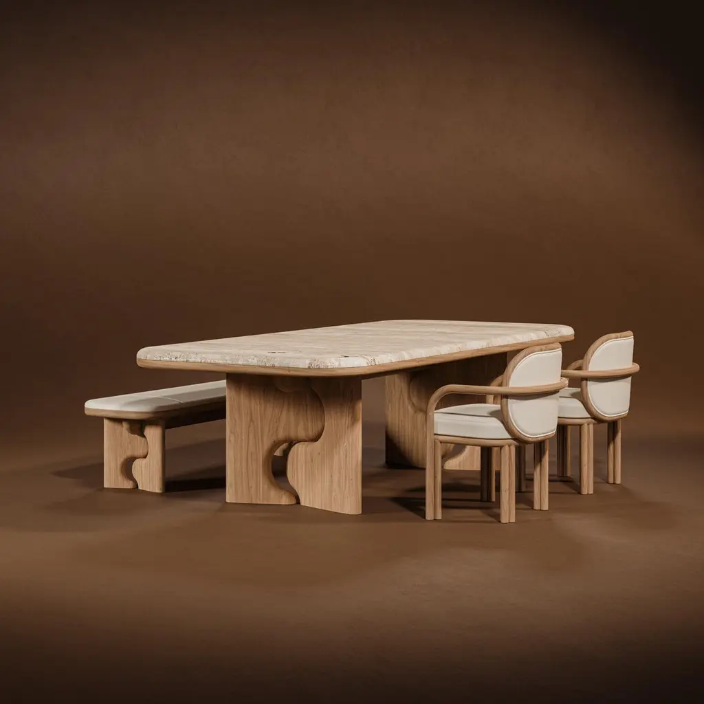 A prestigious member of one of the most exclusive Gentlemen's clubs in London, Henry Portman, whose legacy is intertwined with the architectural heritage of London's Portman Estate. This exquisite dining set was designed for timeless furniture enthusiasts. It comprises a wooden dining table with a stone top and two benches. The natural oak and travertine seamlessly blend, embodying a harmonious fusion of tradition and modernity.The Portman dining set reflects a dedication to quality craftsmanship and design innovation. It serves as a centerpiece for gatherings, fostering an environment where tradition meets contemporary style.Elevate the dining experience with the Portman Dining Ensemble.