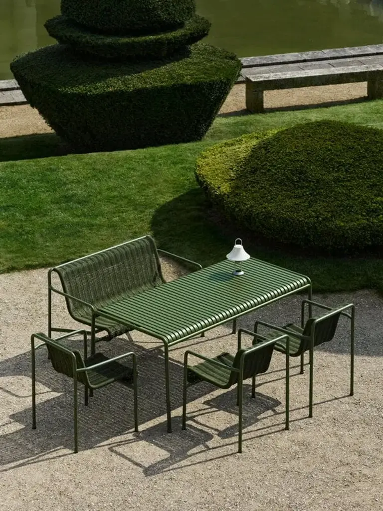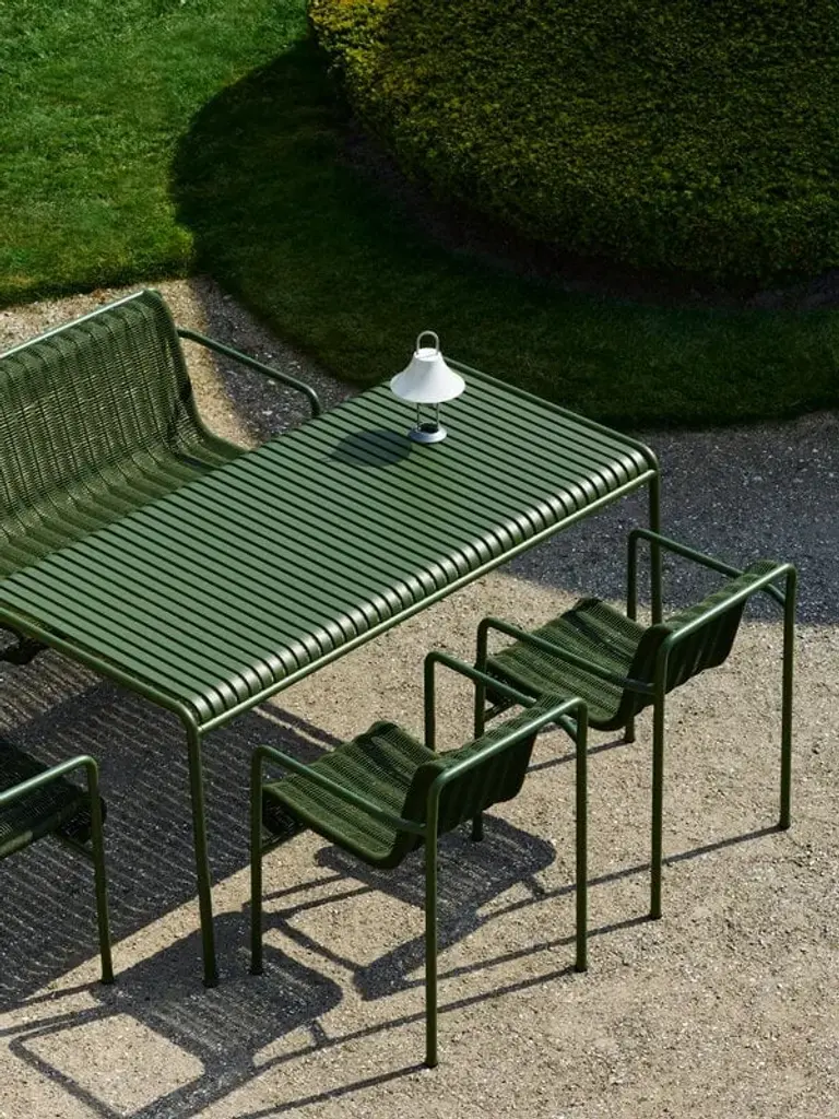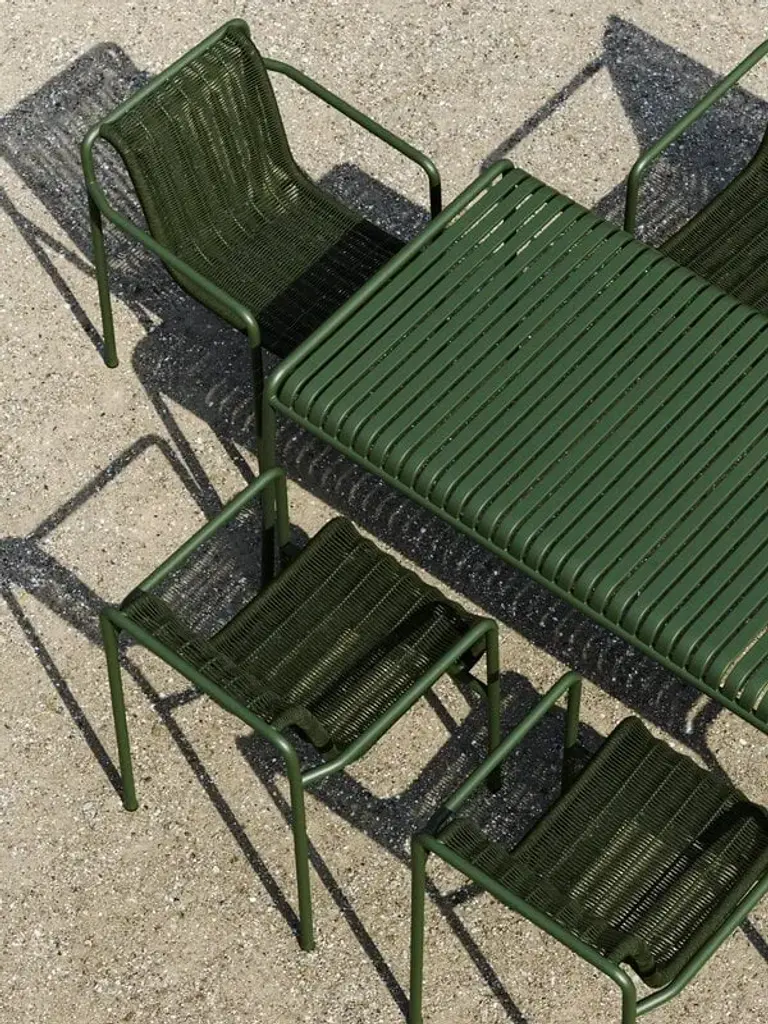 Palissade Cord is a powder coated steel armchair.United by its common principle of symmetrical geometry, the Palissade collection of outdoor furniture is designed to integrate effortlessly into both natural and urban settings. The Palissade Cord Dining Armchair shares the same design language as the original collection, combining a softer expression with Palissade’s visual simplicity and core strength. Recycled polyester cord is handwoven onto the chair’s powder coated steel frame in a matching tonal colour, creating a comfortable and durable seat. The chair’s versatile colour palette and timeless appeal make it ideal for using in a wide range of outside spaces, from cafés and restaurants to gardens, terraces, and balconies.The Palissade Cord collection brings a softer expression to Ronan and Erwan Bouroullec’s iconic Palissade outdoor range of furniture. Retaining the same design language as the original Palissade, recycled polyester cord is handwoven onto a powder coated steel frame, giving this series a more relaxed appearance. Comprising a dining armchair, dining bench, lounge chair, lounge sofa, and chaise longue in colours matching the existing Palissade variants, this collection is conducive for relaxing, eating, and socialising in a wide range of outside spaces.