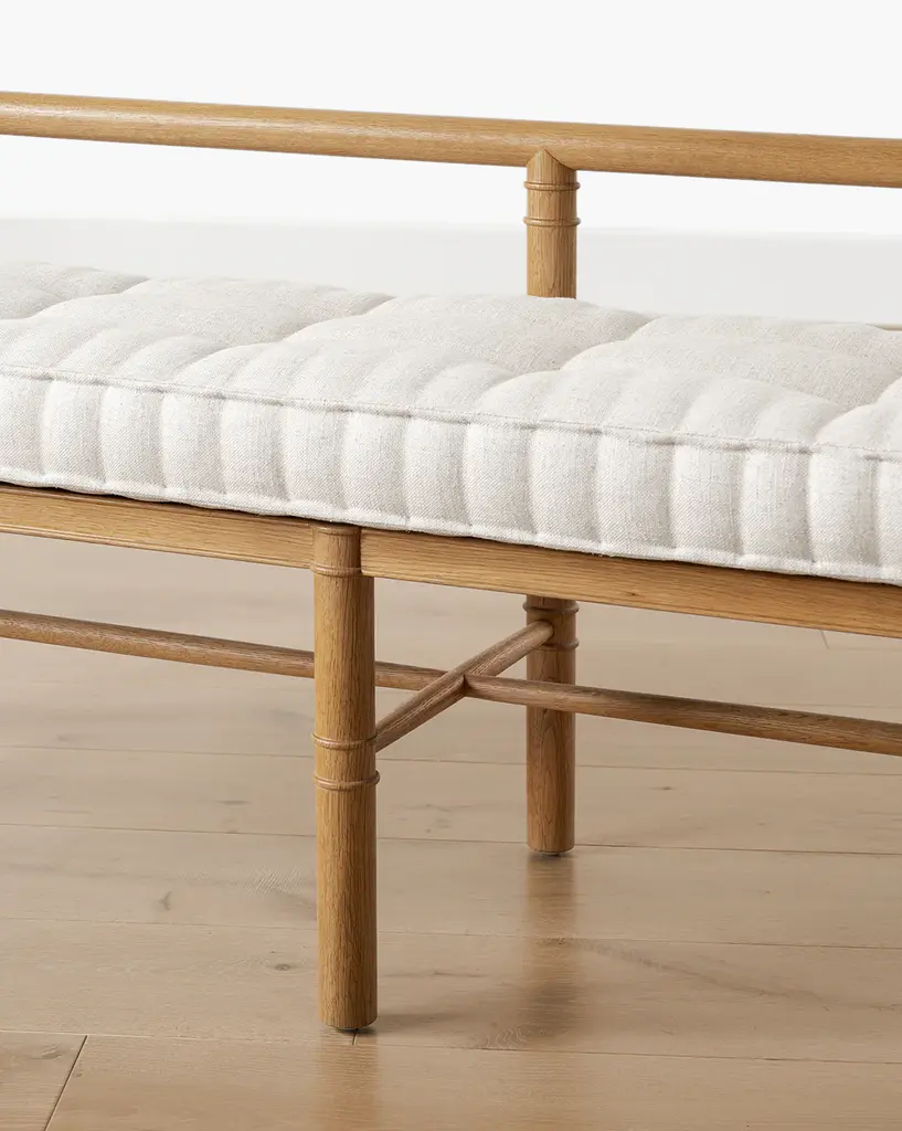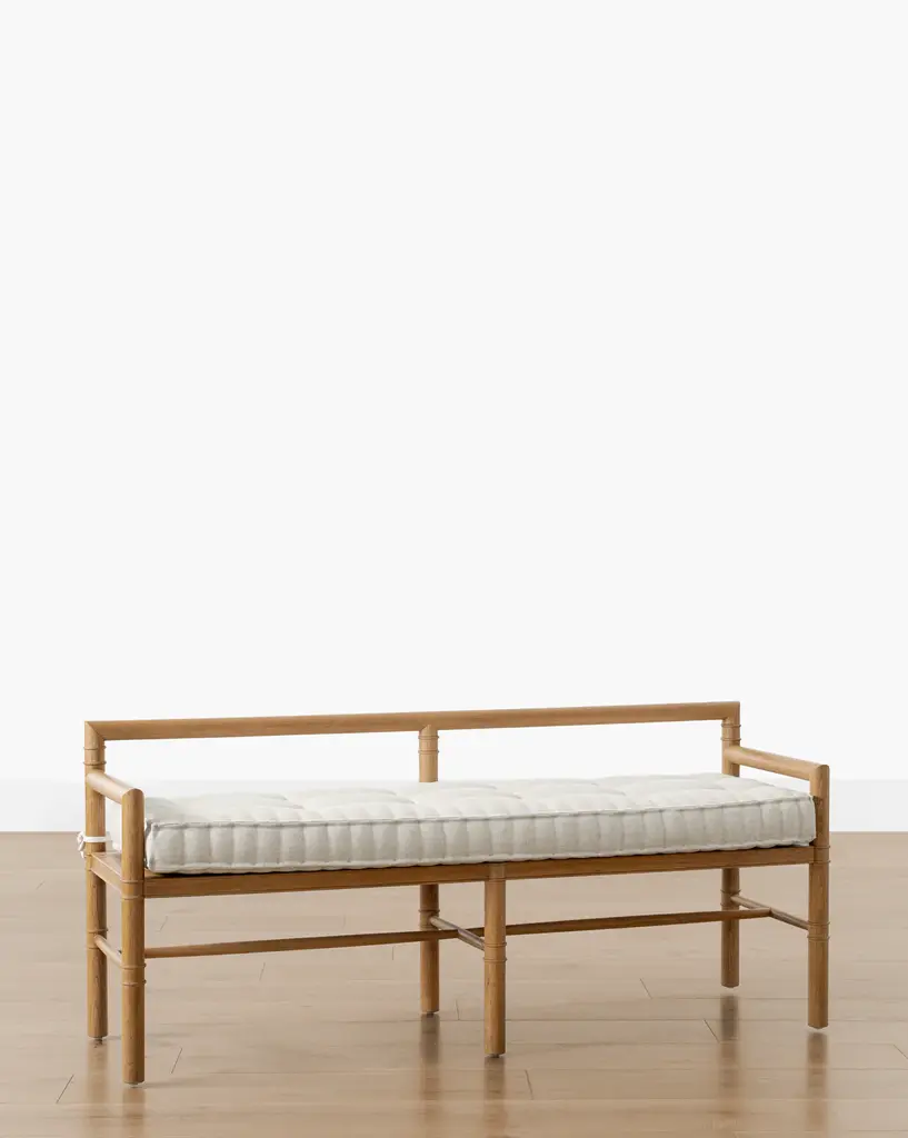 The Hindley Bench brings refined simplicity to any space with its clean lines, spindle-inspired frame, and comfortably upholstered cushion. Crafted from solid wood, its airy profile makes it versatile for an entryway, dining nook, or bedroom, blending timeless craftsmanship with effortless livability.