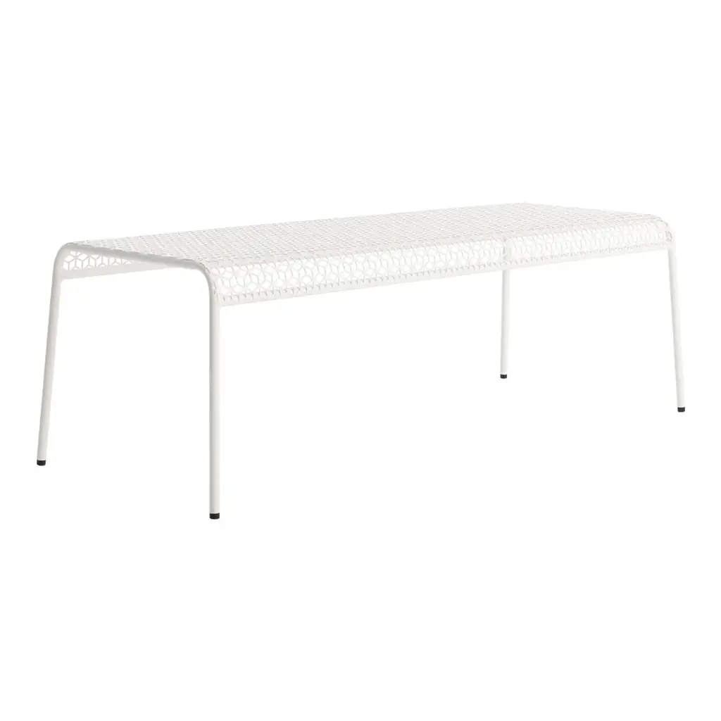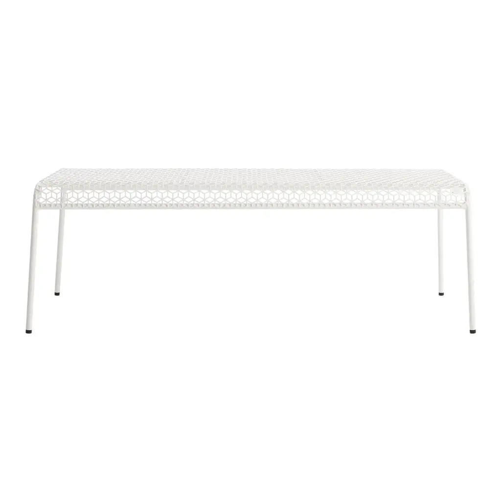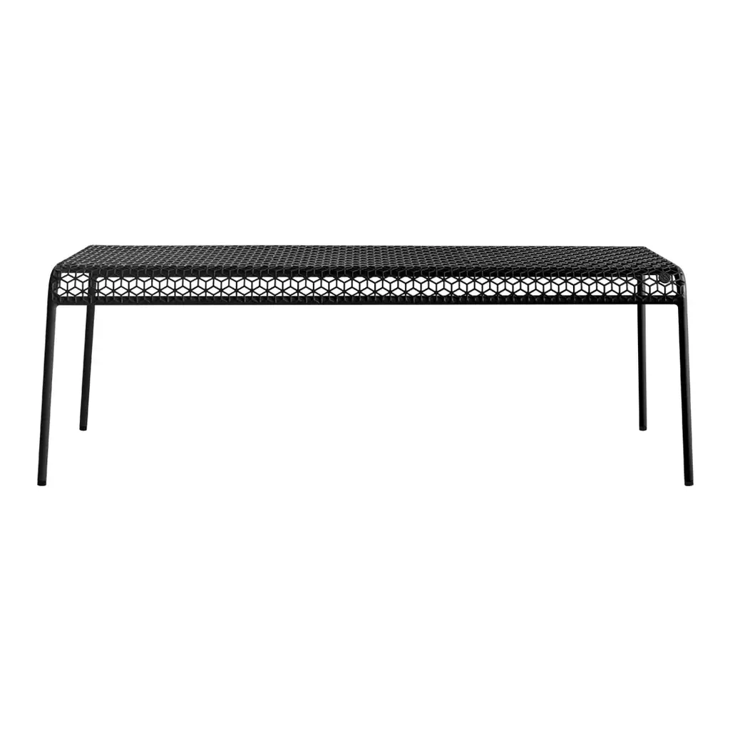 Streamlined proportions and industrial chic define the Hot Mesh Bench by Blu Dot, creating a versatile seating solution that enhances entryways, outdoor dining setups, or garden vignettes with contemporary flair. This innovative bench transforms the traditional seating form through Blu Dot's custom-developed perforated metal—delivering a distinctive design statement that performs equally well in interior and exterior environments.The bench's signature feature—its precision-punched steel surface—creates a captivating geometric pattern that becomes both visual texture and functional advantage. These carefully calculated perforations reduce visual weight while allowing for quick water drainage, air circulation, and temperature moderation—practical benefits that complement the bench's striking appearance. The minimalist tubular frame maintains clean lines and structural integrity while allowing for the efficient stackability that makes this piece particularly valuable for spaces with seasonal fluctuations or storage limitations.Durability considerations inform every aspect of the design, with powder-coated steel enhanced by zinc primer to resist corrosion in challenging environments. Protective plastic glides prevent surface scratching on delicate flooring, while the bench's substantial yet manageable scale makes it ideal for flexible arrangement within diverse spaces. Arriving fully assembled, the Hot Mesh Bench delivers immediate design impact without complex setup requirements.For optimal longevity, storing in dry locations during extended periods of non-use—particularly in coastal or harsh urban settings—will help maintain the finish's integrity. Whether standing alone as a sculptural accent or coordinated with other pieces from the Hot Mesh collection, this bench exemplifies Blu Dot's commitment to accessible design that balances bold aesthetics with everyday functionality. The result is a versatile seating solution that enhances both casual gatherings and designed environments with its crisp form and easy-breezy vibe.