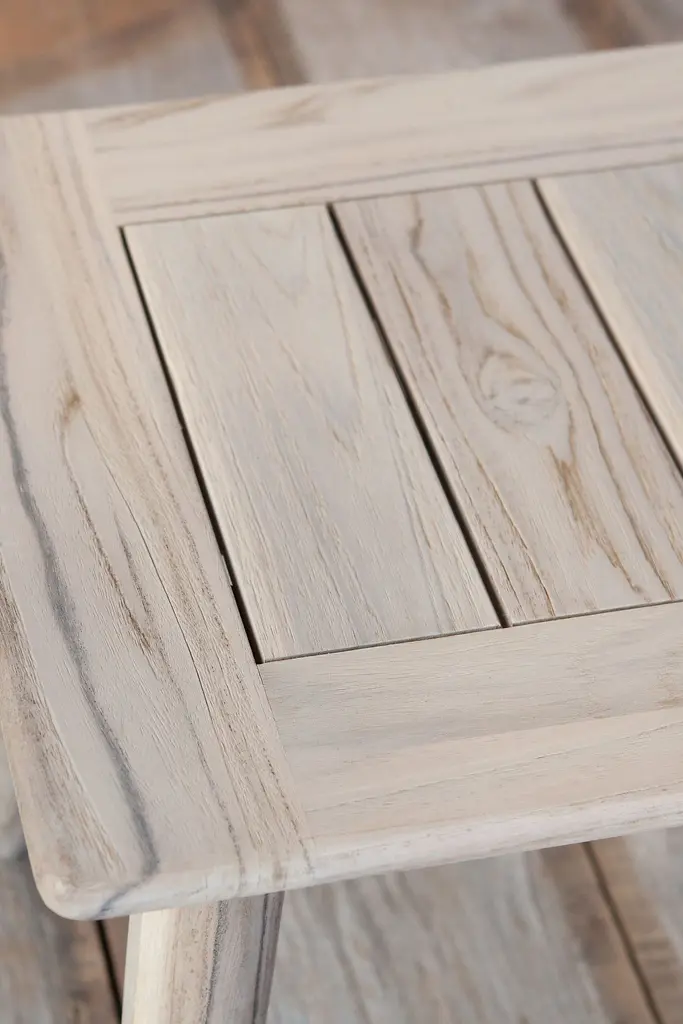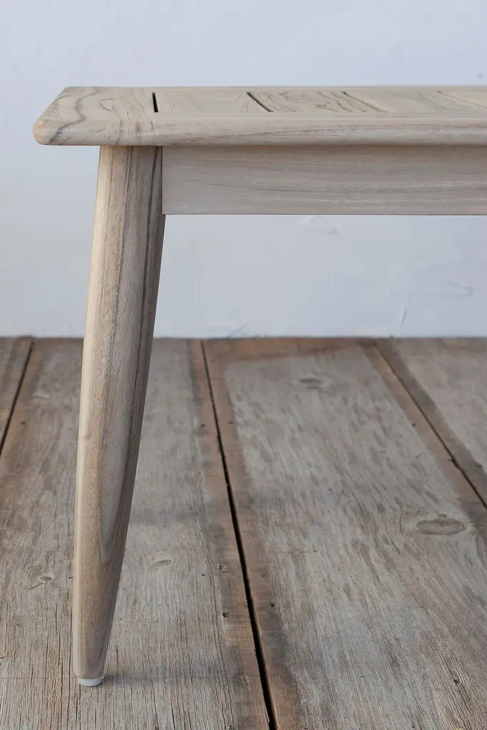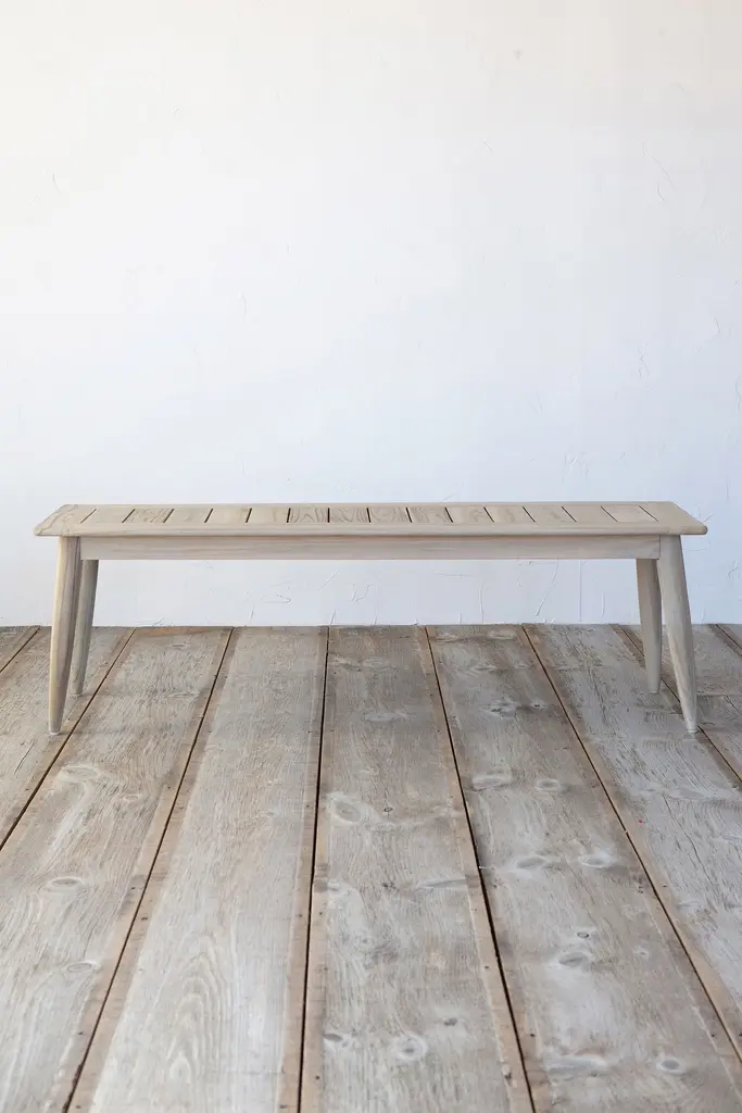Sleek and simple lines make this bench a standout choice for al fresco dining, each one crafted from natural teak and treated with an Instant Gray finish for a weathered appearance and years of outdoor durability.