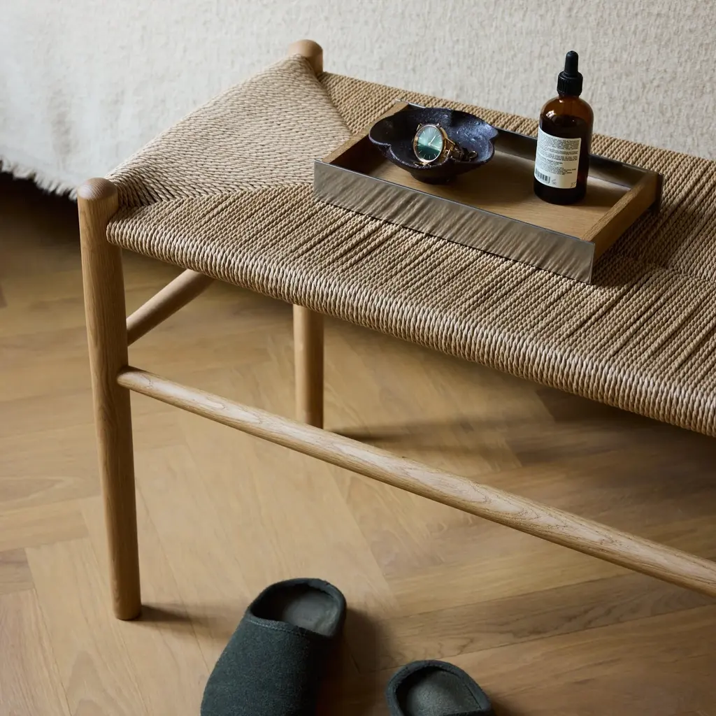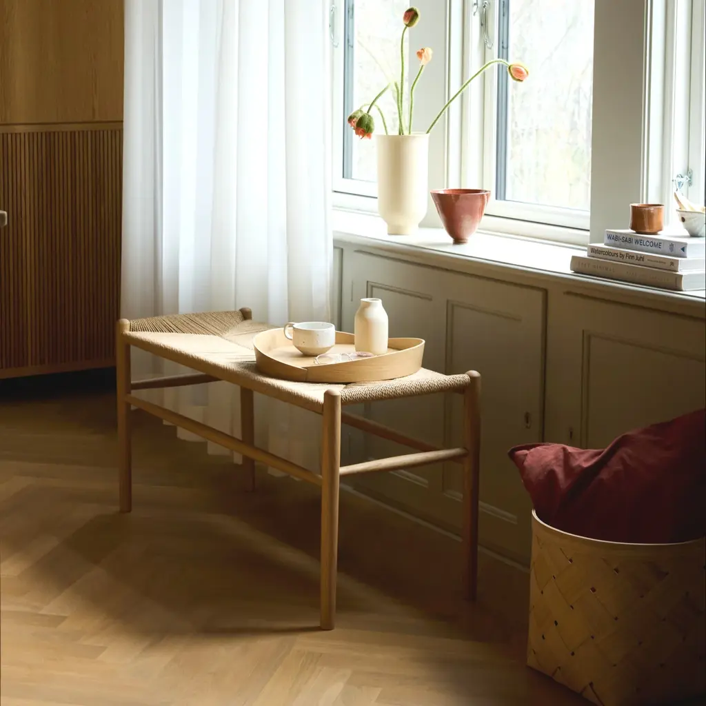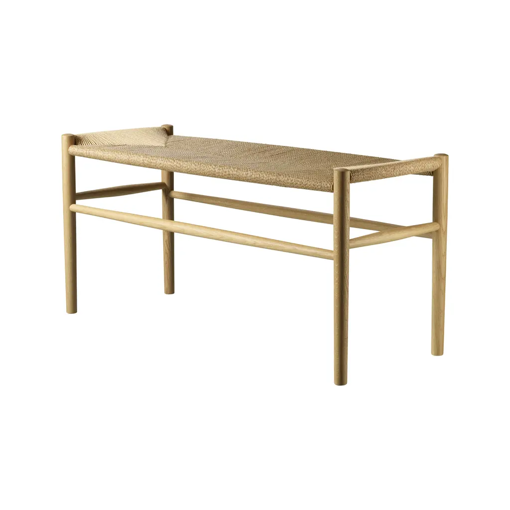 The J163 Piano Bench by Jørgen Bækmark for FDB Mobler has been thoughtfully updated to suit modern proportions, featuring a slightly taller frame crafted in black-lacquered or natural oak with a classic paper cord seat. Originally designed for piano use, its timeless woven design now lends itself beautifully to dining rooms, entryways, or any space needing a refined, compact seat. This bench celebrates Bækmark’s legacy with a perfect blend of characteristic craftsmanship and enduring modern elegance. Highlights