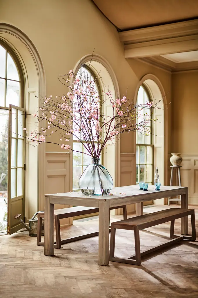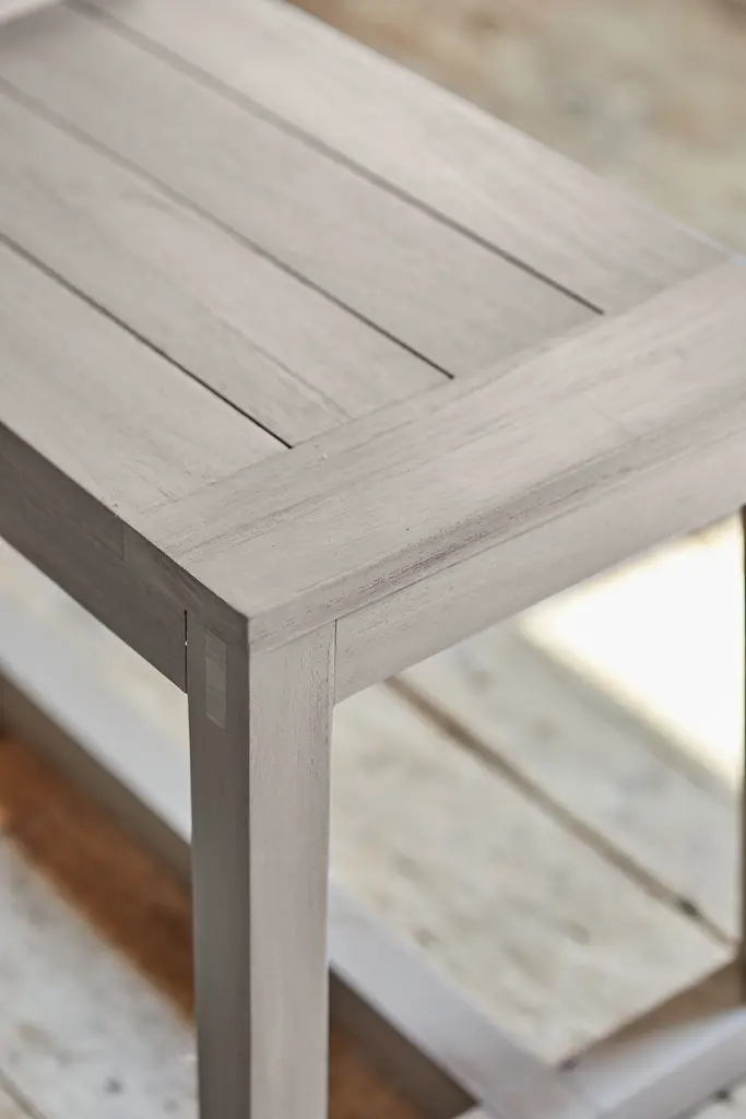 Casual yet refined, with a modern silhouette defined by clean lines and a slatted top, this dining bench brings comfort and convenience to the table. Each bench is treated for outdoor use with our Instant Gray + Teak Shield finish, which gives the wood a silvery, aged patina and prevents wear and tear from sun, heat, or rain.