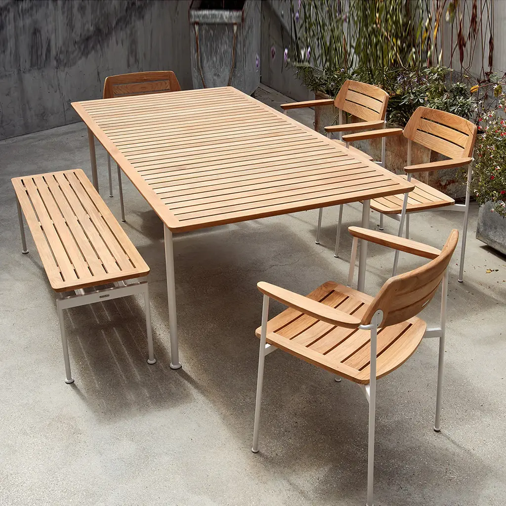 Introducing the Layout Backless Bench, part of the new alfresco dining collection from Barlow Tyrie. This stunning dining set is known for its extraordinary craftsmanship and well-constructed design. Whether you’re looking to add a touch of style to your outdoor living space or just need some extra seating at mealtime, Barlow Tyrie has you covered.Highlights