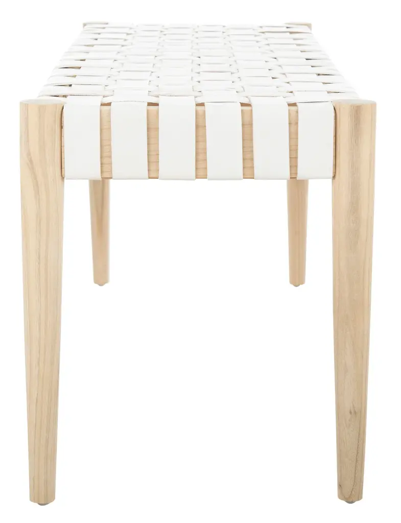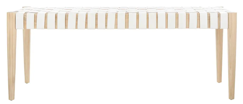 Savor time around the dining table with family and friends on this contemporary leather weave bench. A blend of style and substance, it's durable white leather and natural wood construction ensures everyone is comfortable from appetizers to dessert. Wood is a natural material with variations of color shade, configuration, streaks, and grain structure. Each individual piece of furniture has characteristic markings that will differ from photo and showroom Samples. Regular attention and maintenance of fine furniture can ensure it's beauty for years to come. Always use felt pads under all articles to prevent discoloration or softening of the lacquer. Plastic and rubber bases on items can discolor wood.
