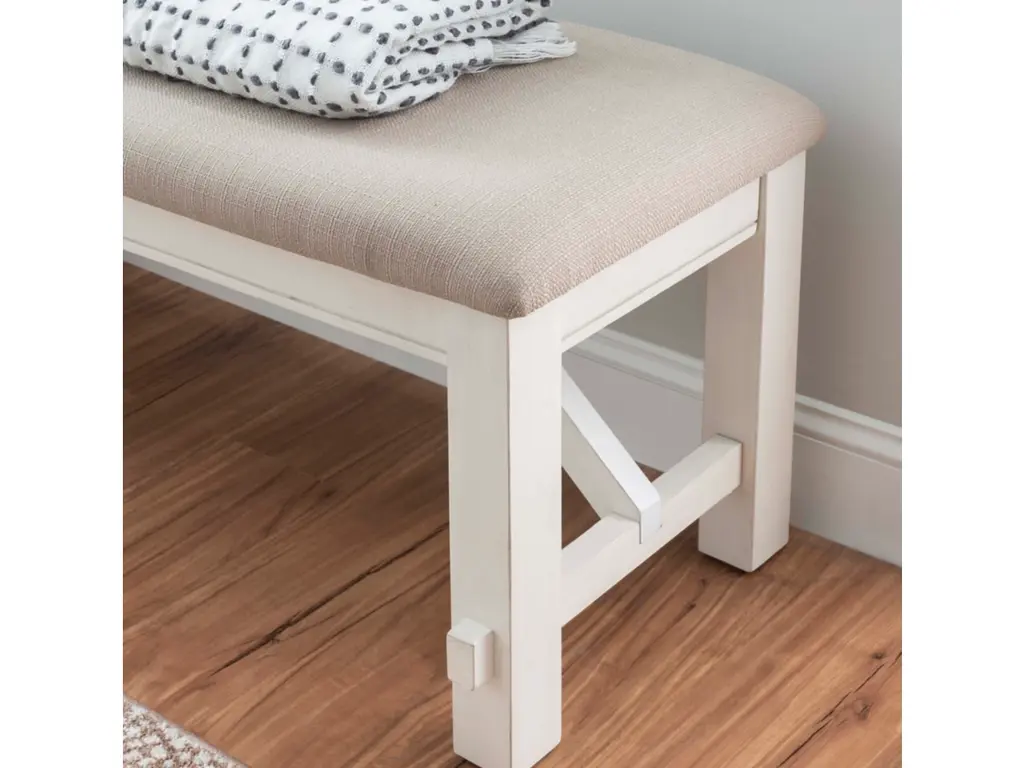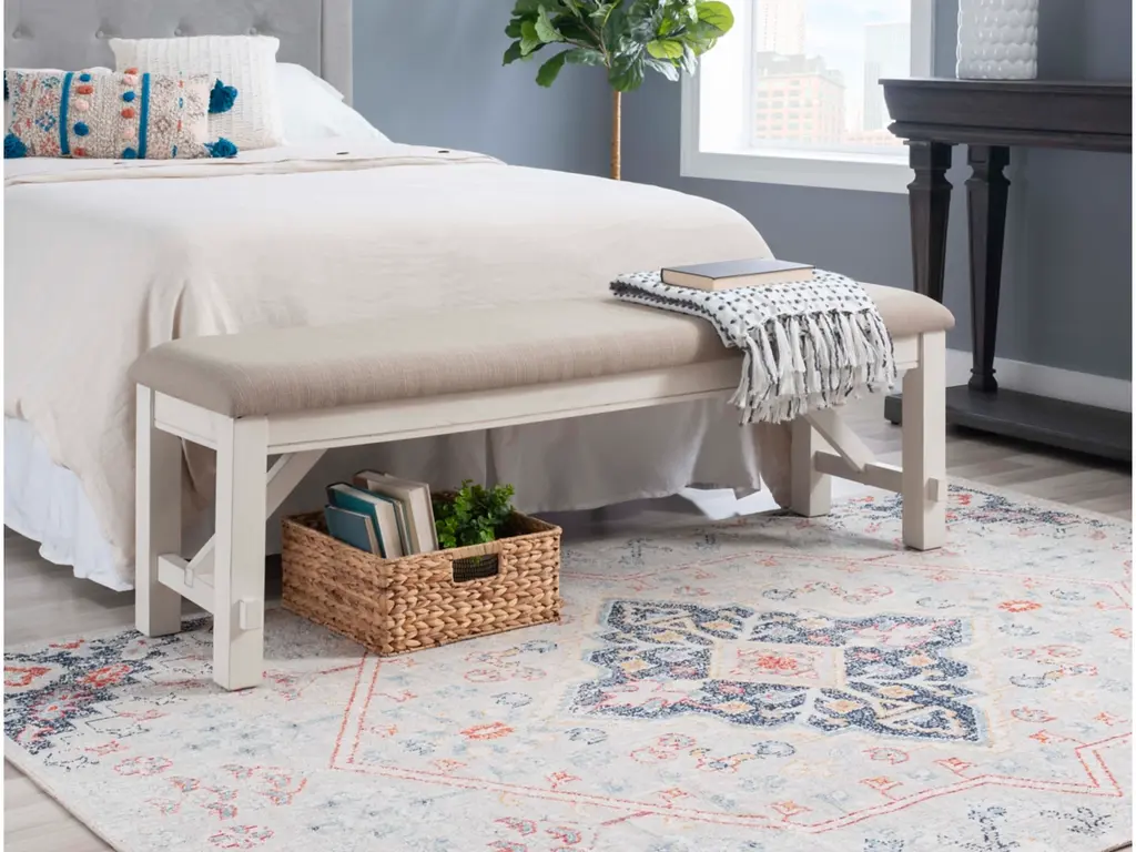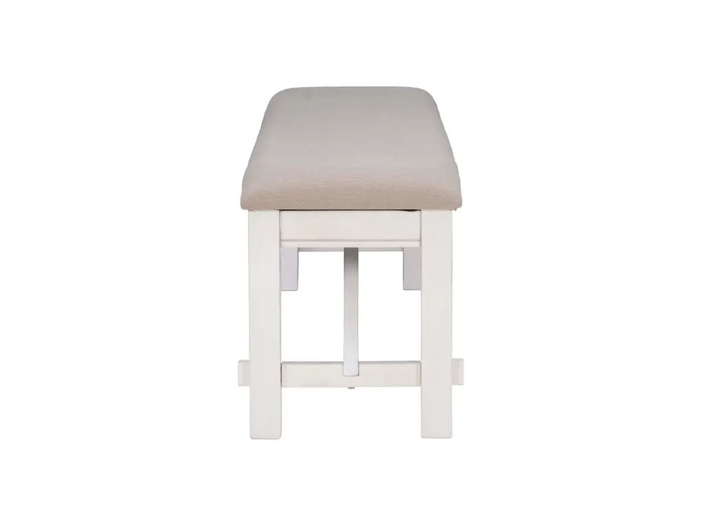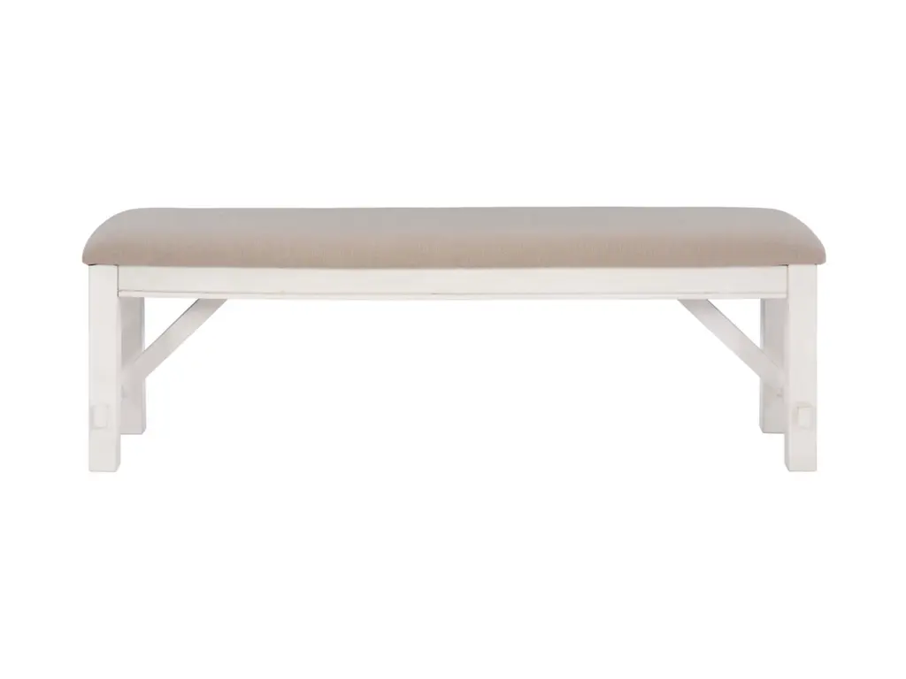 Outfit any room with this perfect bench. It features traditional straight lines and a simplistic style. A solid tan fabric in a basketweave construction covers a plush, comfortable seat. It has a durable rubberwood, MDF and Ash veneer construction in a smokey white finish, which delivers an updated farmhouse vibe. Some assembly required.