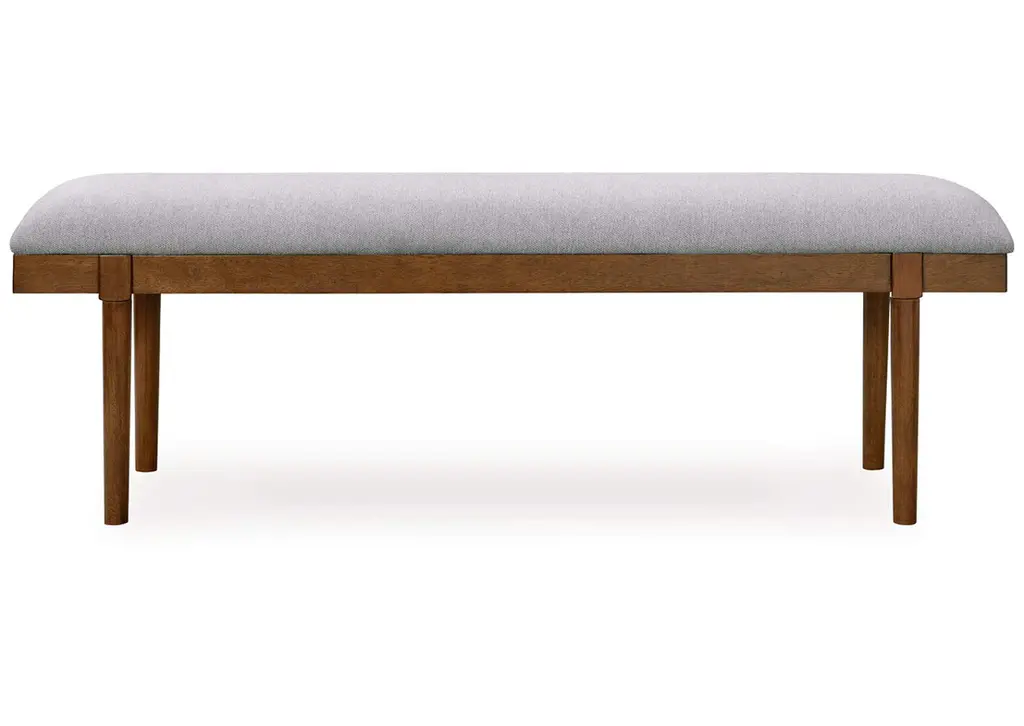 A refreshed take on retro aesthetics. The Lyncott upholstered bench adds an air of simplicity to your dining space, capturing the architectural language of mid-century stylings. Its seat invites the eye with a soft-edged silhouette and neutral gray cushion. A casual, yet timeless, finish on the frame creates visual contrast to complete this study in form and function. Weight 41.000 lbs. (18.45kgs.)