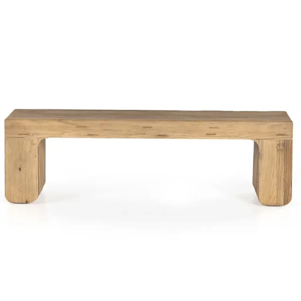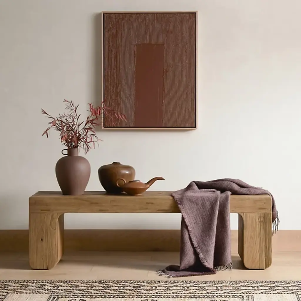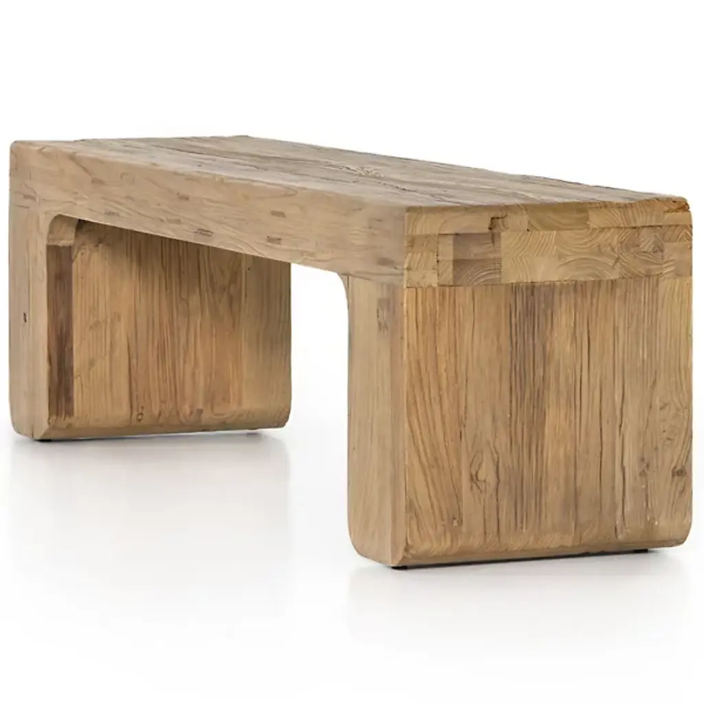 The Merrick Accent Bench from Four Hands unites reclaimed elm and poplar plywood in a study of simplified forms. The substantial legs anchor the piece while maintaining visual balance with the seat. The natural characteristics of the reclaimed elm create subtle variations across the surface, each mark telling part of the wood's history. The bench's proportions allow it to serve multiple functions - from entryway seating to dining table companions.