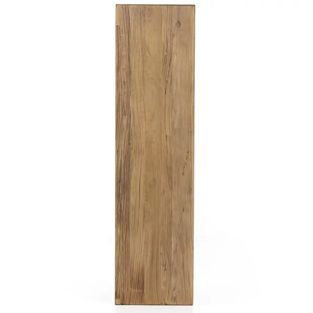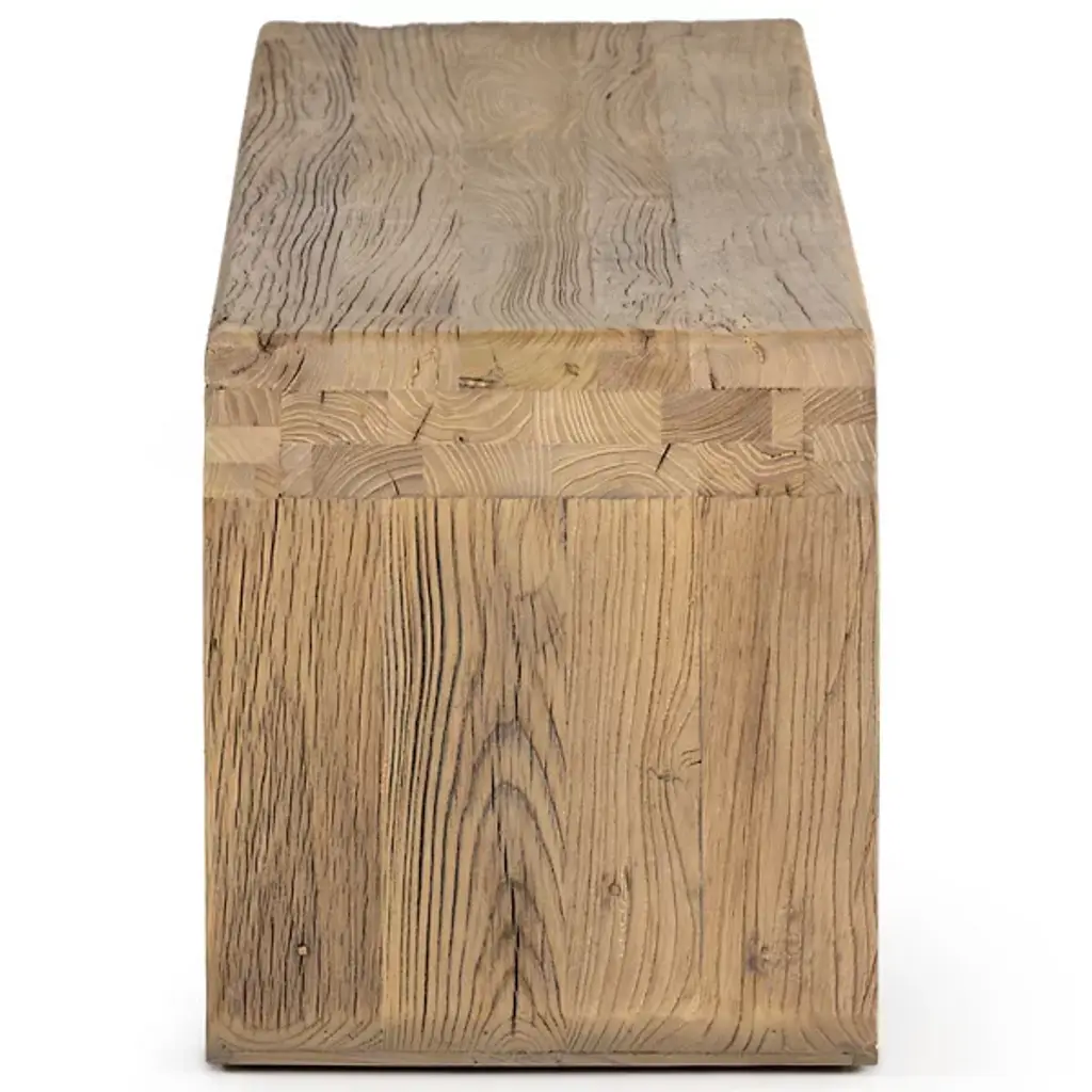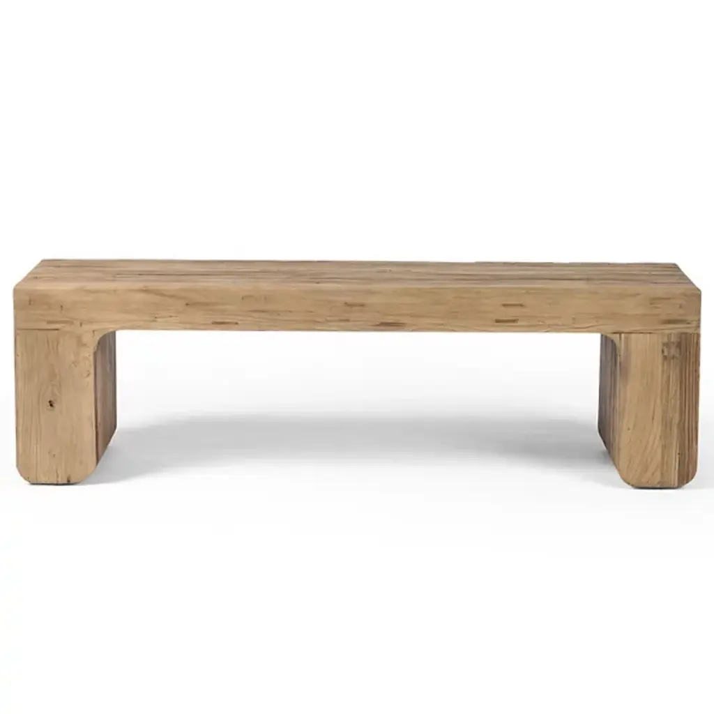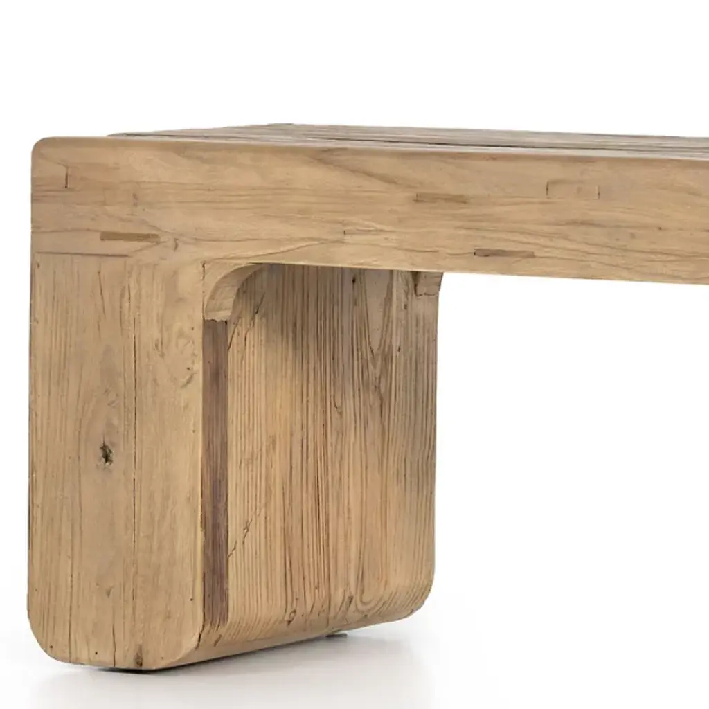 The Merrick Accent Bench from Four Hands unites reclaimed elm and poplar plywood in a study of simplified forms. The substantial legs anchor the piece while maintaining visual balance with the seat. The natural characteristics of the reclaimed elm create subtle variations across the surface, each mark telling part of the wood's history. The bench's proportions allow it to serve multiple functions - from entryway seating to dining table companions.