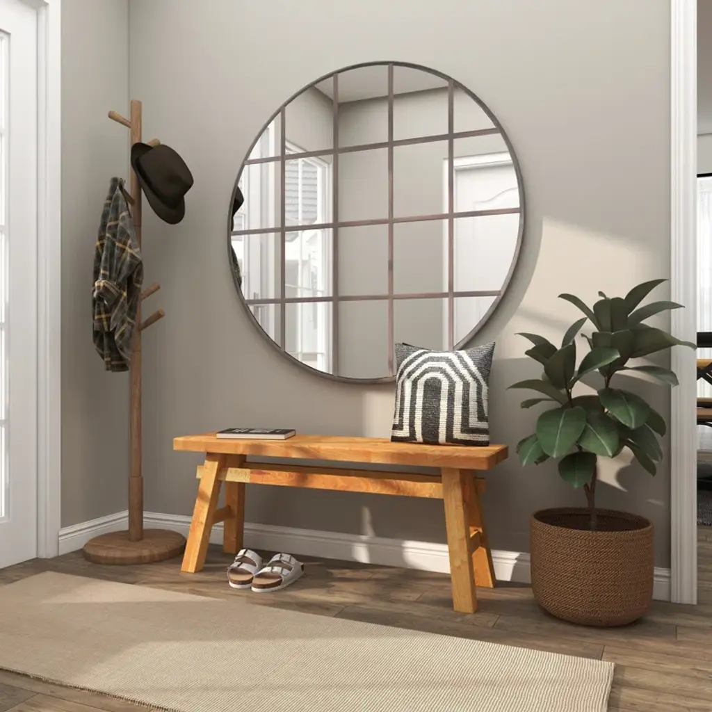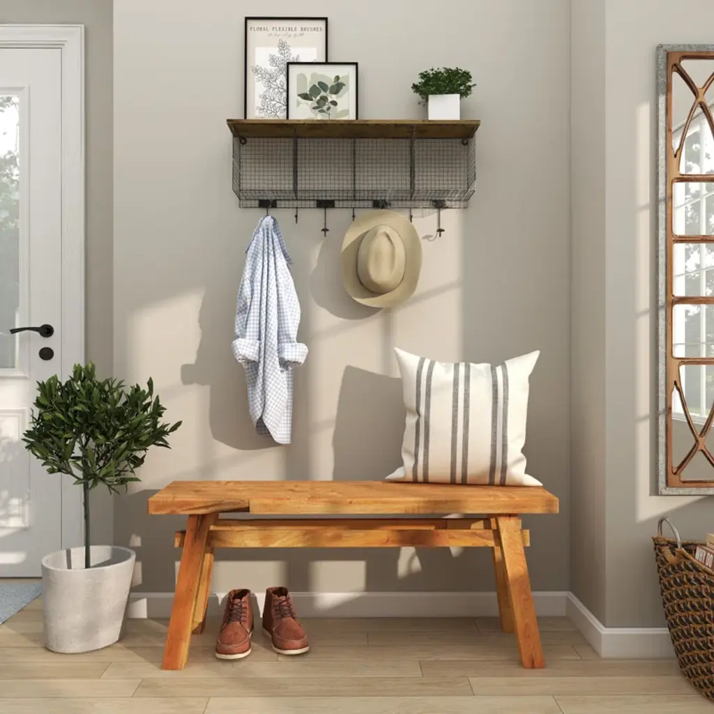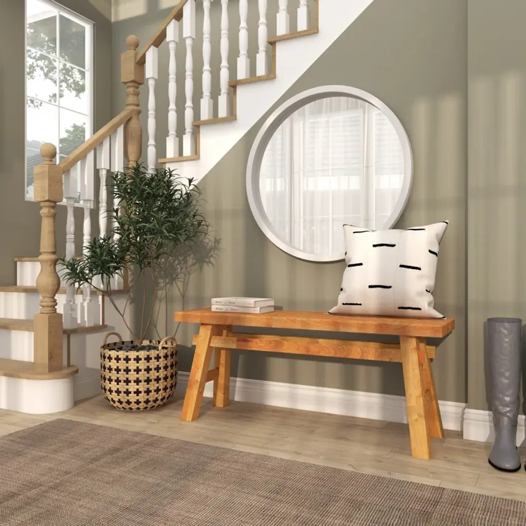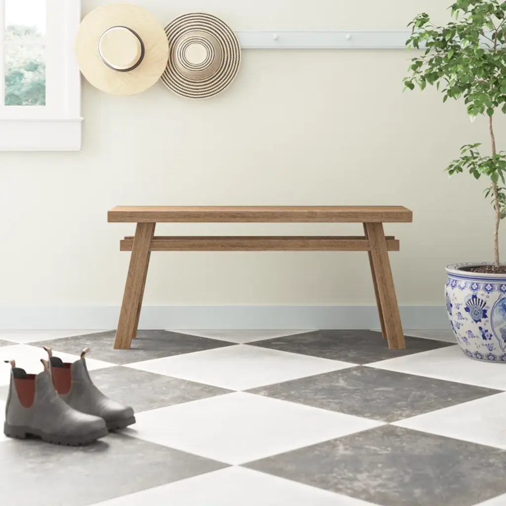 This mahogany wood dining bench is a warm and inviting addition to your dining space, seating two comfortably. Showcasing a rich, natural wood grain with purposeful wood scoring and rub-through distressing, it adds a touch of rustic elegance to your home. The solid wood squared legs provide a stable base, while the seating capacity of 400 lbs ensures it's ready for those memorable family gatherings. Enjoy the timeless appeal and casual tone this bench brings to your dining experience.