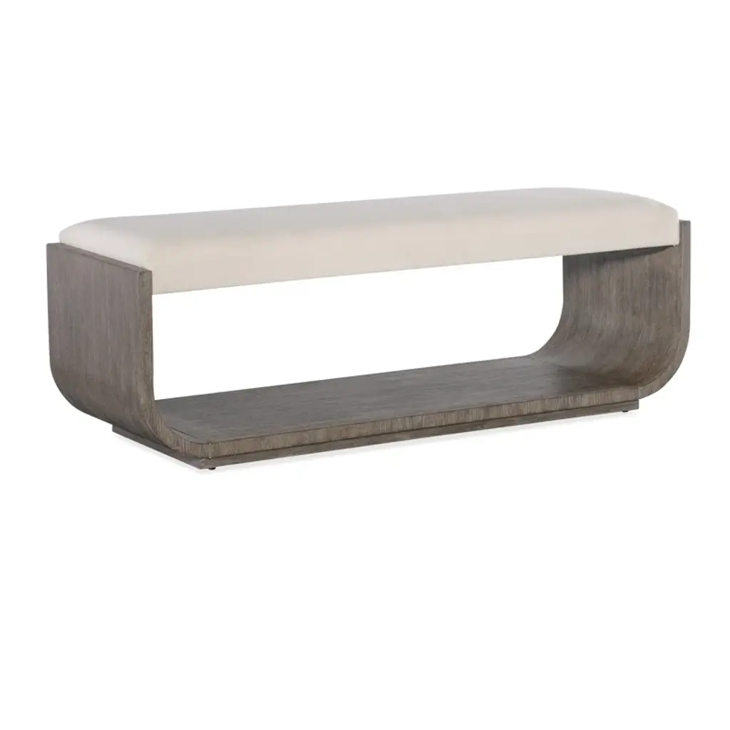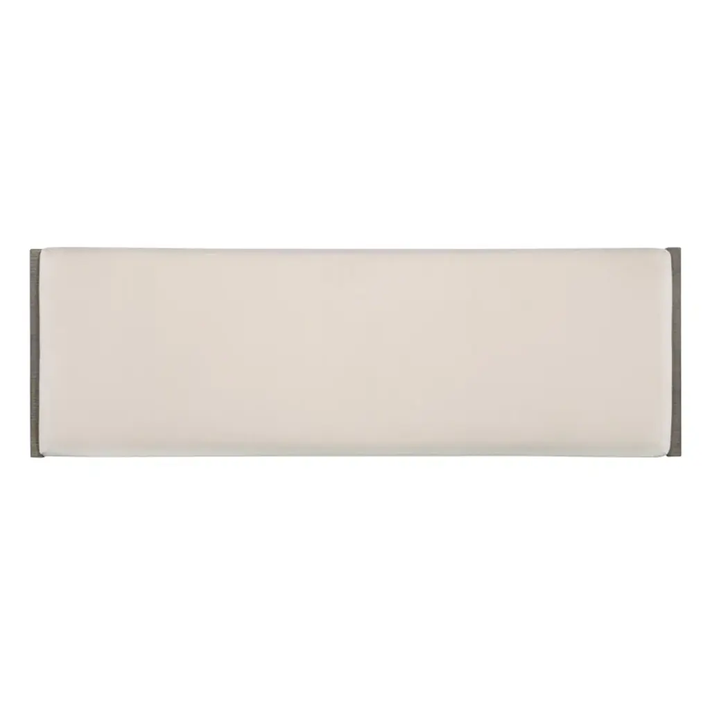 Serene, soft, and stylish with a cloud-like floating appearance, the monochromatic Modern Mood bench is upholstered in a cozy boucle fabric with wire-brush detailing. The base is crafted of quartered oak veneers. Unbound by geographical design, Modern Mood presents itself as an evolution of design choices, spanning a variety of decades and design movements, while maintaining an unmistakably modern aesthetic that transcends time. The 90-piece collection includes a bedroom, dining room, home office, accent, and occasional items characterized by substantive forms with soft architectural details. Elevated materials and brushed metal accents in a warm pewter finish are evident throughout the collection, including metal banding and edging as well as marble and glass accents.