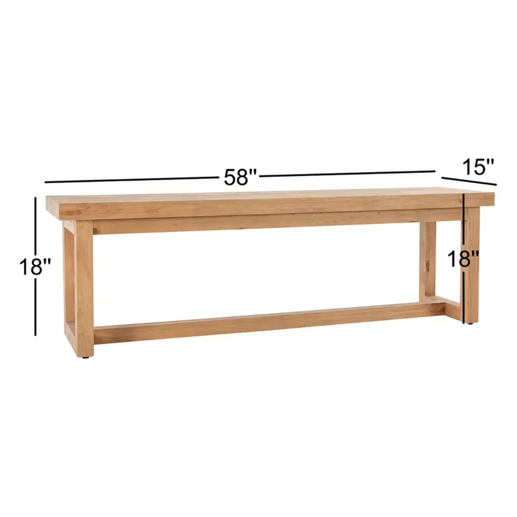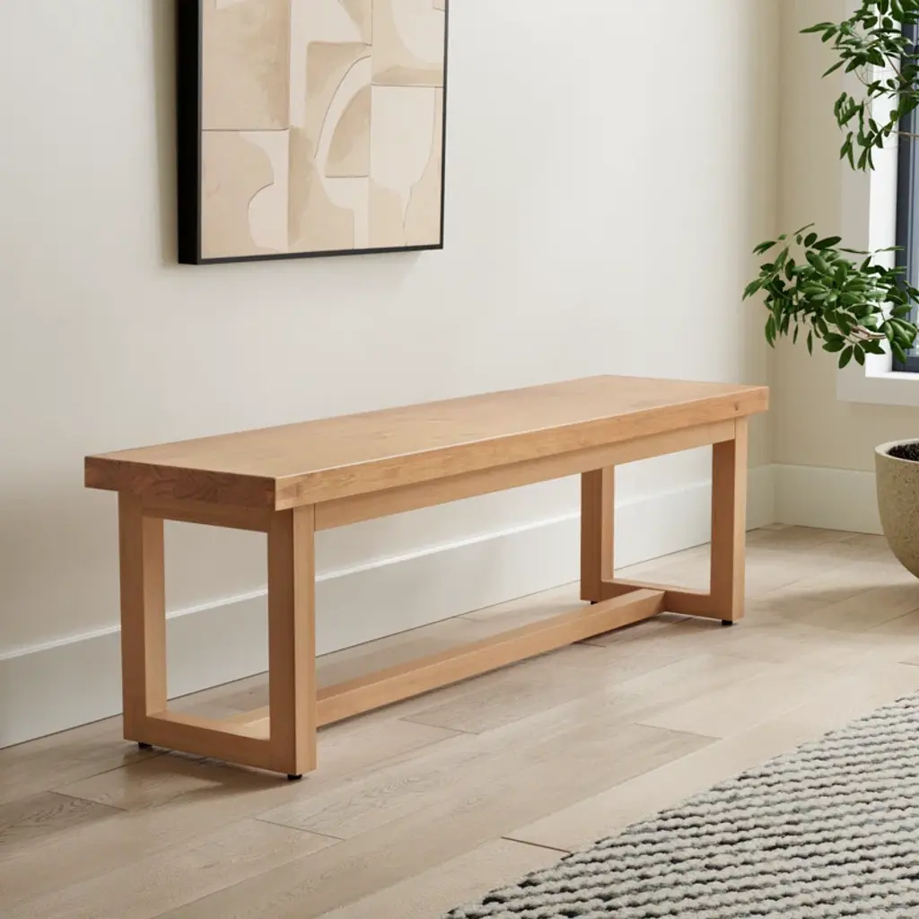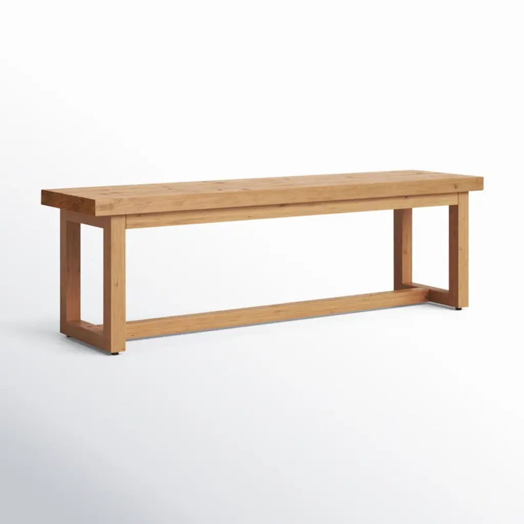 This dining bench features clean lines, natural wood grains, and a modern sled leg design. Made from kiln-dried solid pine, its unique character comes from natural variations like knots and organic grain variation. Offering seating for two, its compact size fits any room.