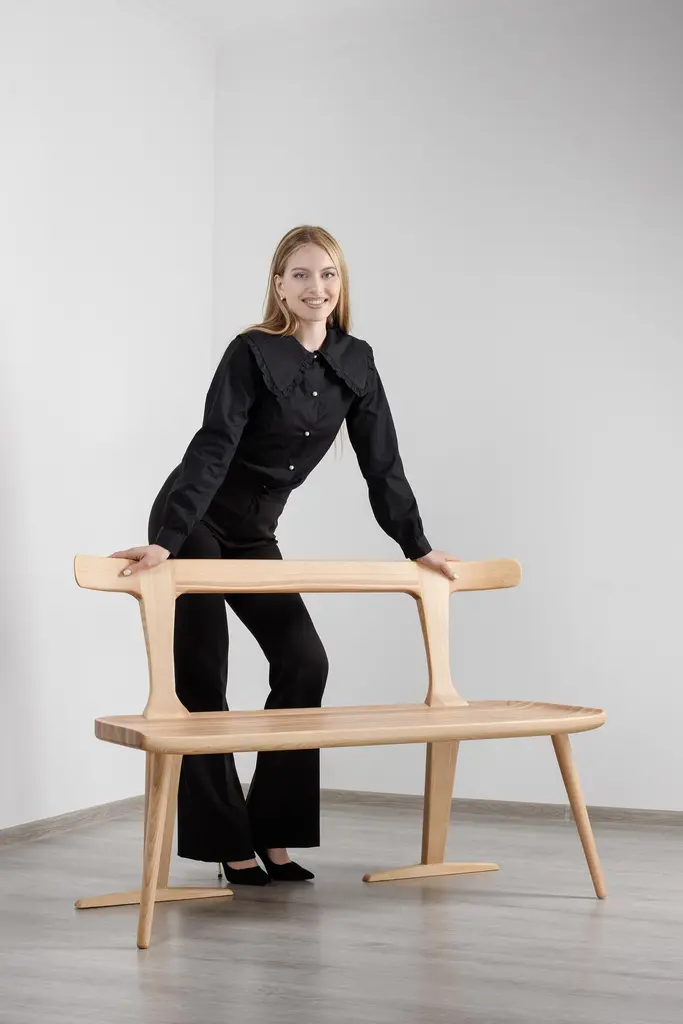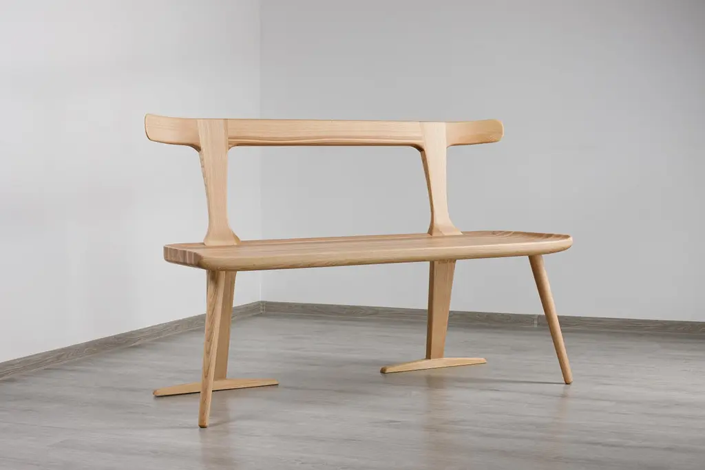 The Eola bench provides a multi-use bench that can be easily placed in the kitchen, dining room, den, lounge or other space. With a double backing and forward angled legs, this Mid-Century Modern piece offers a uniqueness that otherwise cannot be duplicated.Dimensions47"W × 17"D × 32"HSeat Width: 47 inchSeat Height: 18 inchSeat Depth: 17 inchMaterialNatural solid ash wood.