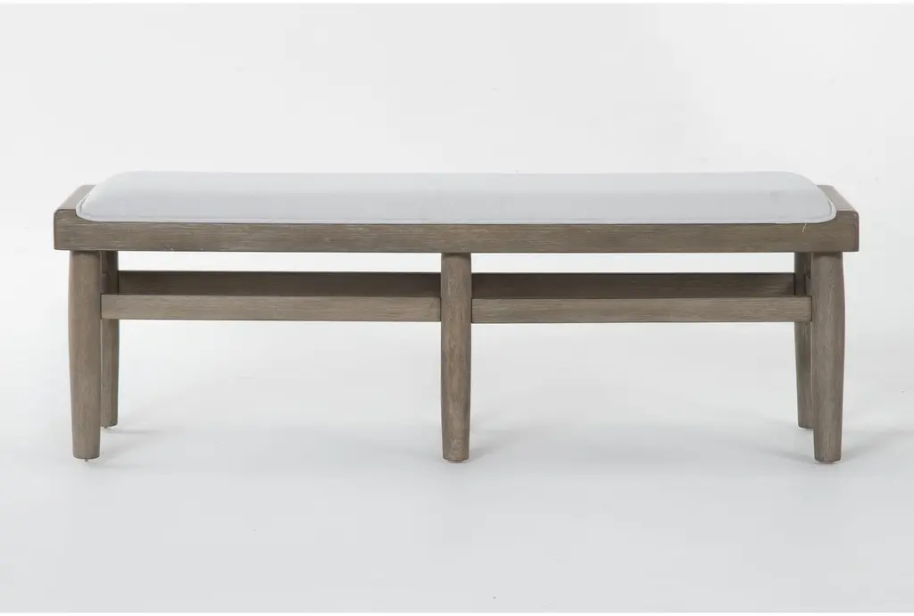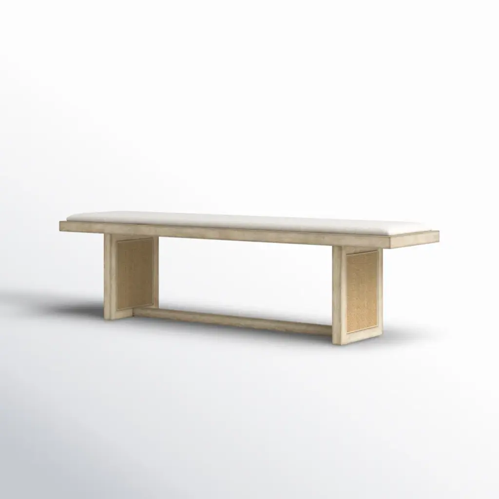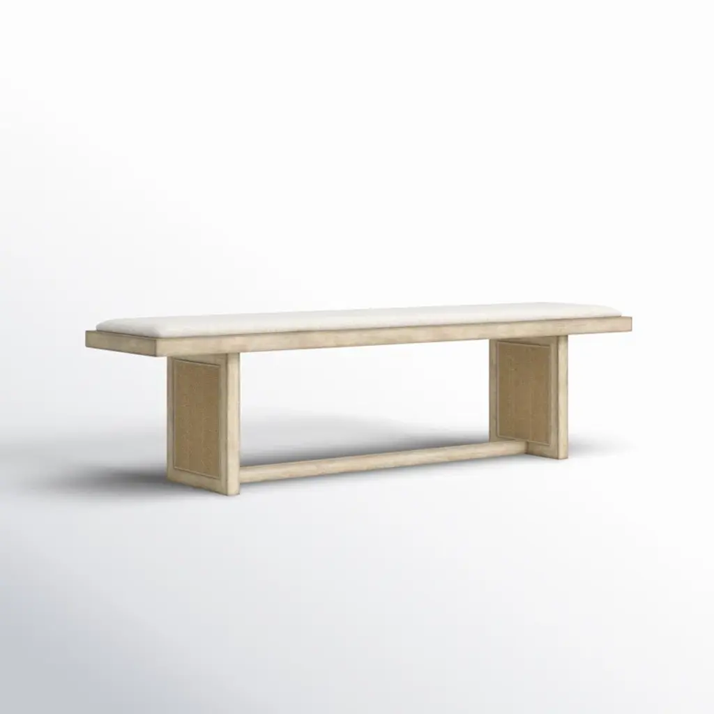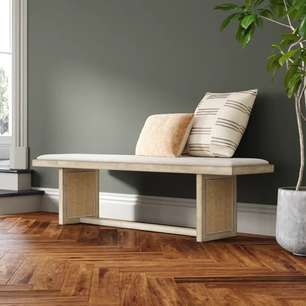 Talk about texture. Topped with cream-colored high-performance fabric for clever comfort, a dining bench of black-finished solid mango features side panels of natural cane for a trendy touch.