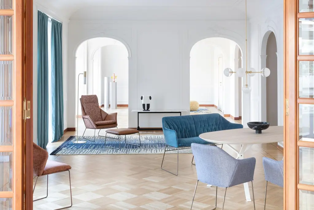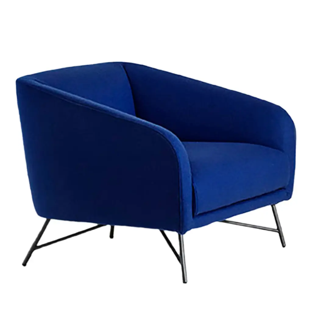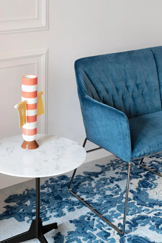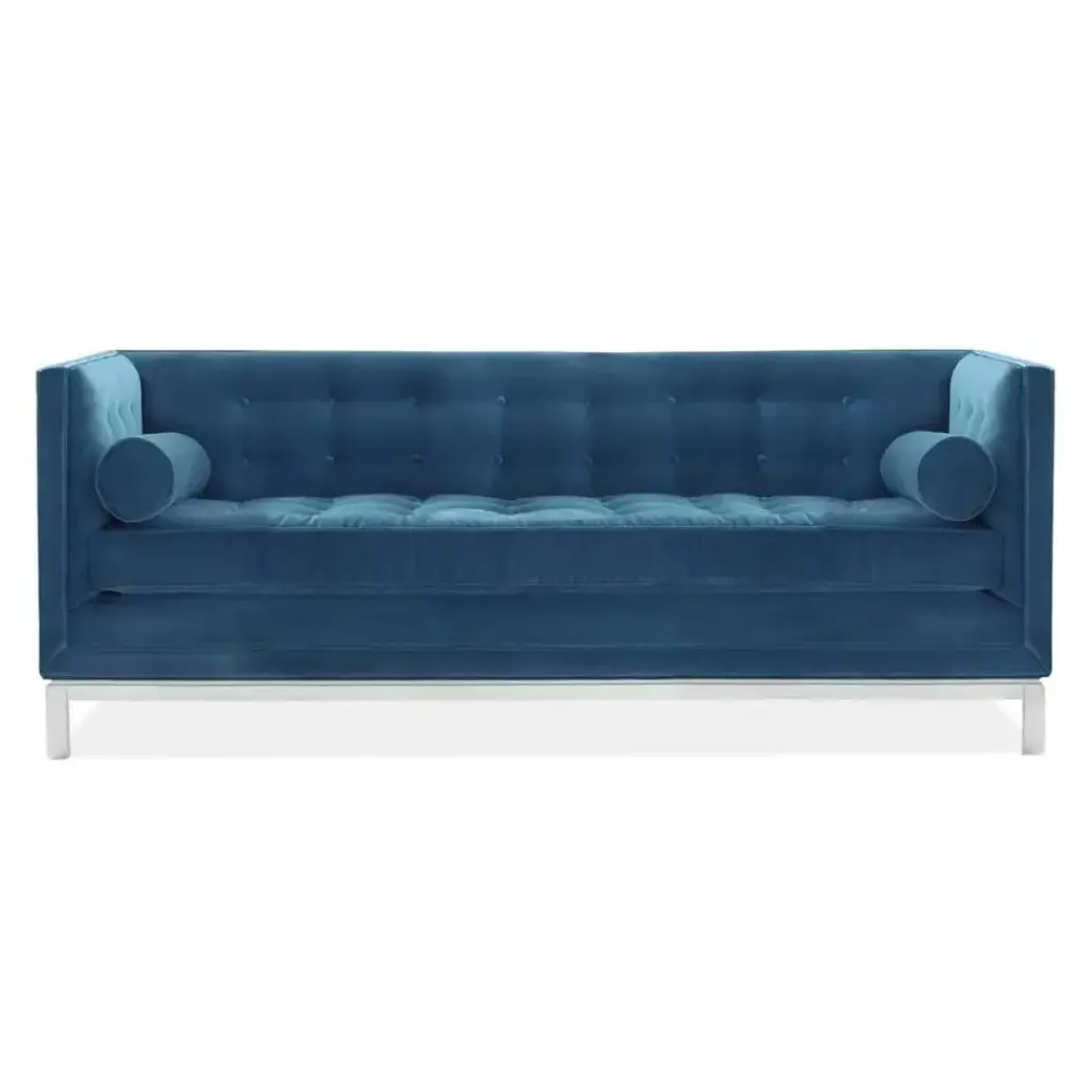New York Velvet Blue Upholstered Armrest Bench With Chrome Legs, Sergio Bicego