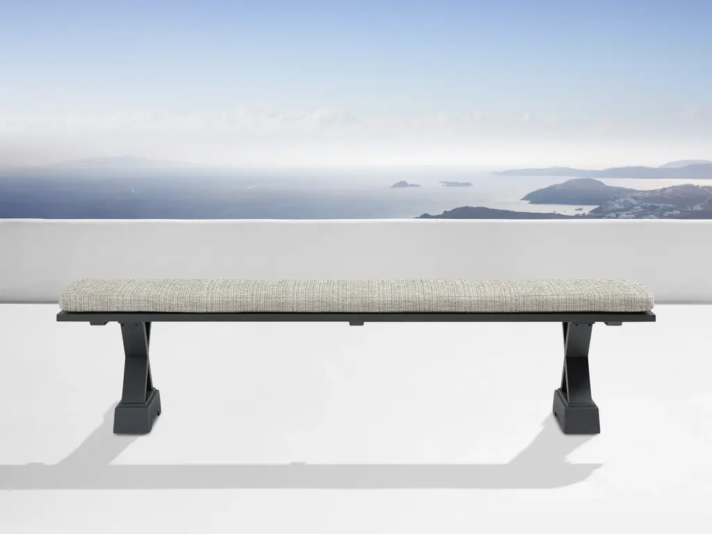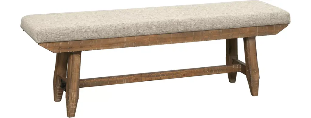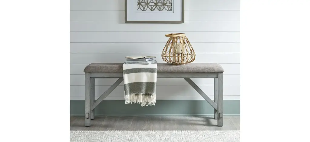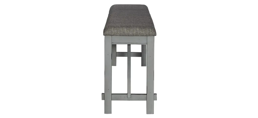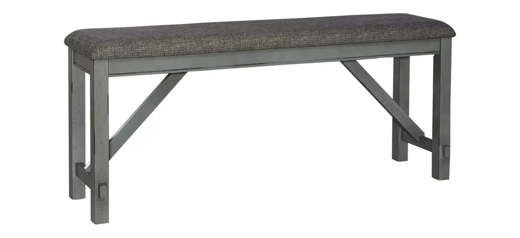 Sit in comfort and style with the Newport Counter Height Dining Bench. Crafted with excellence using rubberwood solids, this bench features a Smokey Grey finish and an upholstered seat in Grey Linen fabric. The square block legs feature wooden peg accents for a craftsman's feel and nylon chair glides to protect your flooring. The center trestle on this bench ensures stability. Feel comfortable and elegant at the same time with the Newport counter height dining bench.