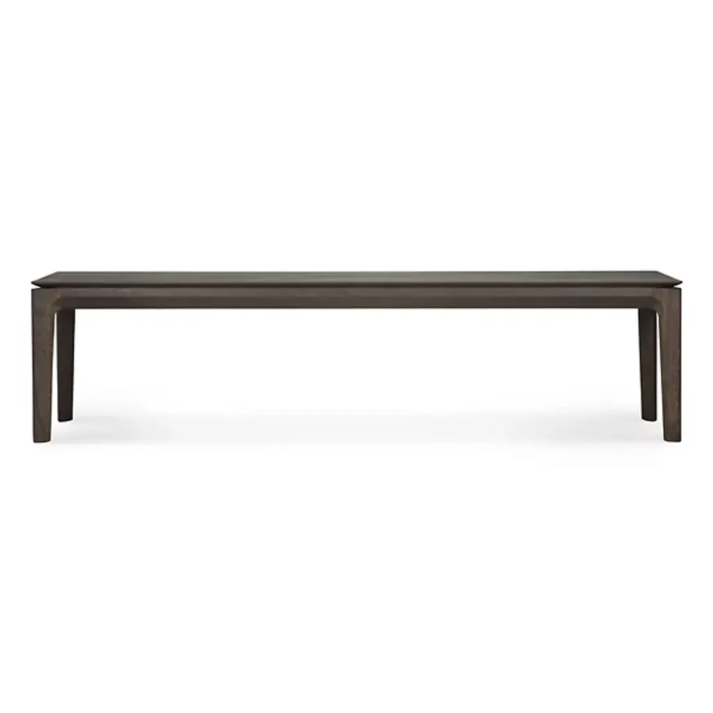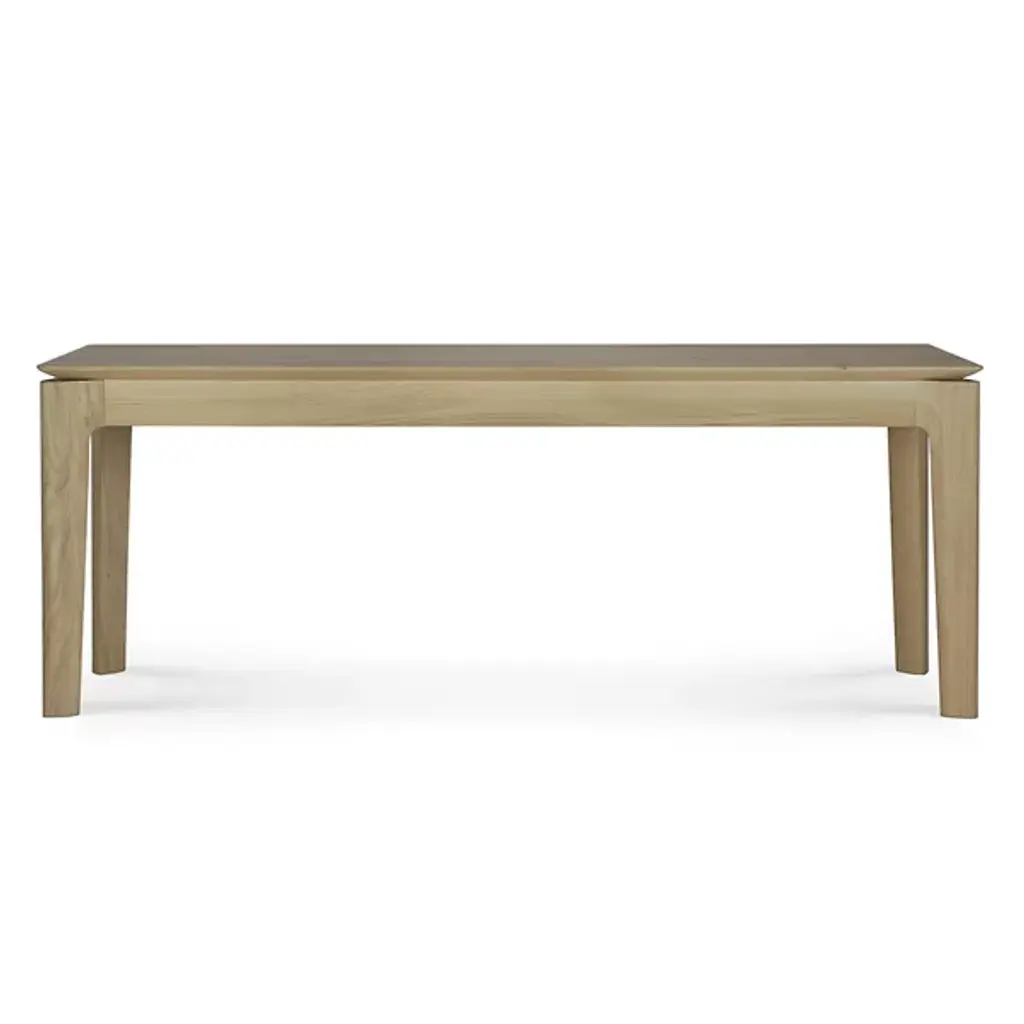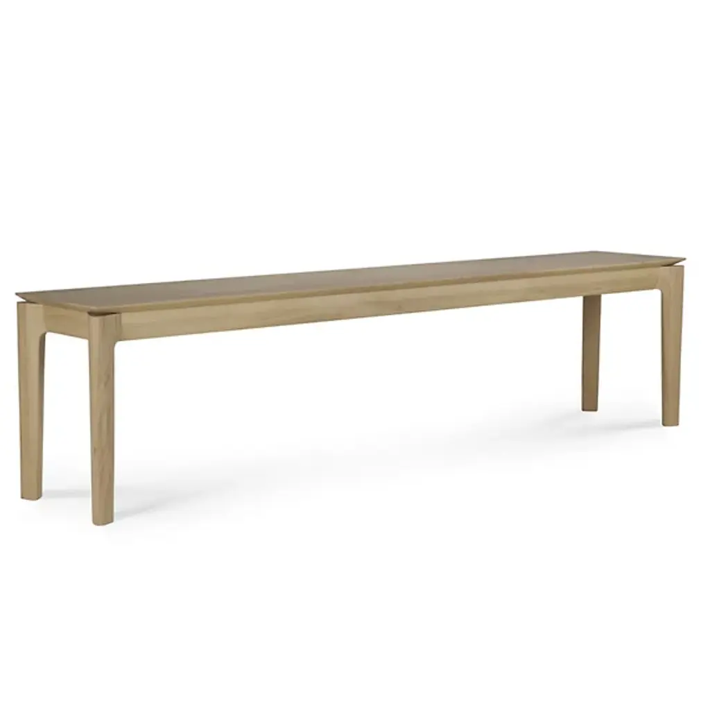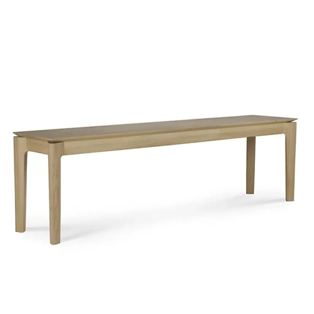 Bring a stylish accompaniment to your indoor living spaces with the Oak Bok Bench from Ethnicraft. A perfect accent to the Bok dining table, this Alain Van Havre design is made from solid oak in Serbia, starting with a set of four rounded legs attached to a cross frame that supports a flat, bevel-sided seat. The natural wood is smoothed to a natural gloss, blending an architectural lightness with a robust construction that leaves a memorable, lasting impression.
