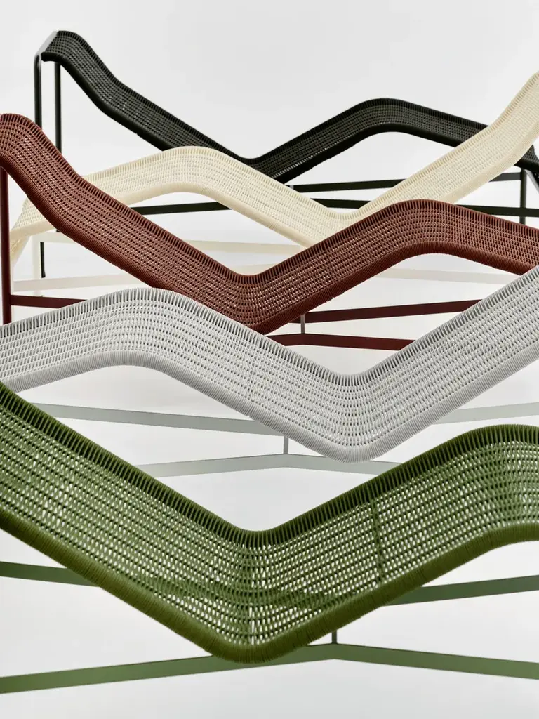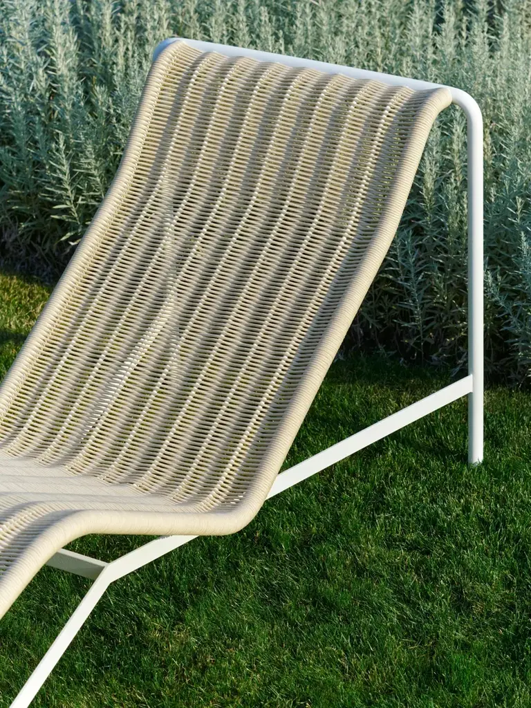 United by its common principle of symmetrical geometry, the Palissade collection of outdoor furniture is designed to integrate effortlessly into both natural and urban settings. The Palissade Cord Chaise Longue shares the same design language as the original collection, combining a softer expression with Palissade’s visual simplicity and core strength. Recycled polyester cord is handwoven onto the chaise longue’s powder coated steel frame in a matching tonal colour, creating a comfortable reclining seat. The chaise longue’s versatile colour palette and timeless appeal make it ideal for using in a wide range of outside spaces, from cafés and parks to gardens, terraces, and balconies.The Palissade Cord collection brings a softer expression to Ronan and Erwan Bouroullec’s iconic Palissade outdoor range of furniture. Retaining the same design language as the original Palissade, recycled polyester cord is handwoven onto a powder coated steel frame, giving this series a more relaxed appearance. Comprising a dining armchair, dining bench, lounge chair, lounge sofa, and chaise longue in colours matching the existing Palissade variants, this collection is conducive for relaxing, eating, and socialising in a wide range of outside spaces.