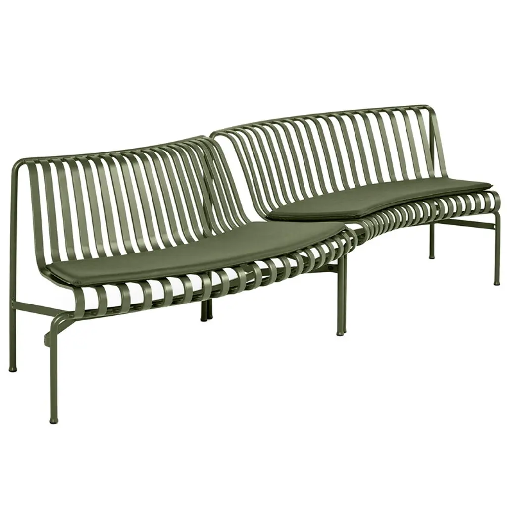 This seat cushion is designed to match the arched shapes of HAY’s Palissade Park dining bench. The lightly padded seat cushion is upholstered in water-resistant, Teflon-coated fabric. The cushion has an anti-slip surface on the bottom to keep it firmly in place. The set consists of two seat cushions.