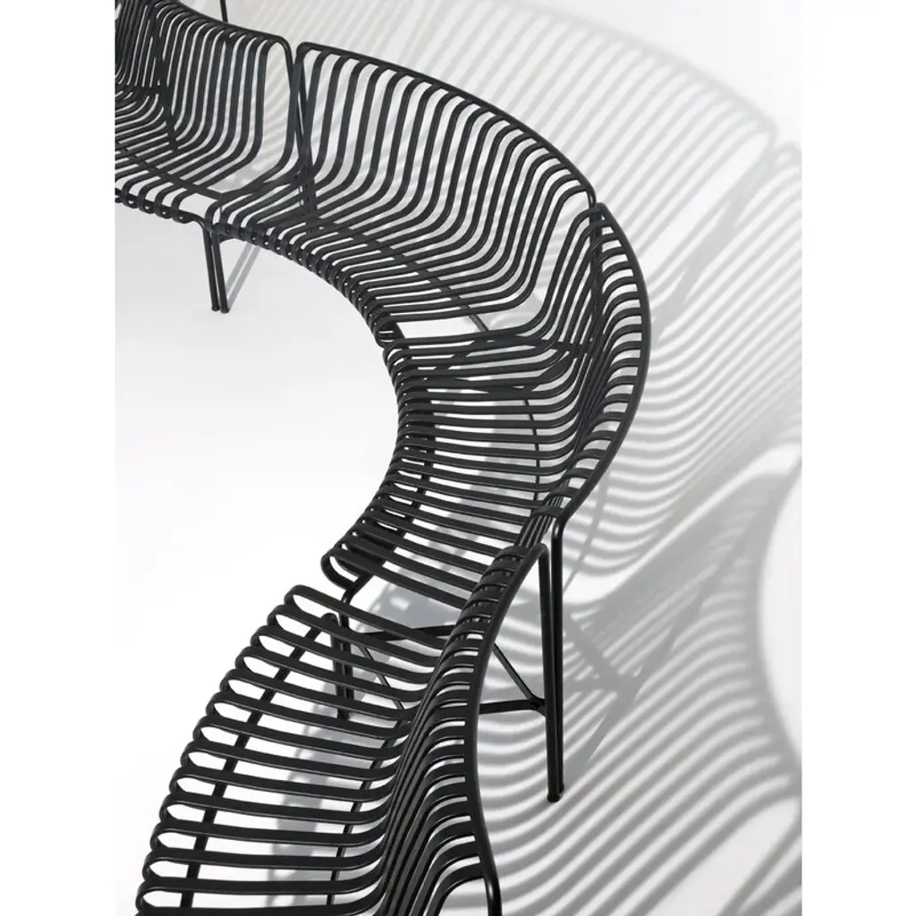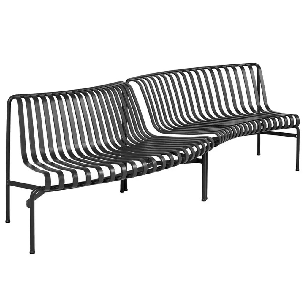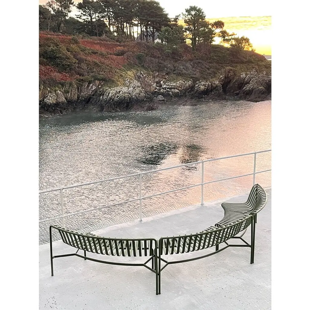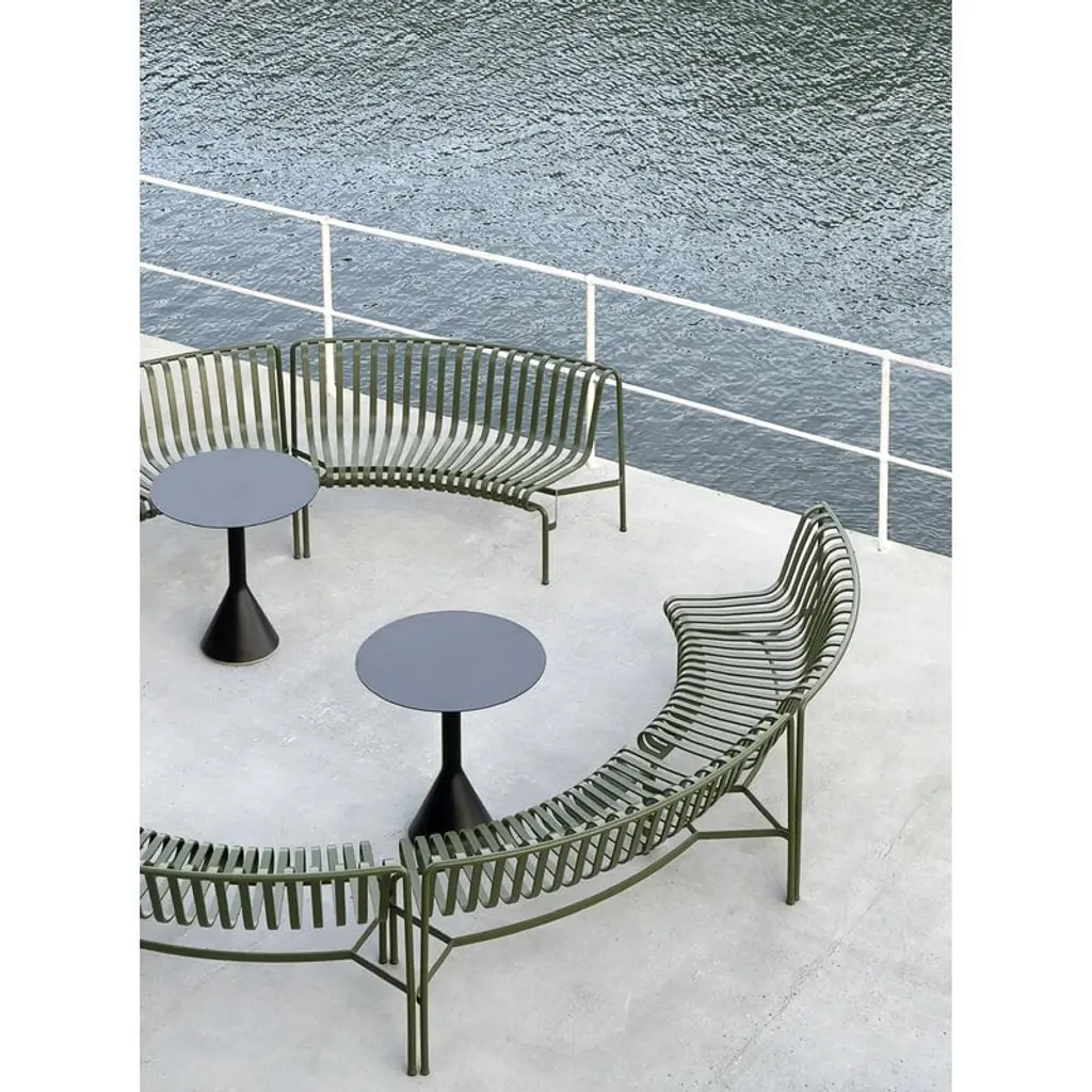 The Palissade Park dining bench is part of HAY’s Palissade Park collection, consisting of modular benches designed especially for larger outdoor spaces and contract use. By connecting two or more benches together, you can create customized seating arrangements in arched, wavy and round configurations. The basic modules of the benches are curved either inward (in) or outward (out). This starter set includes two free-standing dining benches, which can be combined with the Palissade Park add-on benches. Matching seat cushions are available separately. The Palissade outdoor furniture features a strong, graphic design that consists of simple steel tubes and slats. Ronan and Erwan Bouroullec have created a range of simple, balanced pieces that are well suited for terraces, balconies, gardens, cafés and public spaces. The Palissade chairs, tables and benches are sturdy but elegant, and perfect for outdoor use, since wind and water will pass through the galvanized steel frame. The Palissade furniture was designed to age well and its muted color palette adds to the timeless and versatile appearance.