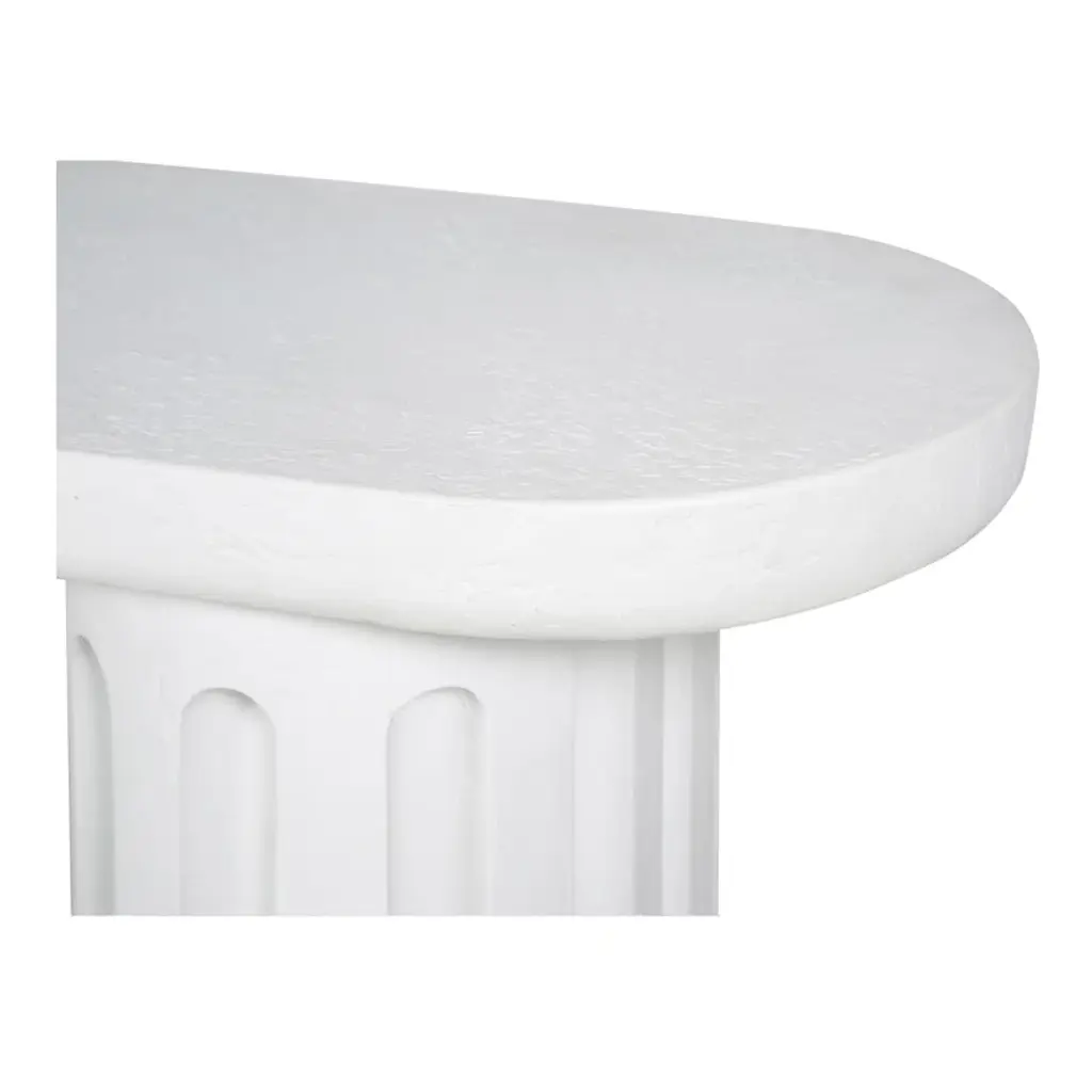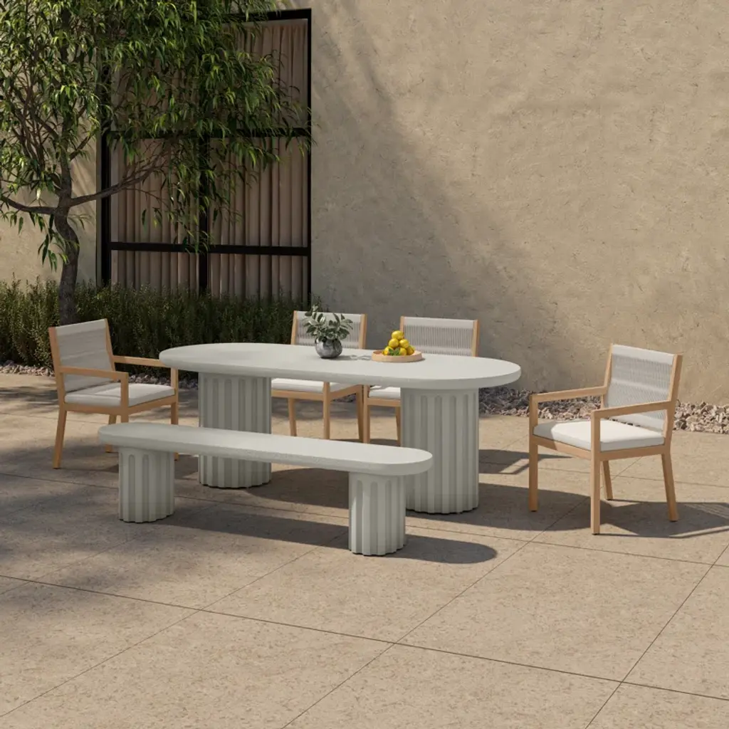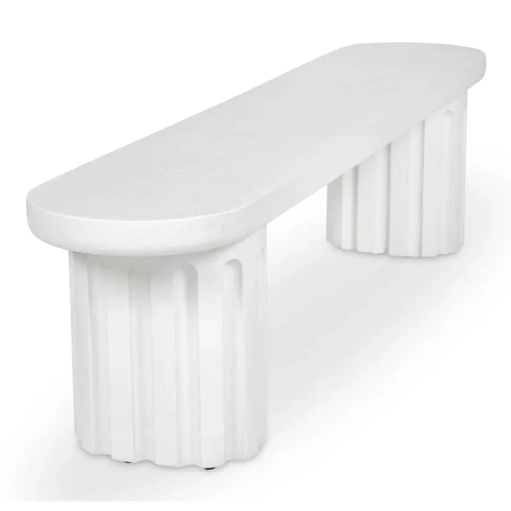 A striking interplay of shapes, the Eris outdoor dining bench embraces round forms with two column-like fluted sides. The rough concrete texture adds depth and complexity to an otherwise simplistic form, making it a statement piece suitable indoors and out. Exceptionally composed of glass fiber reinforced concrete (a fusion of cement, glass fiber, and Styrofoam), this bench offers unique aesthetics while maintaining its beauty.