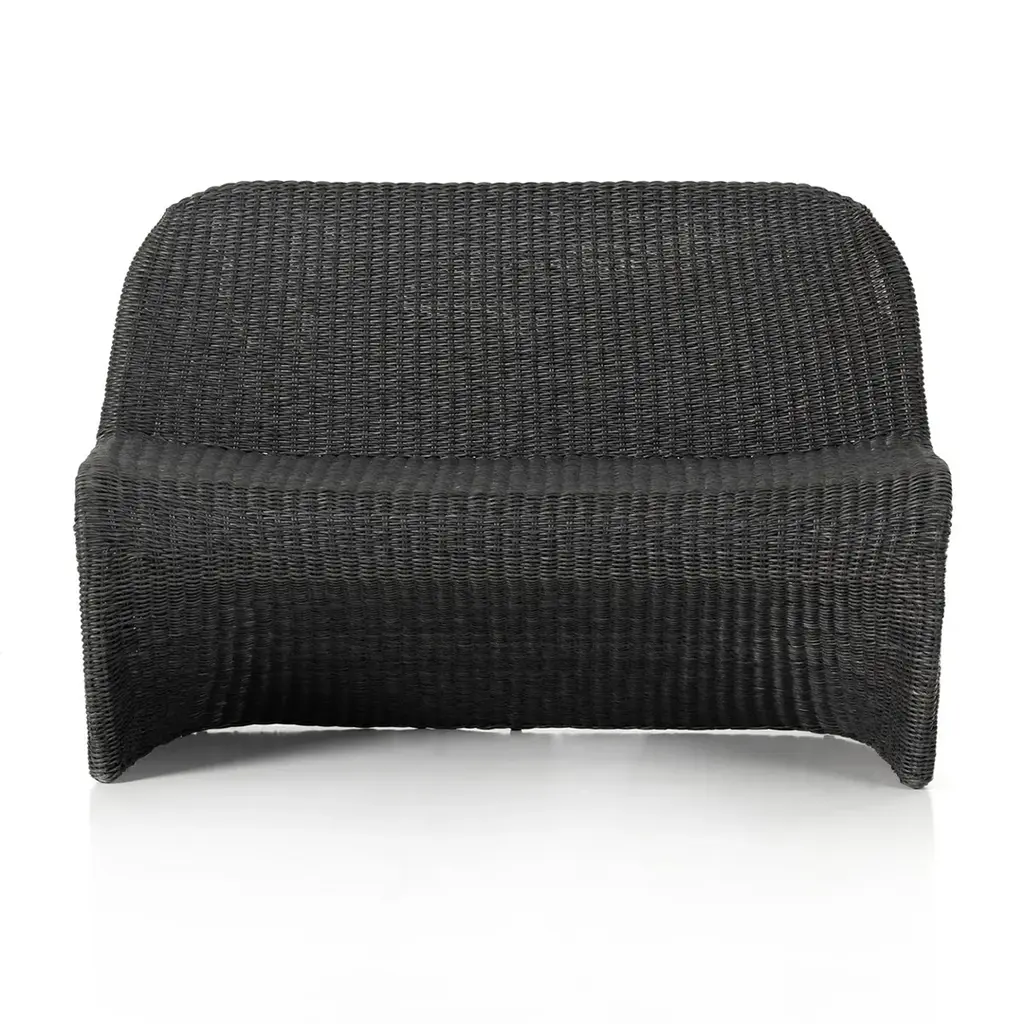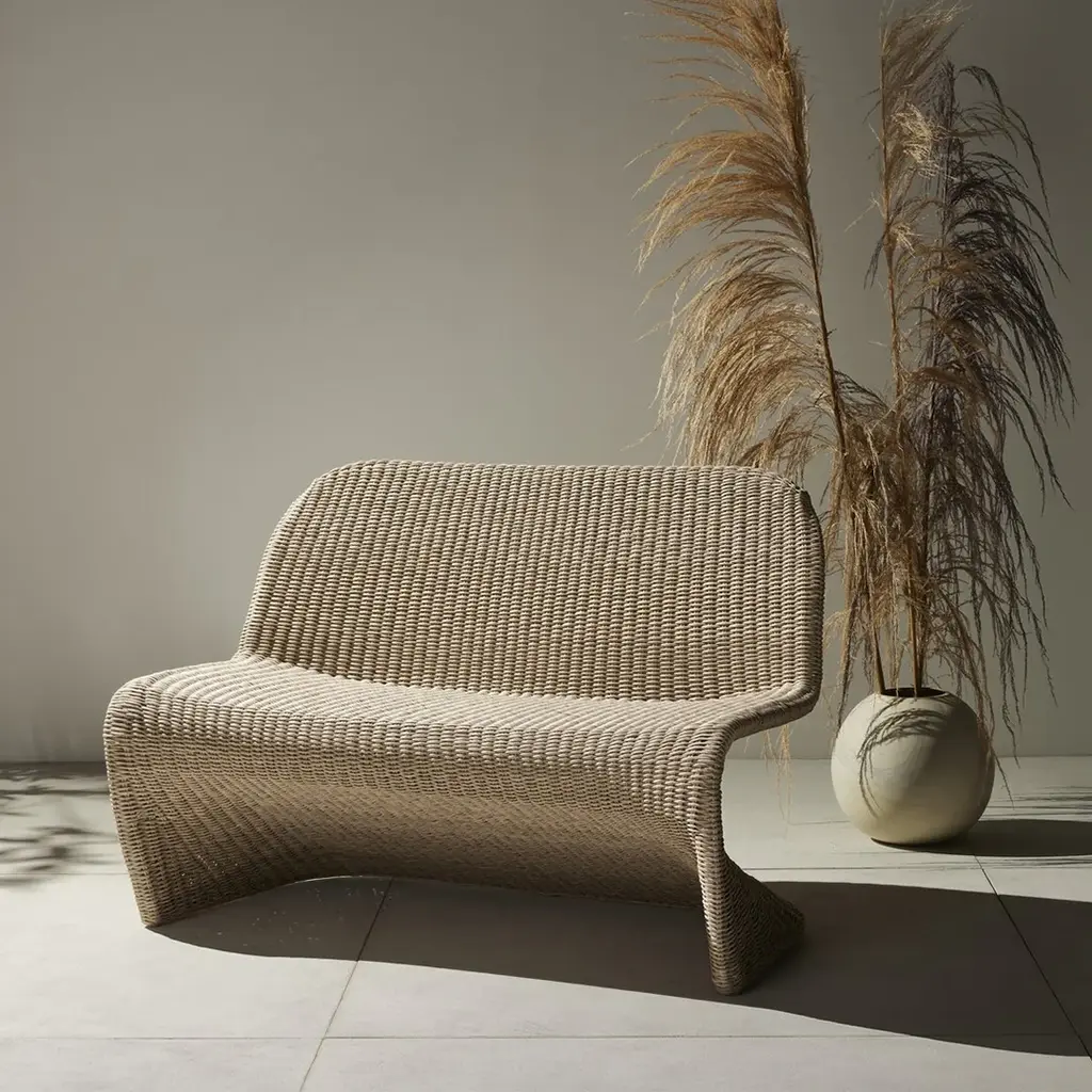 Based off a vintage shape, all-weather wicker seating brings dramatic curves to this statement-making dining bench. Ships In 10-14 Business Days Ships In 10-14 Business Days In Stock Mid December All-weather woven wicker frame This image is for illustrative purposes only. The colors shown are accurate within the constraints of lighting, photography, and the color accuracy of your screen.