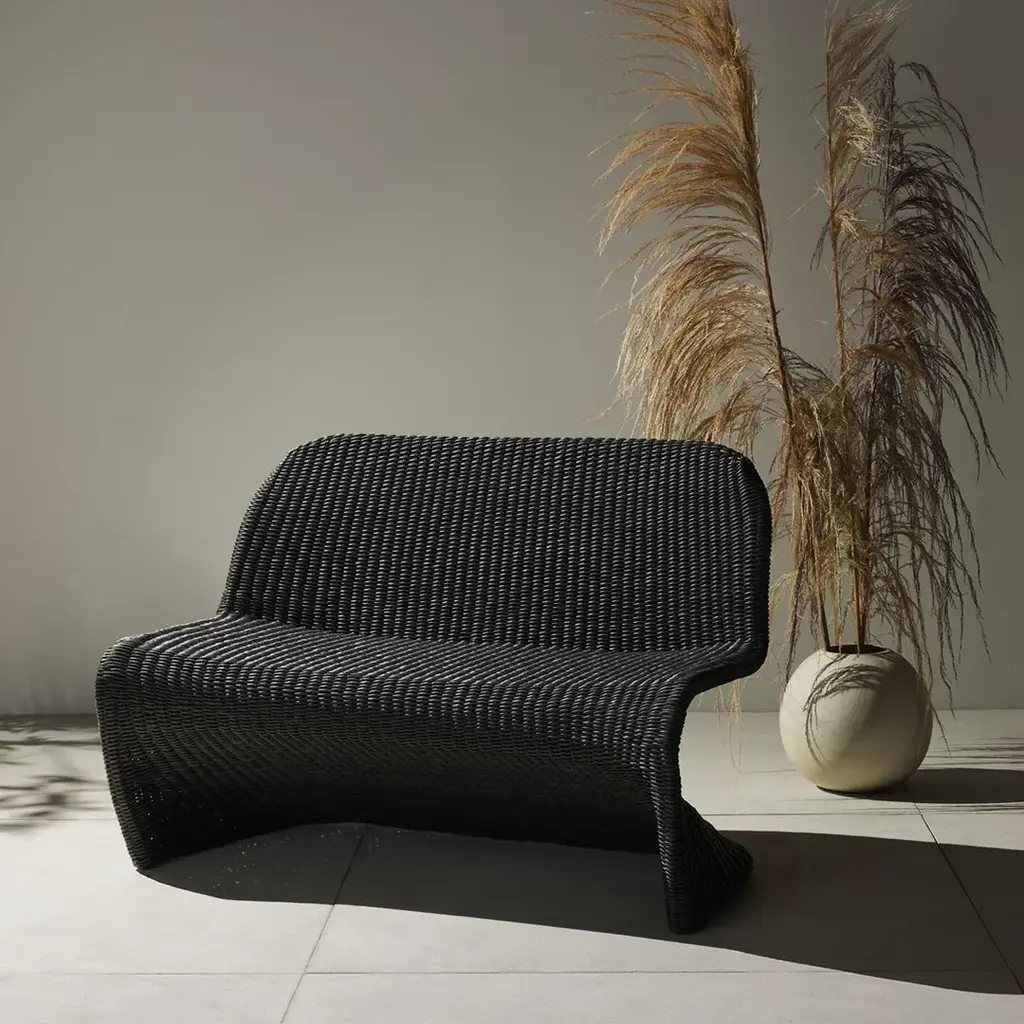 Based off a vintage shape, all-weather wicker seating brings dramatic curves to this statement-making dining bench. Ships In 10-14 Business Days Ships In 10-14 Business Days In Stock Mid December All-weather woven wicker frame This image is for illustrative purposes only. The colors shown are accurate within the constraints of lighting, photography, and the color accuracy of your screen.