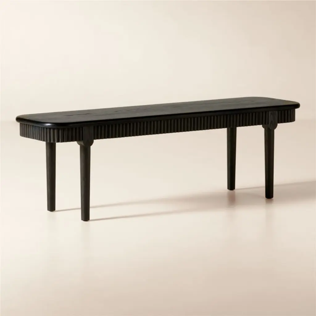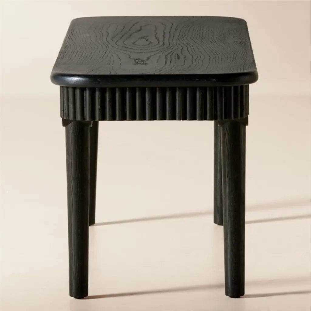 Ebonized oak certified sustainable by the Forest Stewardship Council (FSC) goes on display in this French vintage-inspired design by London-based James Patterson. Natural wood grain is spotlighted throughout, accentuated by the bench's clean lines, rounded edges and fluted apron details. CB2 exclusive.