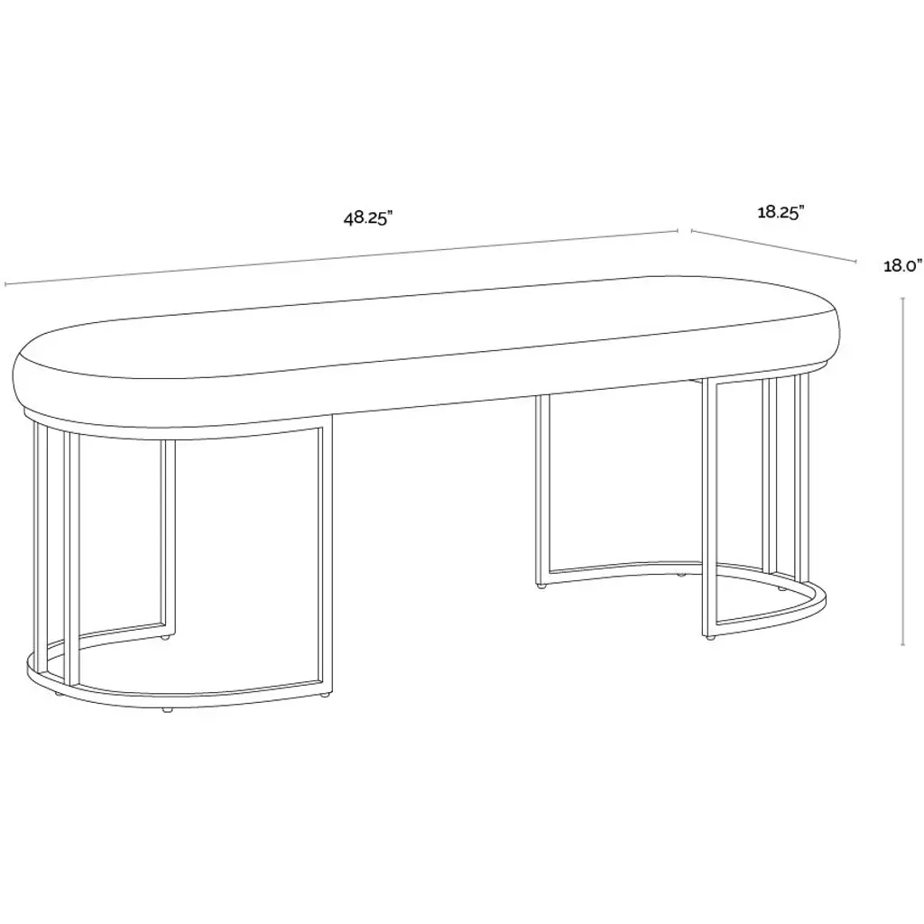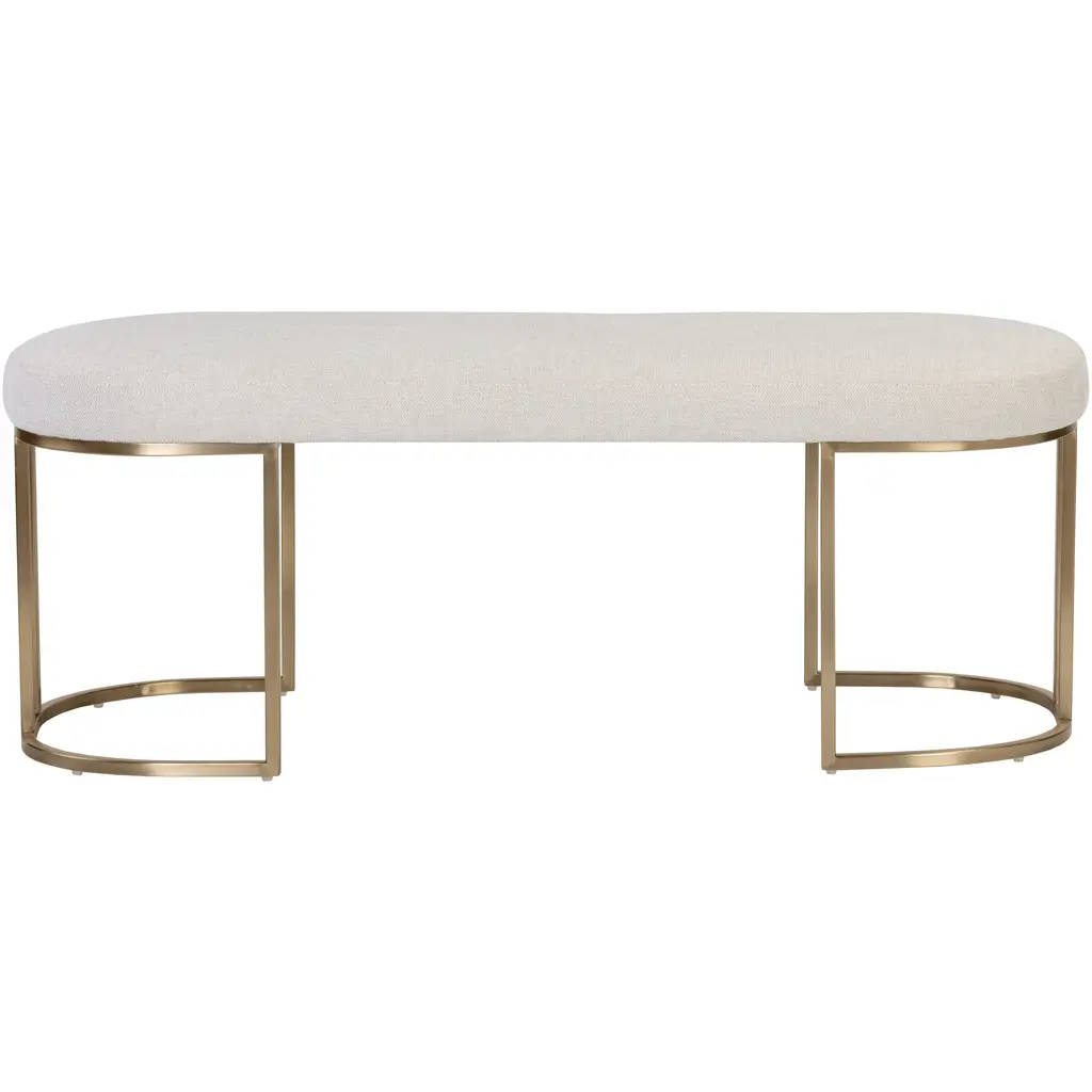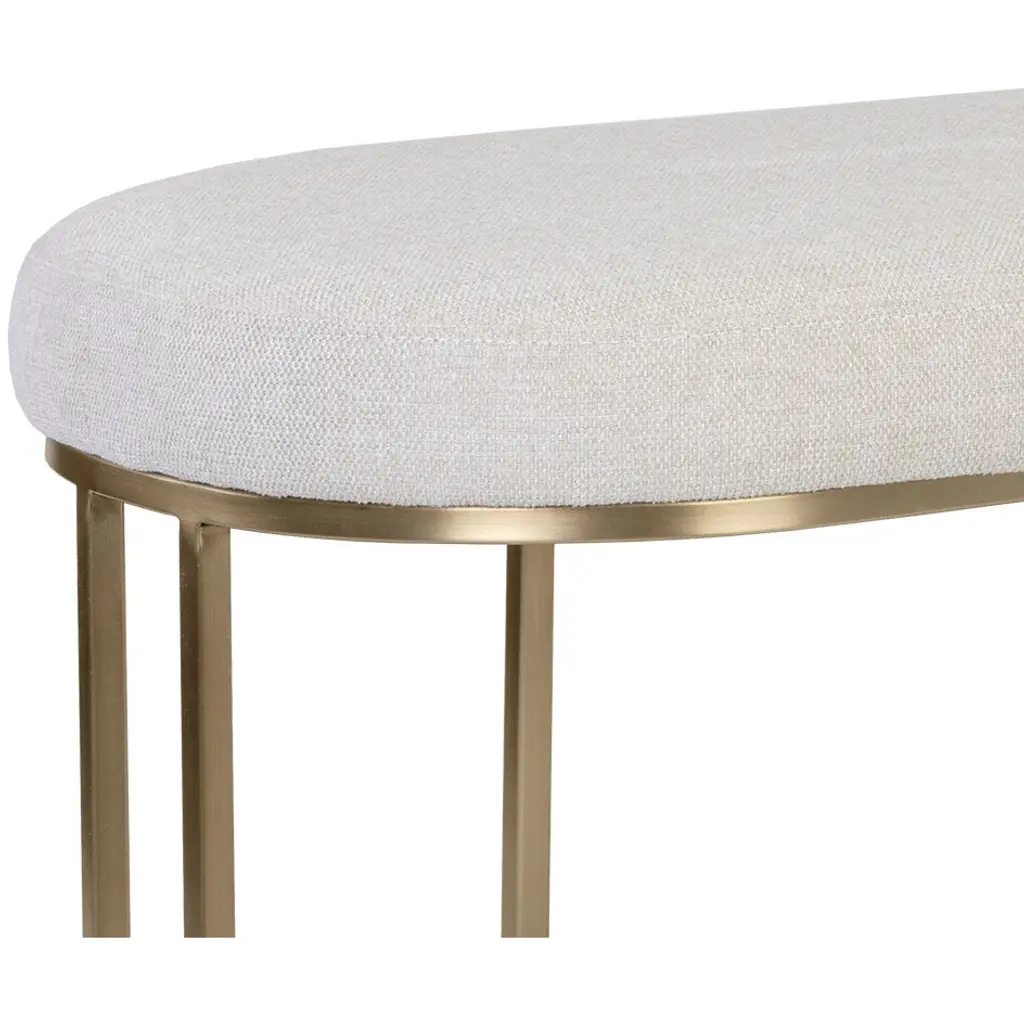 An elegant bench designed with soft, textured belfast oatmeal fabric and an exposed antique brass stainless steel frame. Can be paired with coordinating dining chair and dining armchair.