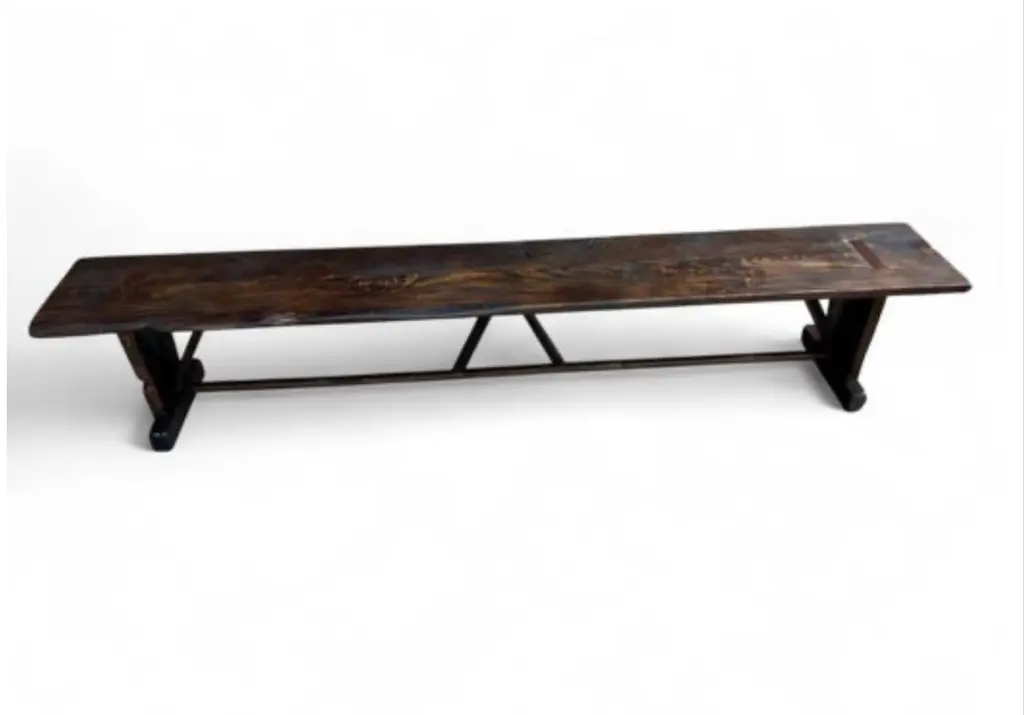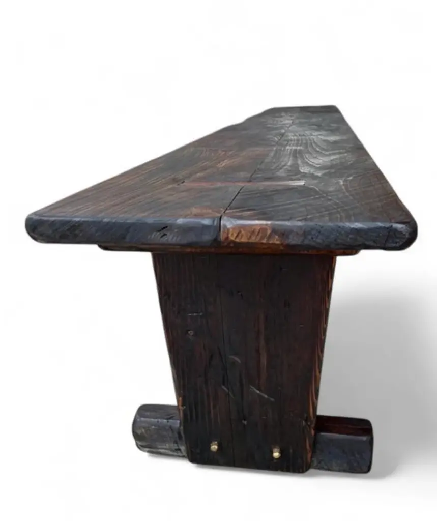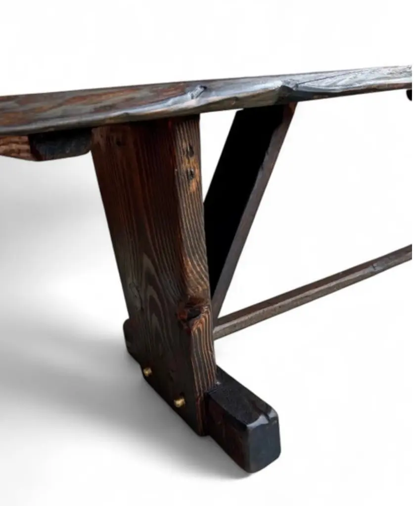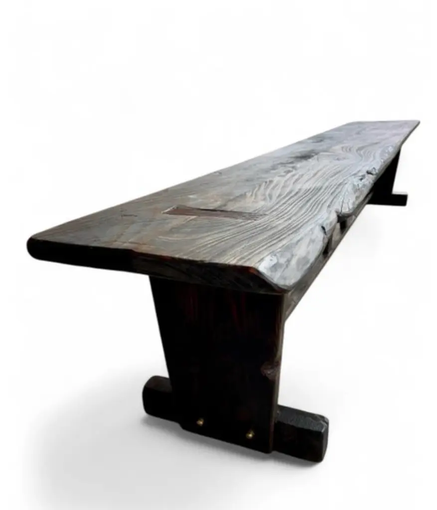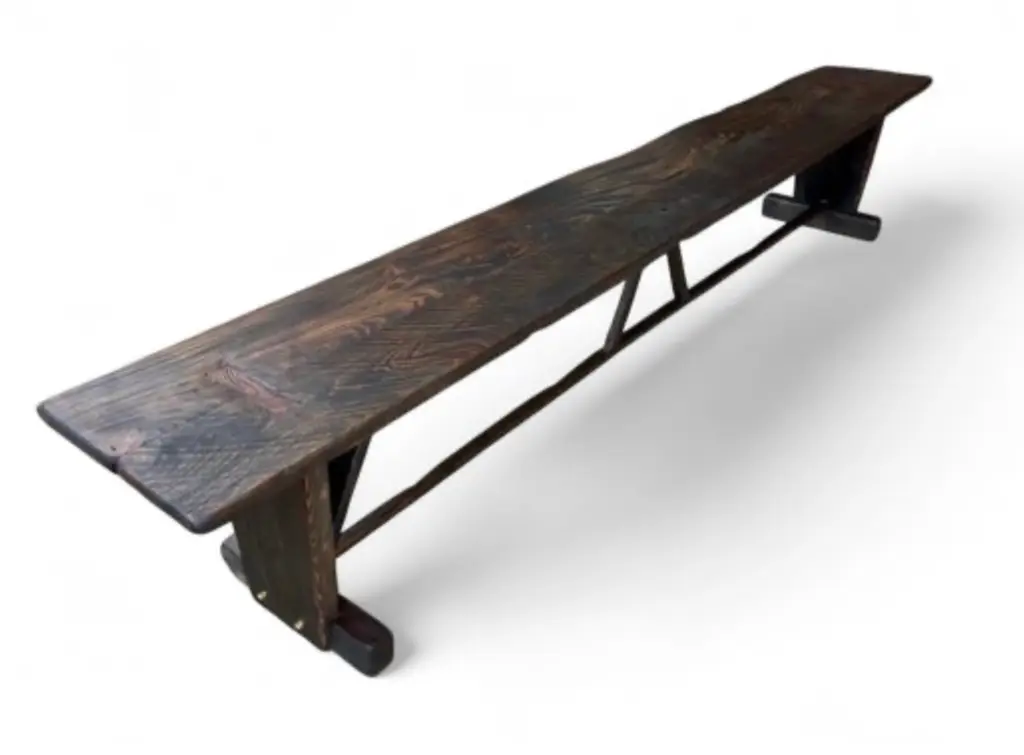Made-to-Order Farmhouse Trestle Bench A bold yet refined bench in the rustic European farmhouse tradition. Made to order using century-old reclaimed barnwood, each piece is built by hand using time-honored joinery and finished with no visible modern hardware. The two-plank top is supported by cantilevered legs and a central trestle stretcher—offered with or without (se our Rustic French Farmhouse Listing), depending on your preferred profile. Available in two finish options: a warm two-tone combination of natural and walnut, or Archaic’s custom “Espresso” tone—each sealed with a low-sheen matte clear-coat. Subtle dowel details complete the build, with brass-finished accents on the Espresso version. Style & Materials Handcrafted from reclaimed barnwood over a century old Species may include white and red oak, cypress, elm, walnut, butternut, white pine, and heart pine Circle-sawn texture preserved for character Traditional mortise-and-tenon joinery, dowel detailing Matte clear-coat finish available in Natural + Walnut or Espresso Espresso version features brass-finished dowels Use It For Ideal as a long dining bench, dramatic entryway seat, or grounding accent at the foot of a bed. Also well-suited for gallery, retail, or hospitality spaces needing presence and durability. Dimensions 16 inches deep x 18 inches high