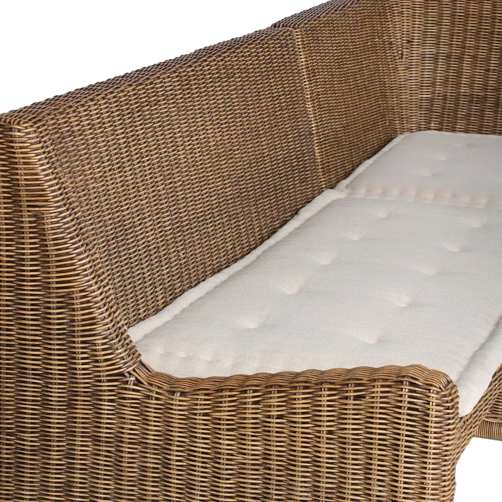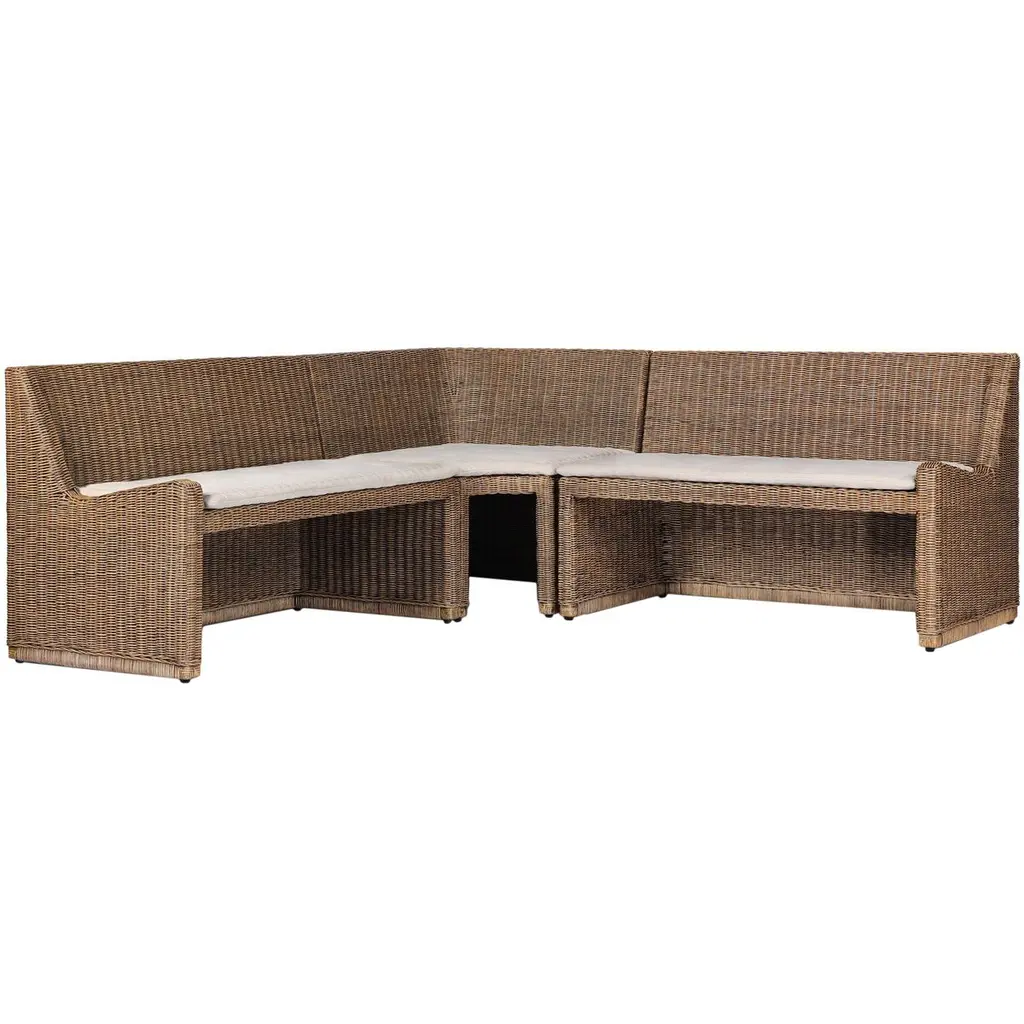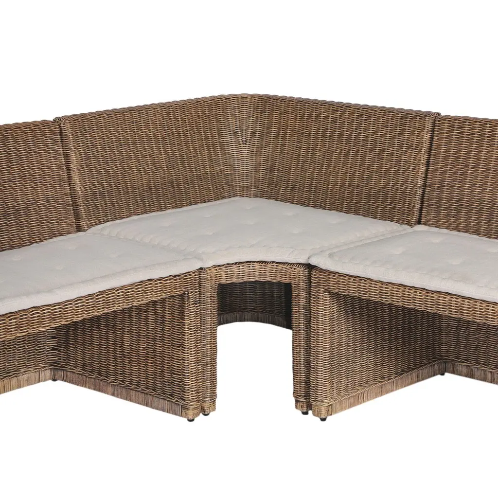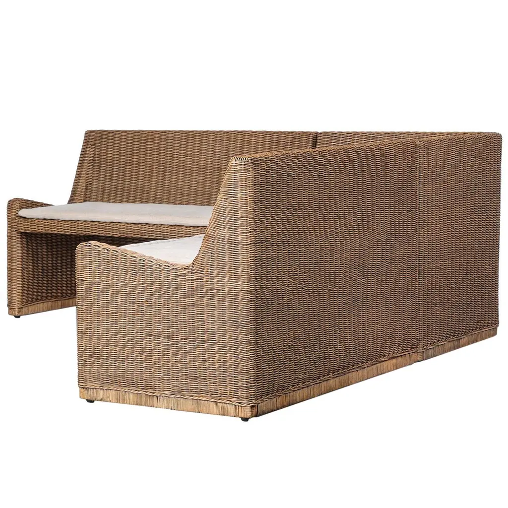 Antique-inspired coastal style. Rattan introduces varying natural shades and texture to this dining bench, and the frame's soft lines and fabric cushion invite a comfortable sit. Option to style alone or pair with other pieces in the collection. A design collaboration by Amber Lewis and Four Hands.