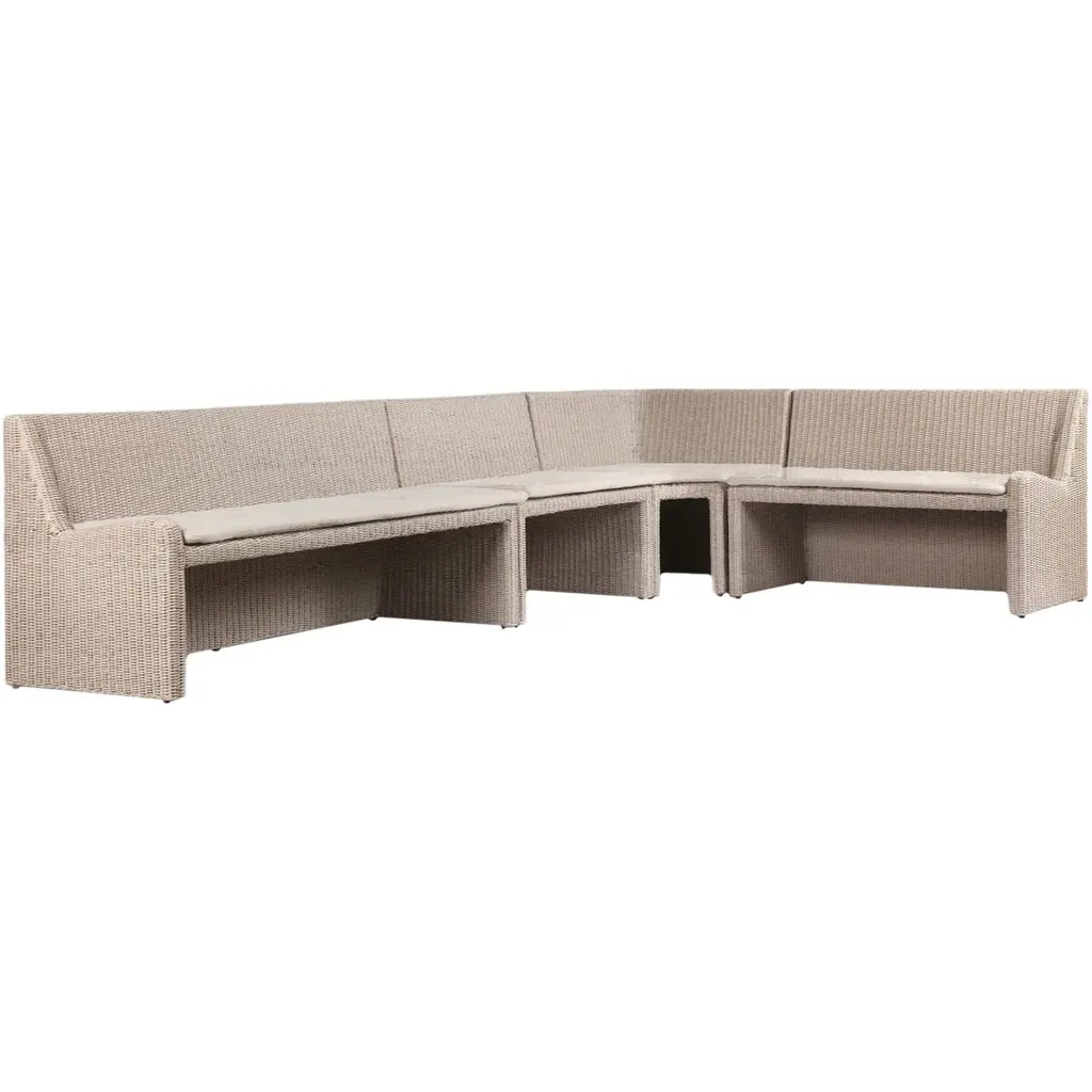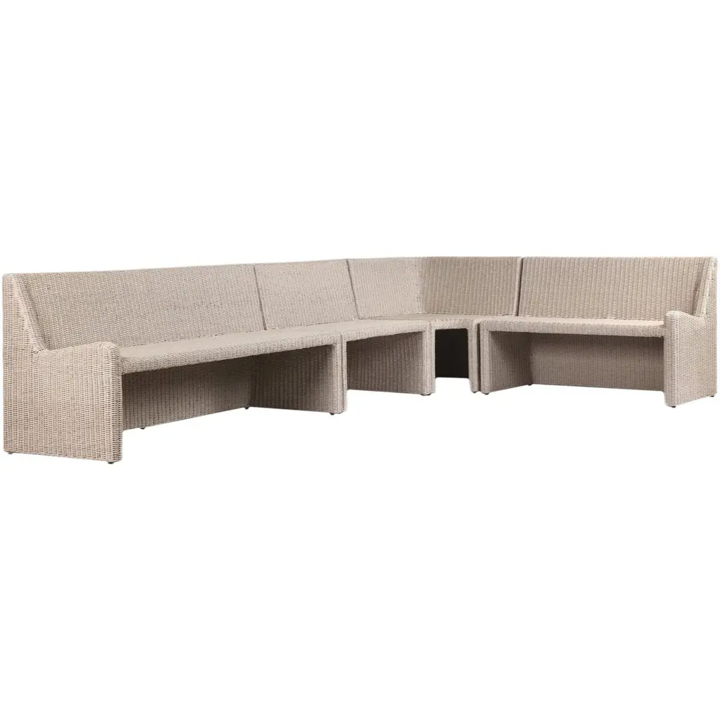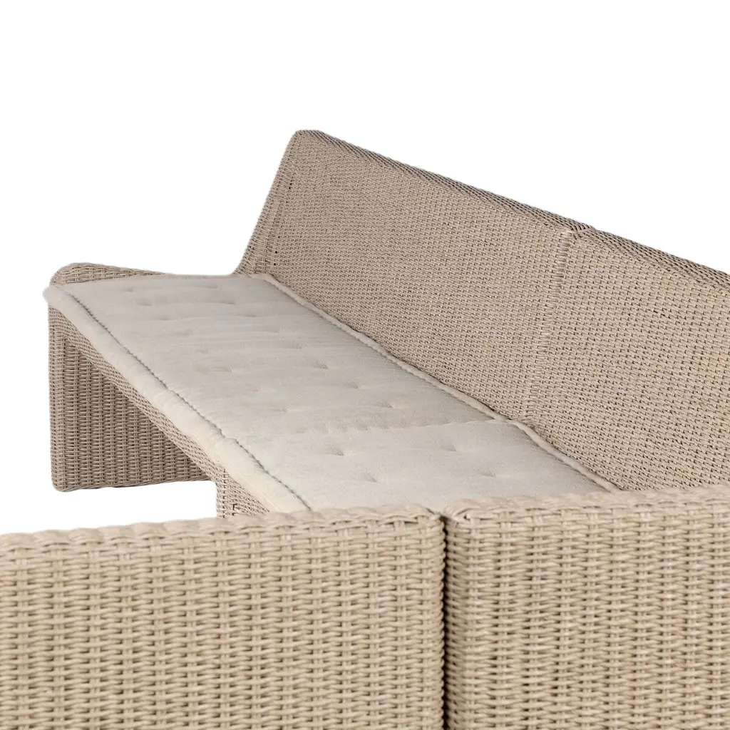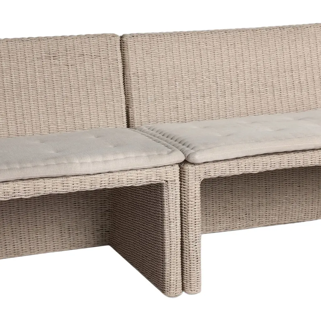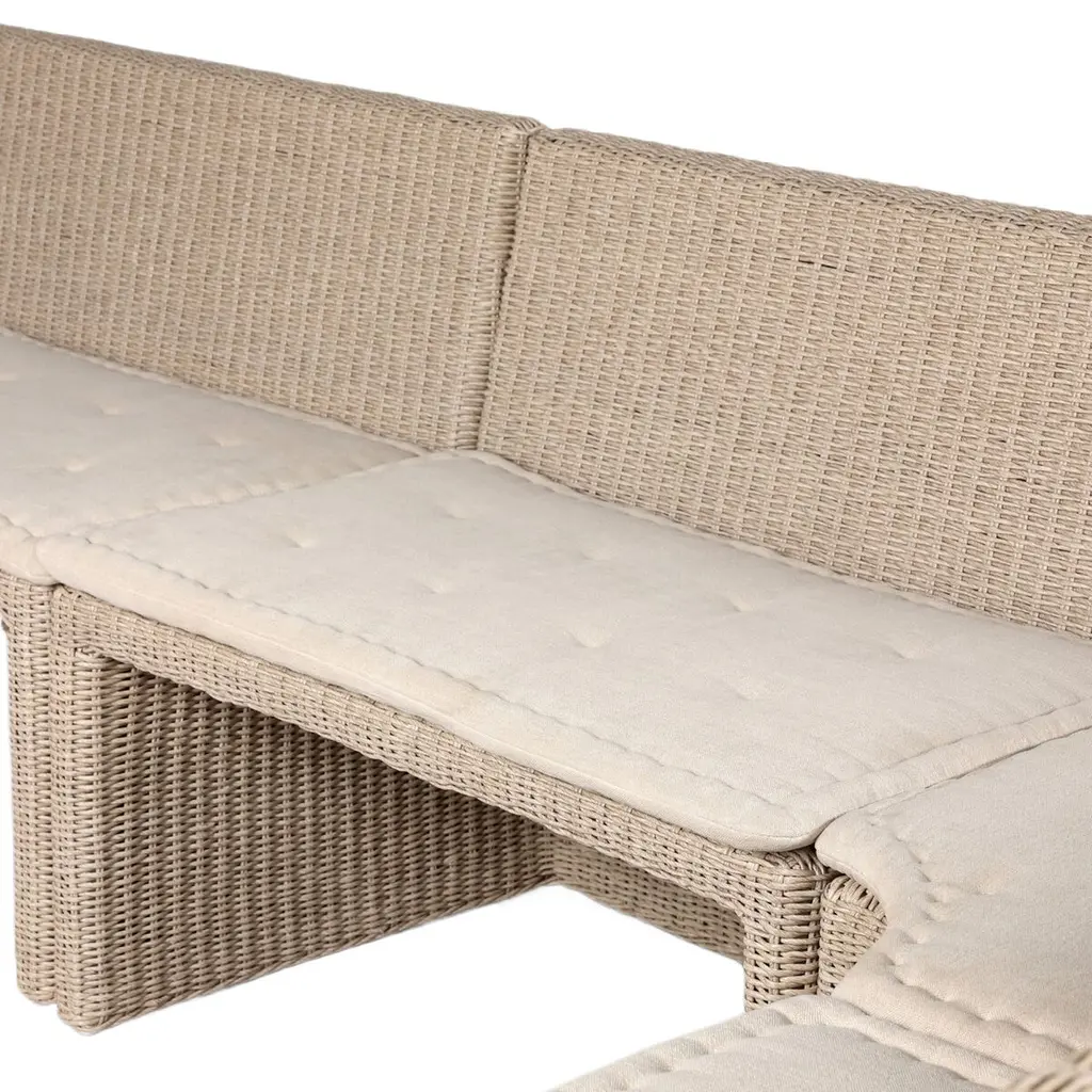 Antique-inspired coastal style. Rattan introduces varying natural shades and texture to this dining bench, and the frame's soft lines and fabric cushion invite a comfortable sit. Option to style alone or pair with other pieces in the collection. A design collaboration by Amber Lewis and Four Hands.