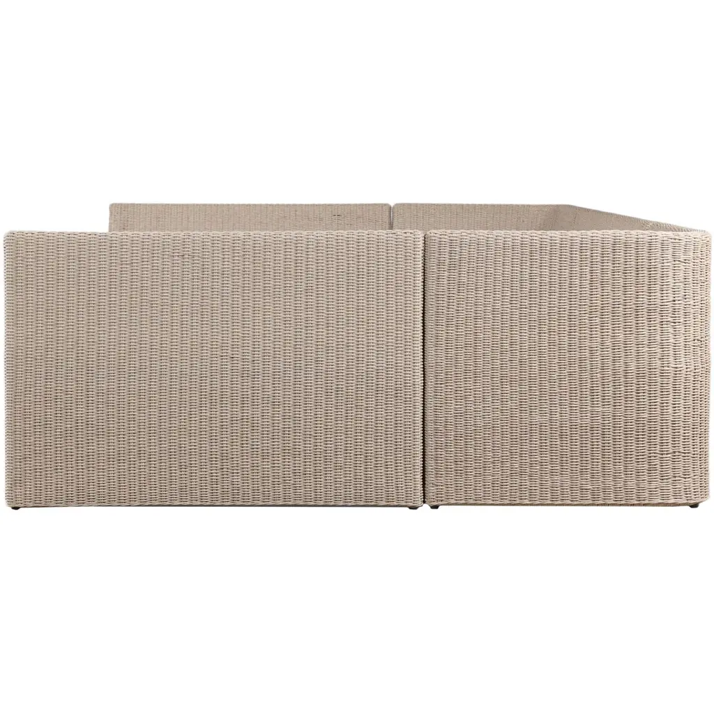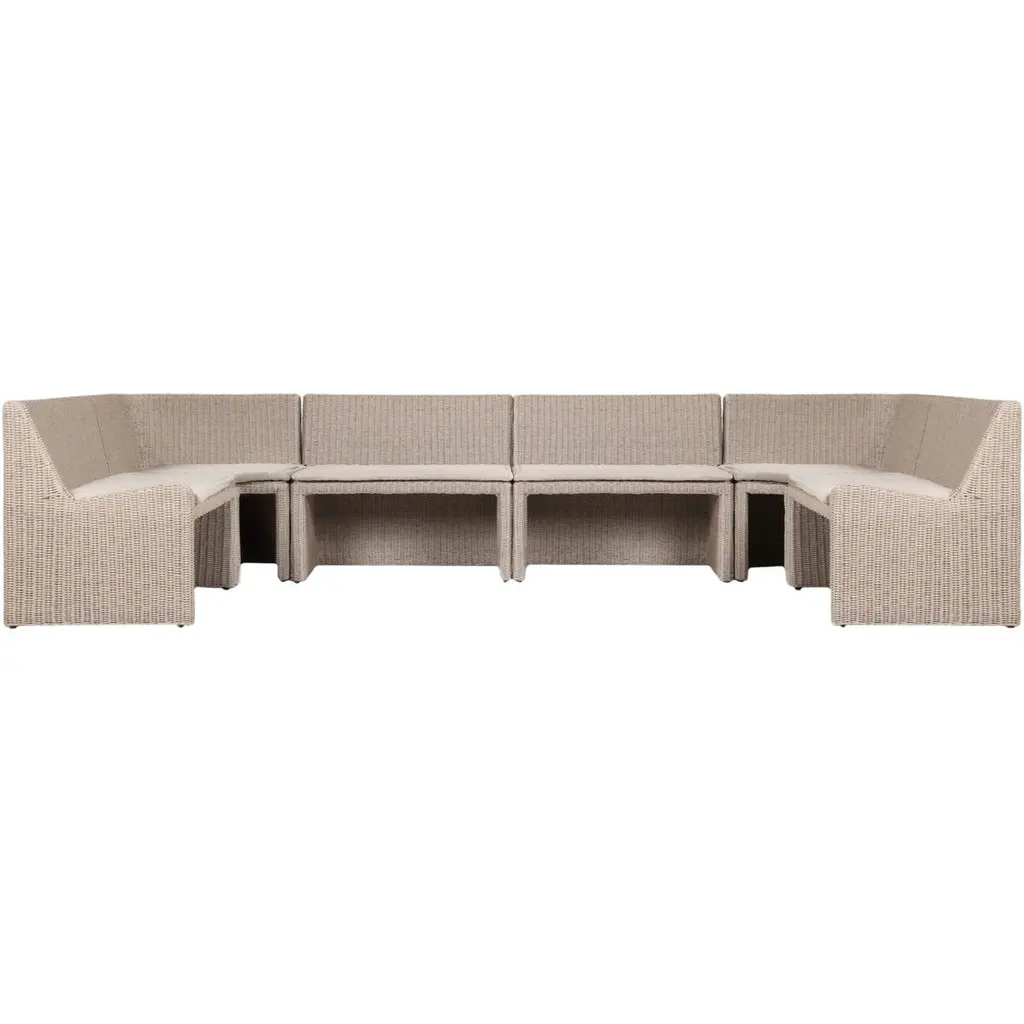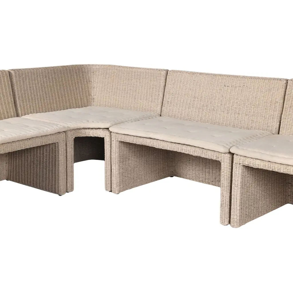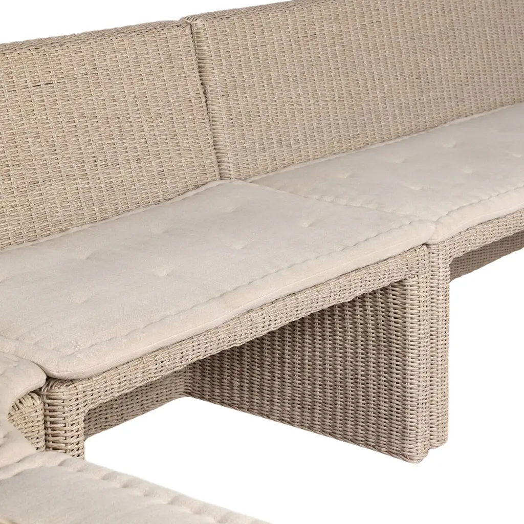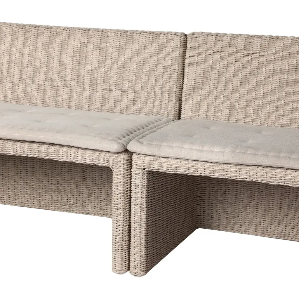 Antique-inspired coastal style. Rattan introduces varying natural shades and texture to this dining bench, and the frame's soft lines and fabric cushion invite a comfortable sit. Option to style alone or pair with other pieces in the collection. A design collaboration by Amber Lewis and Four Hands.