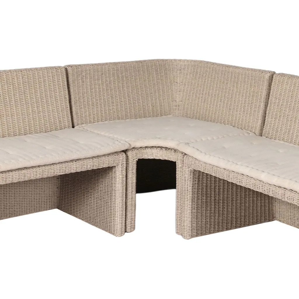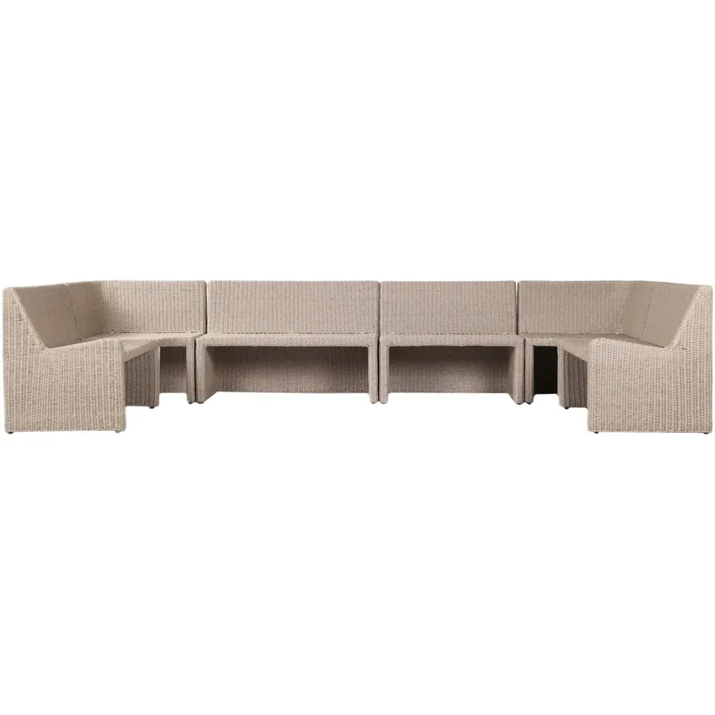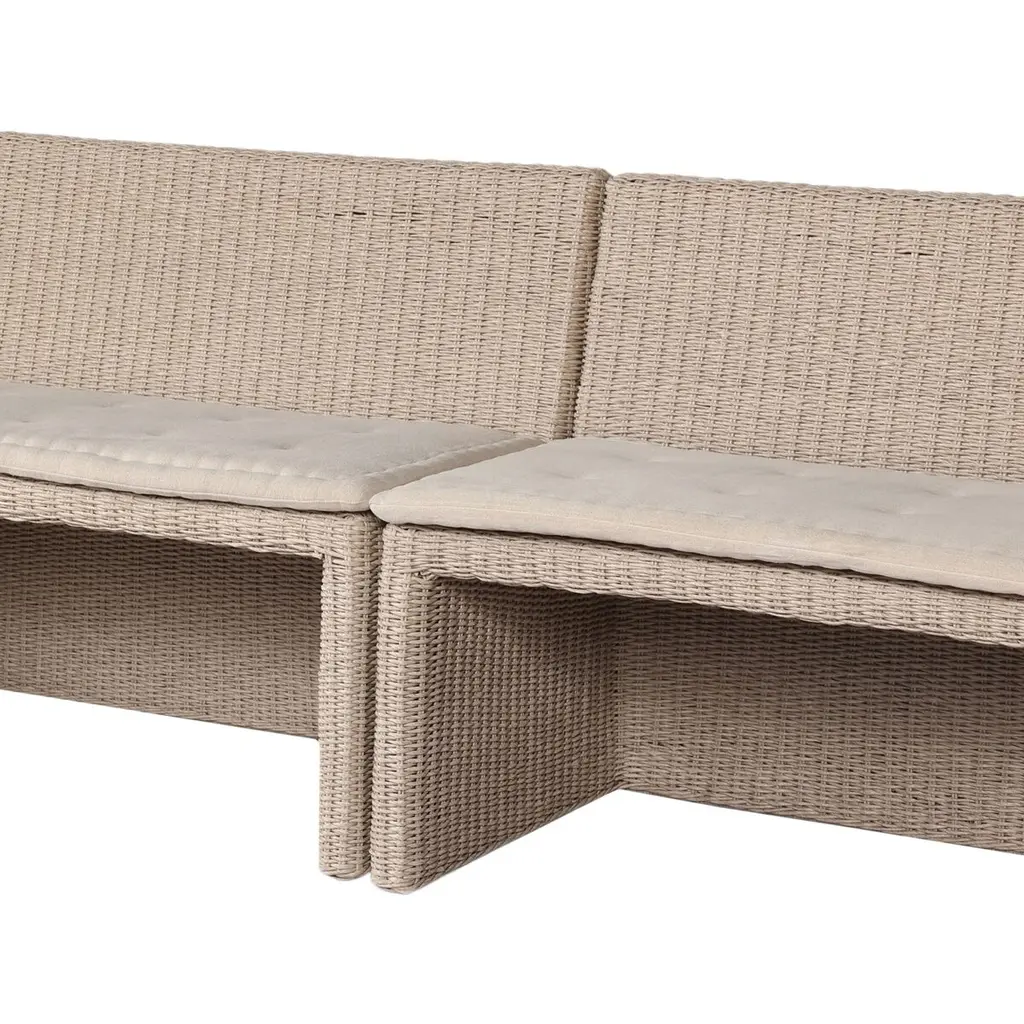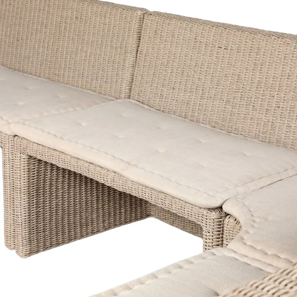 Antique-inspired coastal style. Rattan introduces varying natural shades and texture to this dining bench, and the frame's soft lines and fabric cushion invite a comfortable sit. Option to style alone or pair with other pieces in the collection. A design collaboration by Amber Lewis and Four Hands.