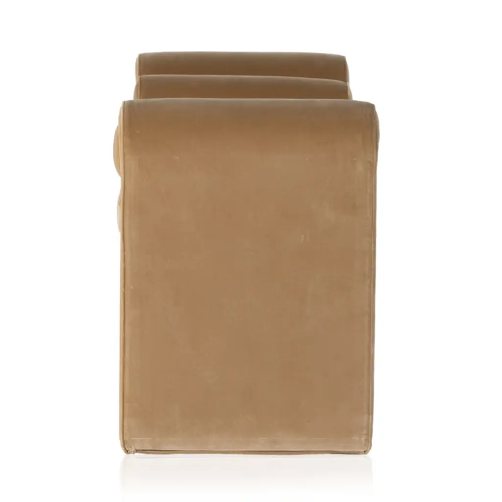 Cream, boucle-like upholstery covers a long, sophisticated dining bench.