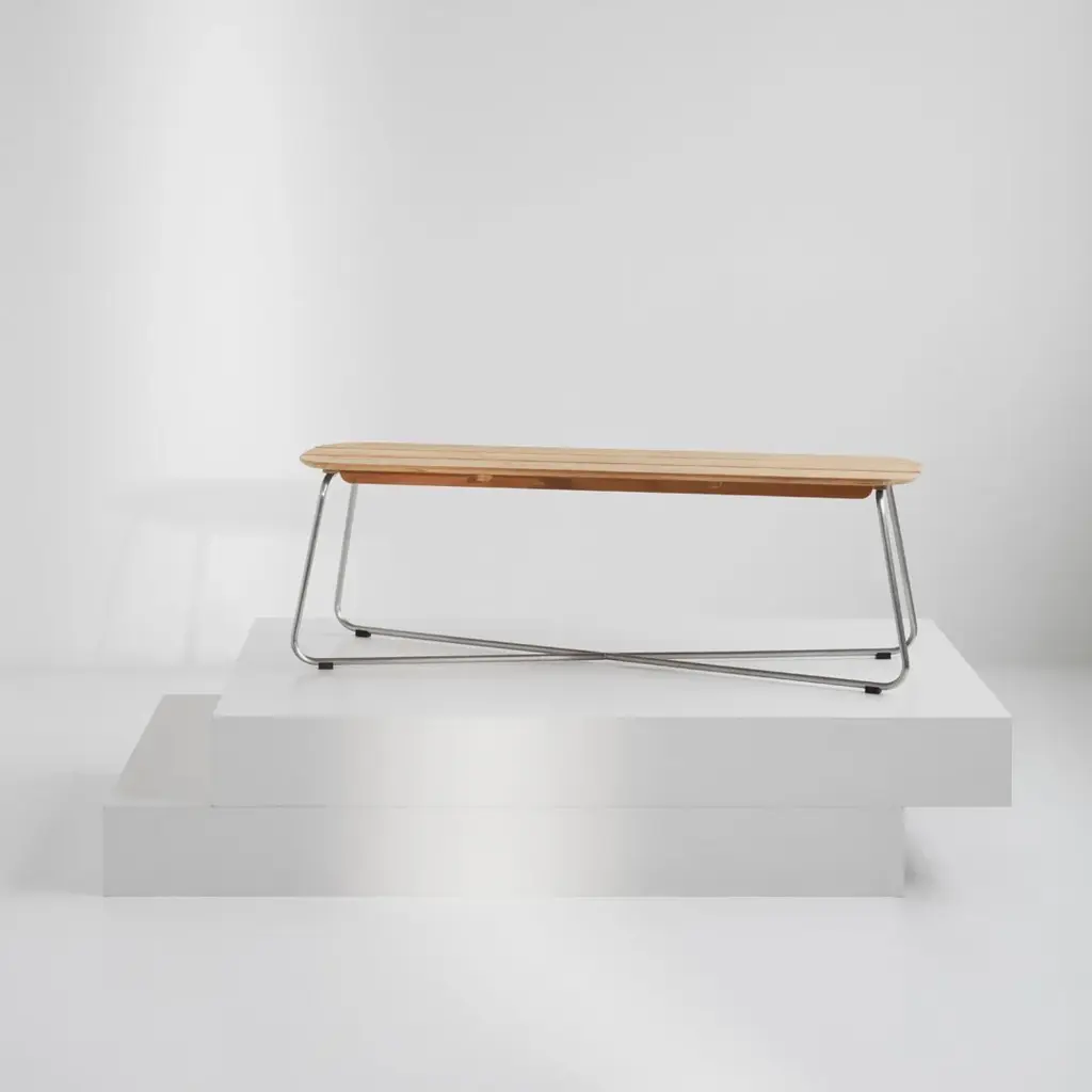 The Lily collection is defined by combining the teak plank elements and the stainless steel, culminating with the “x" detail at the base. The wood slats sit elegantly on top of the frame, hiding all hardware connections while creating the illusion that they are floating in place. Where needed, the teak is elegantly curved and shaped to provide extra comfort. The Lily bench is not just a versatile bench but also doubles as a lounge table. Based on the same design premises as the rest of the series, the Lily bench is both light and sturdy with its X-shaped frame in stainless steel and tabletop in teak planks placed lengthwise for a slender expression - just like the dining table. The cushion for the Lily Bench can be found here.