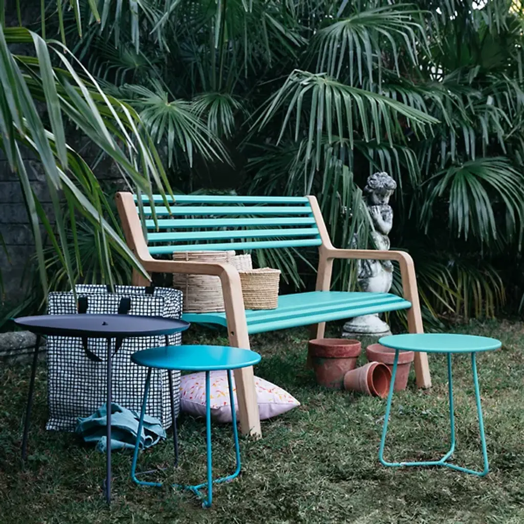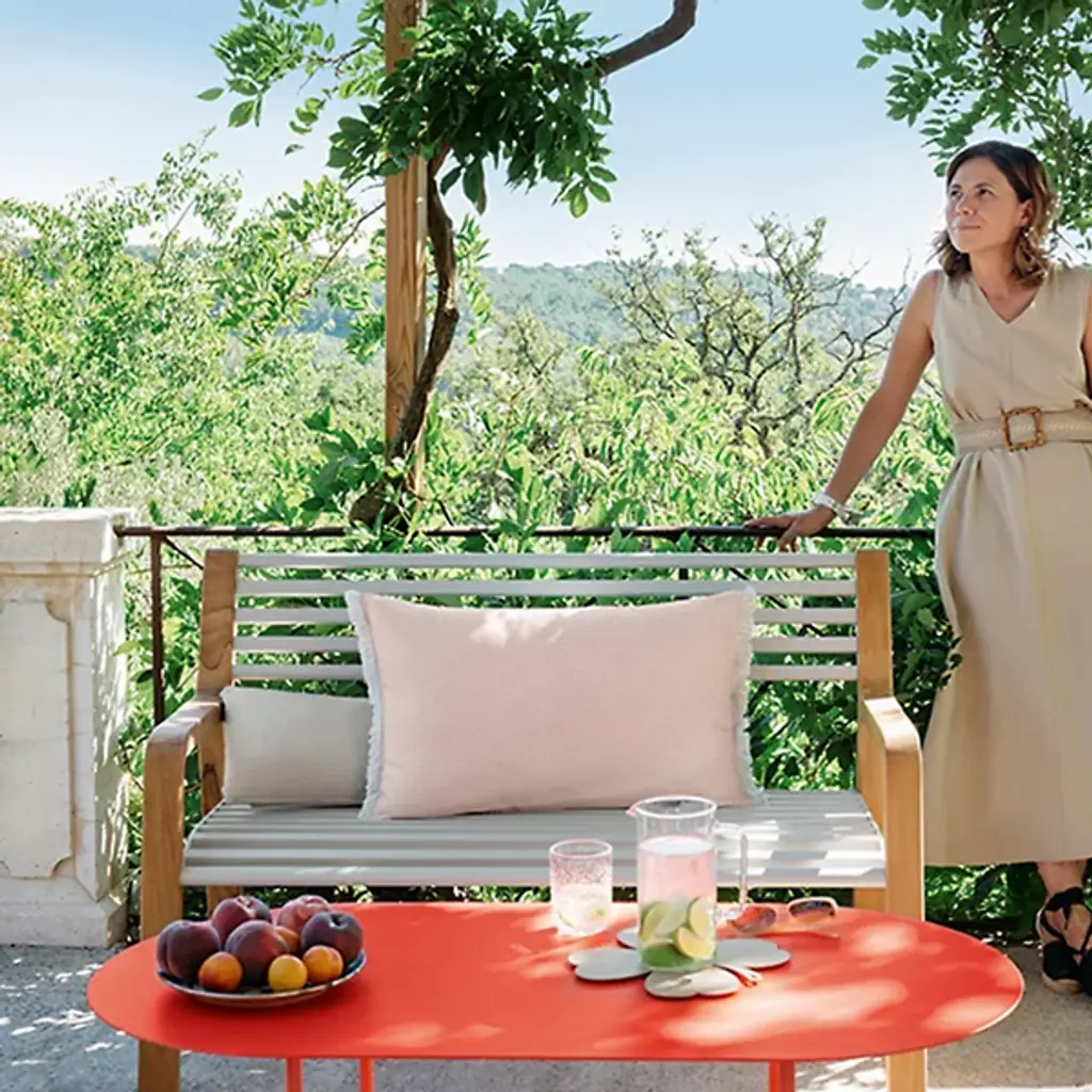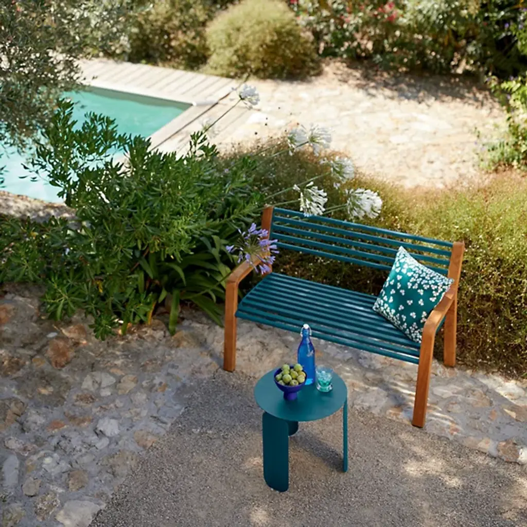 The Old English bench with a twist. The Fermob Somerset Bench is a unique design that reworks the classic vertical slatted back with sleek horizontal lines. A 2 seater with gentle geared-for-comfort curves and slants, the design features an eye-pleasing mix of materials that combines natural, non-oiled Teak (Grade C) for the framework and armrests with an Aluminum backrest and seat. The Aluminum frame is treated with a unique UV-protection to prevent fading and to weather the elements of outdoor environments. Suitable for dining, relaxing or people watching, the stylish bench brings out the full potential of outdoor spaces, from front of the house to a private patio, balcony or garden.