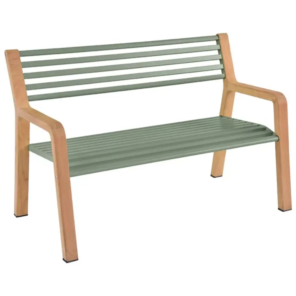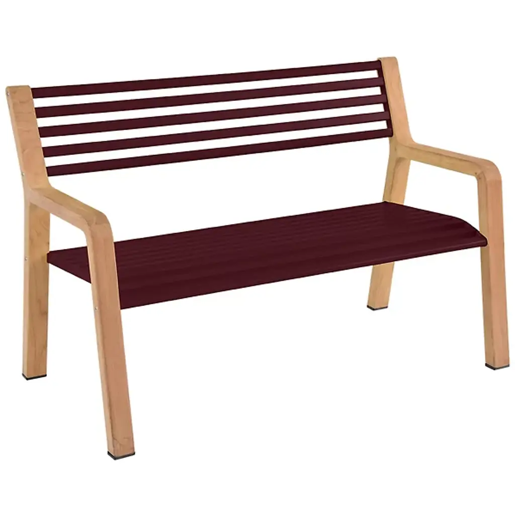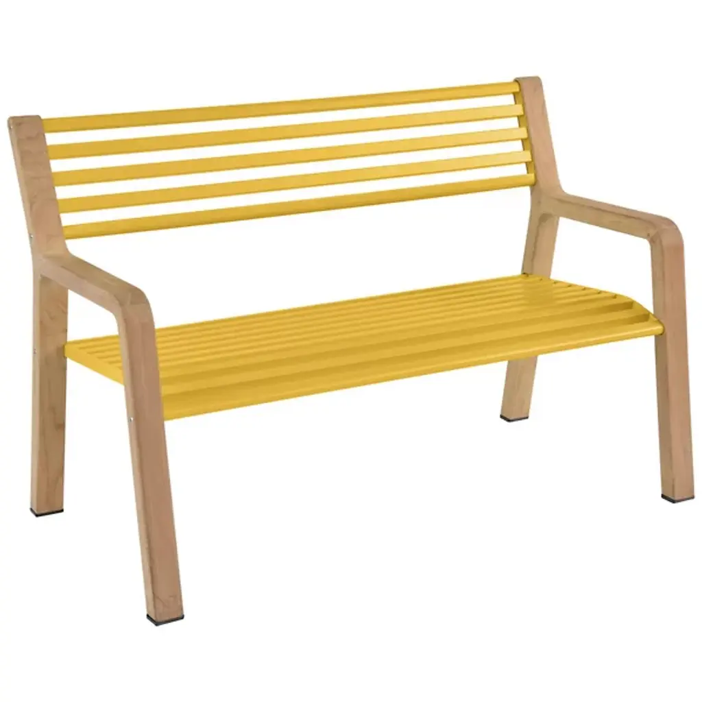 The Old English bench with a twist. The Fermob Somerset Bench is a unique design that reworks the classic vertical slatted back with sleek horizontal lines. A 2 seater with gentle geared-for-comfort curves and slants, the design features an eye-pleasing mix of materials that combines natural, non-oiled Teak (Grade C) for the framework and armrests with an Aluminum backrest and seat. The Aluminum frame is treated with a unique UV-protection to prevent fading and to weather the elements of outdoor environments. Suitable for dining, relaxing or people watching, the stylish bench brings out the full potential of outdoor spaces, from front of the house to a private patio, balcony or garden.