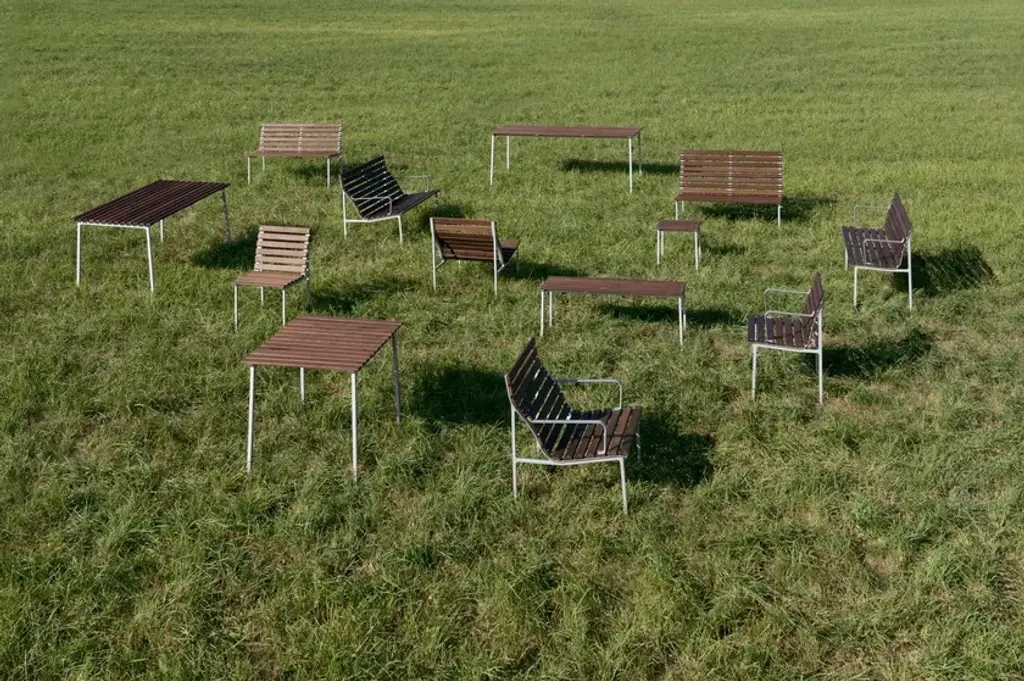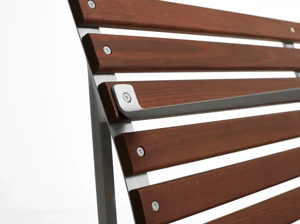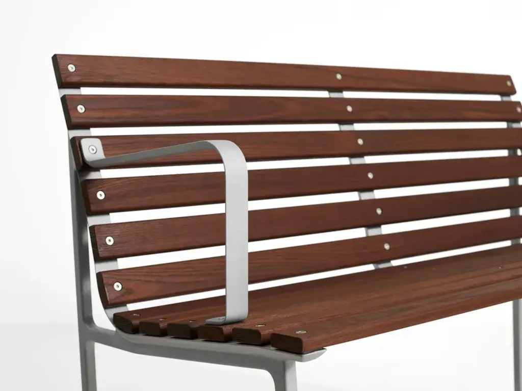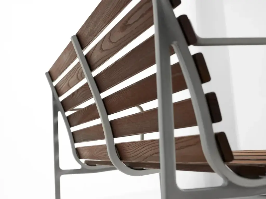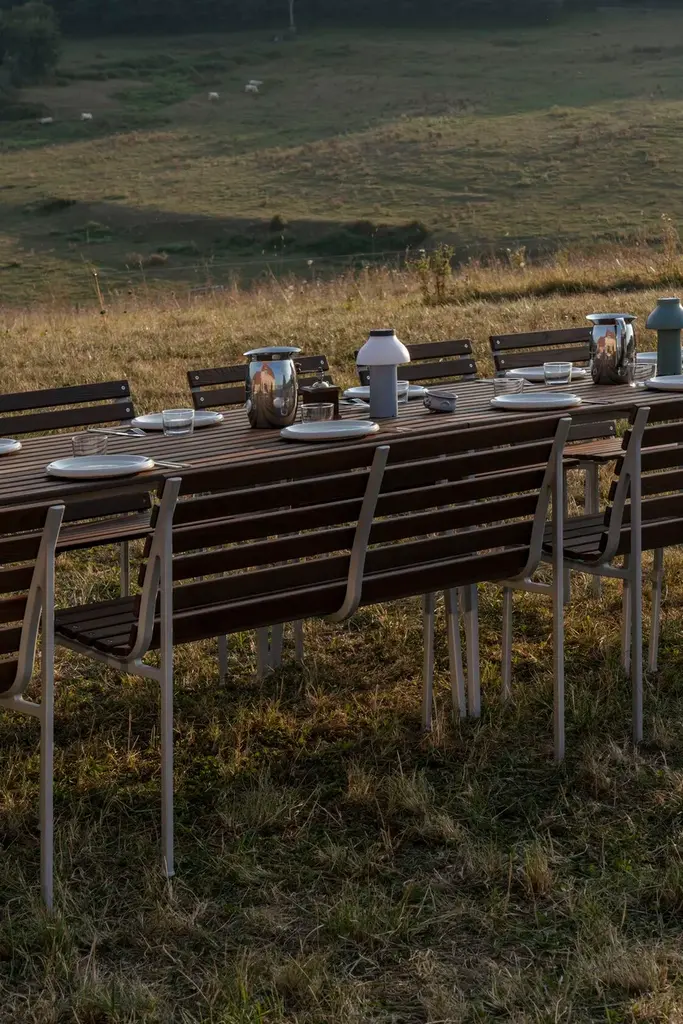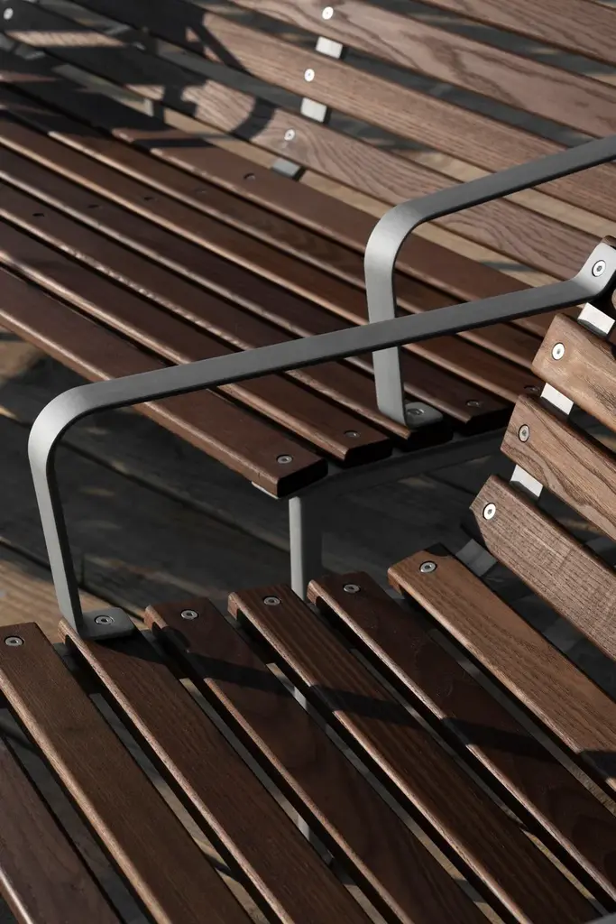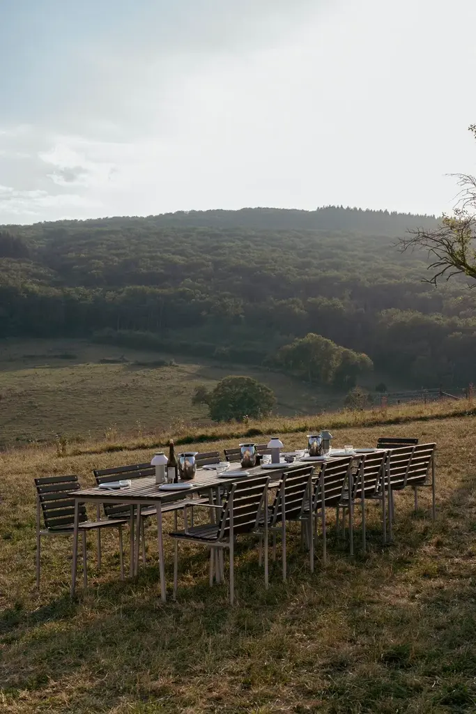Traverse is an outdoor lounge bench with backrest and armrests with slats made of heat treated solid ash with outdoor wood wax oil and frame made of shot-blasted diecast aluminium with outdoor lacquer.Designed for HAY by Erwan Bouroullec, the Traverse Dining Bench is part of an outdoor furniture collection designed to naturally blend in wherever it is placed. Comprising a die-cast aluminium frame with slatted seat in heat-treated ash, the bench combines a robust construction with an inviting expression that naturally patinates to make it more beautiful over time. With its well-balanced aesthetics and ergonomic design, the Traverse Dining Bench can be used with Traverse Tables to create atmospheric dining set-ups in a wide range of private and public spaces. Available with or without armrests.