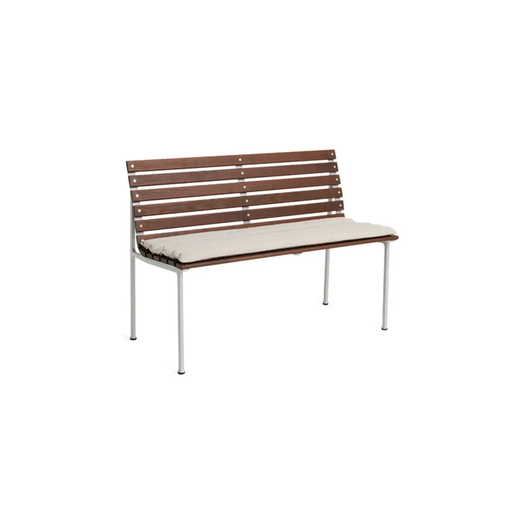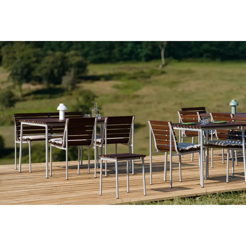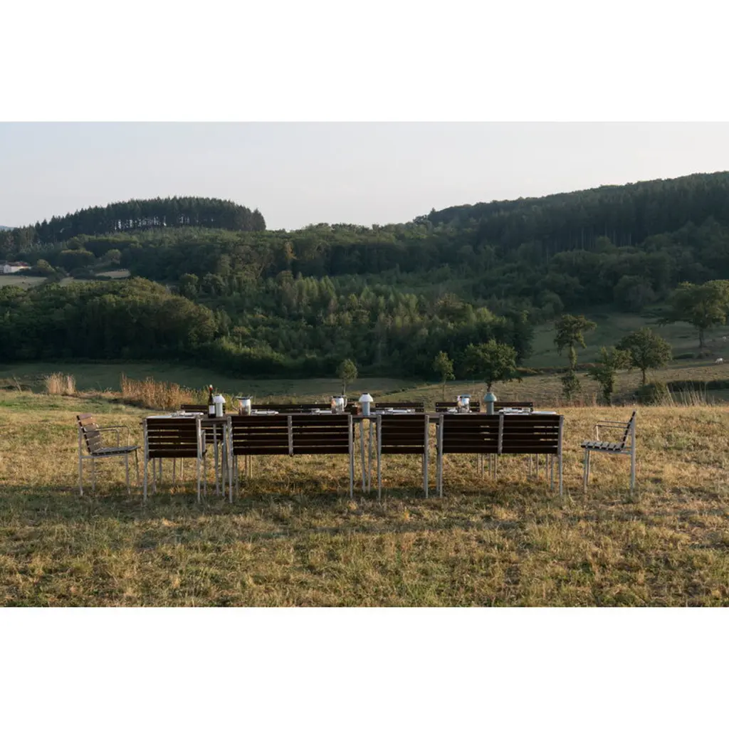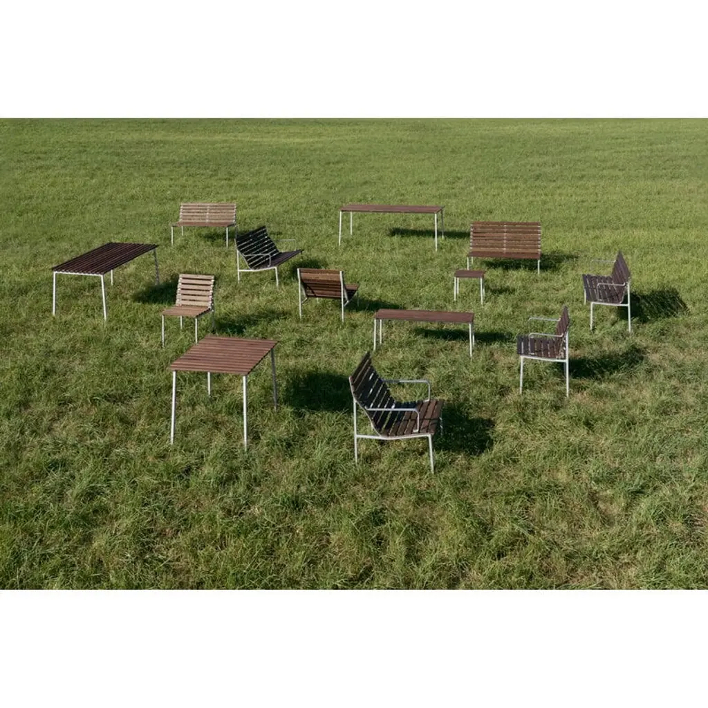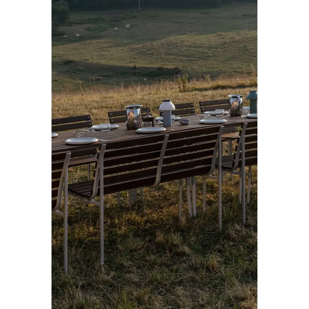 HAY's Traverse dining bench brings together soft, flowing shapes and the rich texture of heat-treated ash, making it a natural fit for any outdoor space. Created by French designer Erwan Bouroullec, this outdoor dining bench adapts effortlessly to its surroundings, whether nestled in a lush garden or placed on a sleek urban balcony. Over time, the heat-treated ash develops a beautiful silver-gray patina, blending even more seamlessly into its surroundings. For added comfort, you can pair the Traverse bench with a separately sold seat cushion. HAY's Traverse patio furniture is crafted from two strong, weather-resistant materials: a lightweight lacquered aluminum frame and solid heat-treated ash. This chemical-free treatment, achieved with steam and heat, enhances the wood's moisture resistance and strengthens it all the way to the core. The process gives the naturally light ash a dark surface, which gradually ages into a soft gray hue under exposure to UV light. To minimize packaging size, the furniture is delivered in parts.