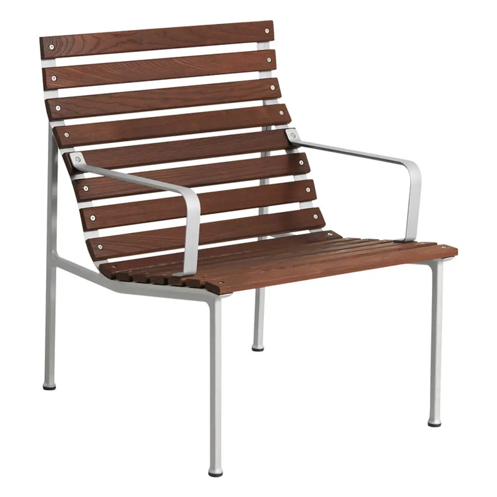 Designed by frequent HAY collaborator Erwan Bouroullec, the Traverse Dining Bench with Arms (2025) brings a graceful yet robust beauty to outdoor entertaining. Its contoured aluminum frame supports heat-treated ash wood slats designed to beautifully patina over time. Inspired by the public benches of 19th-century Paris, the refined yet utilitarian dining bench is ready to entertain in any setting - from urban courtyards to country gardens. Made in China.
