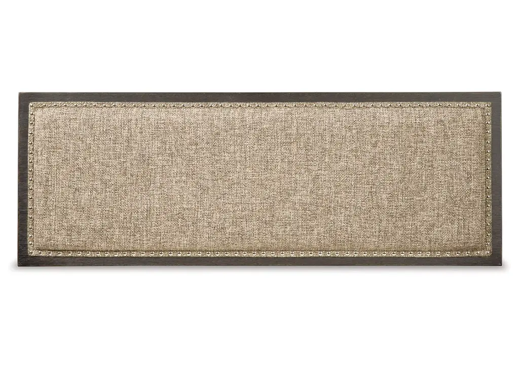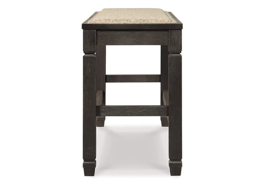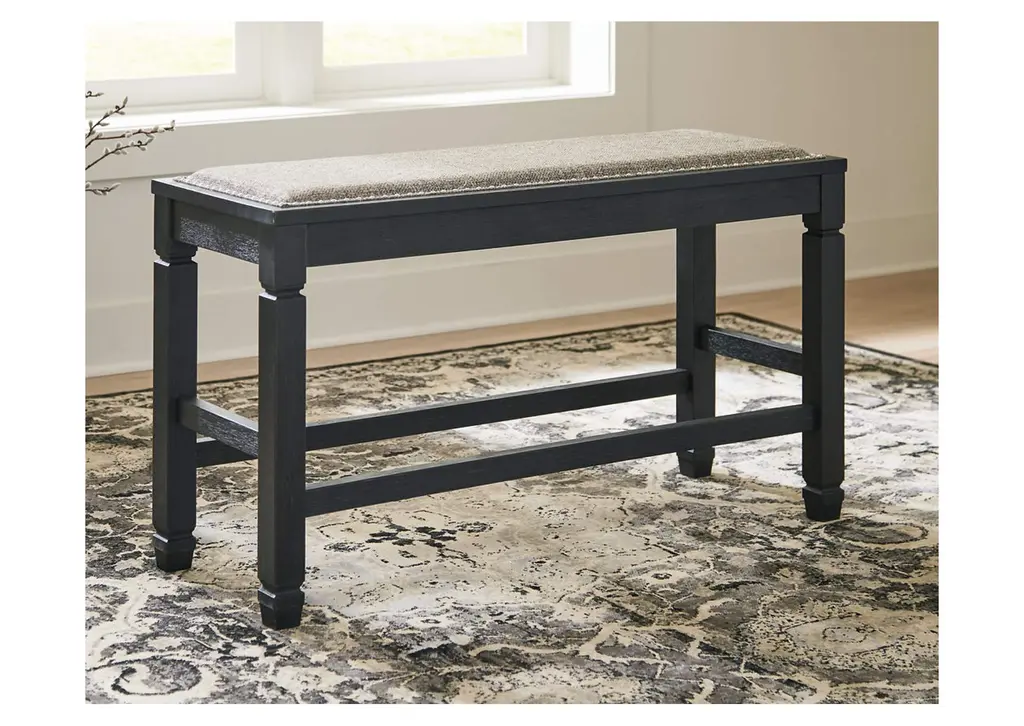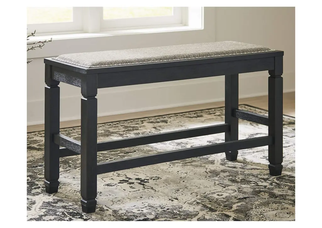 Invite your family into the heart of your home with the Tyler Creek upholstered dining room bench. Its tapered legs provide a sturdy foundation, while the counter height design raises the bar on fine dining. With a textured black finish and heavy woven upholstery accented with silvertone nailhead trim, this is trend-right urban farmhouse style without all the fuss. Weight 35.000 lbs. (15.75kgs.)