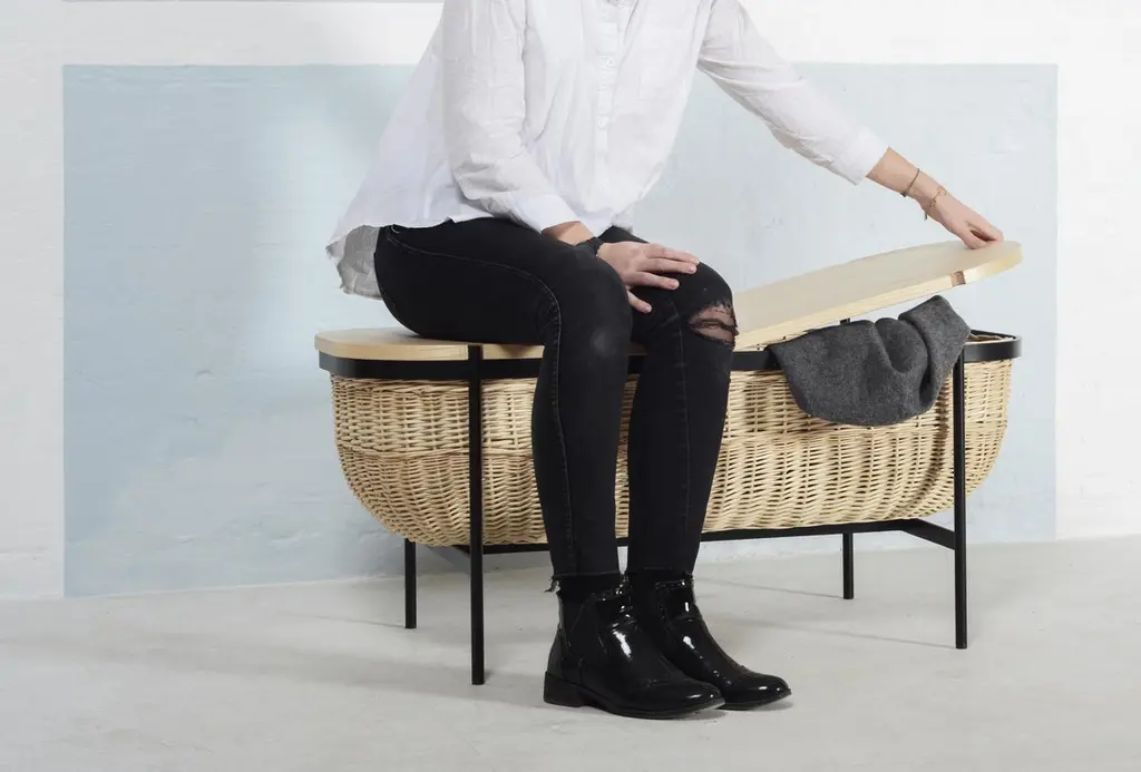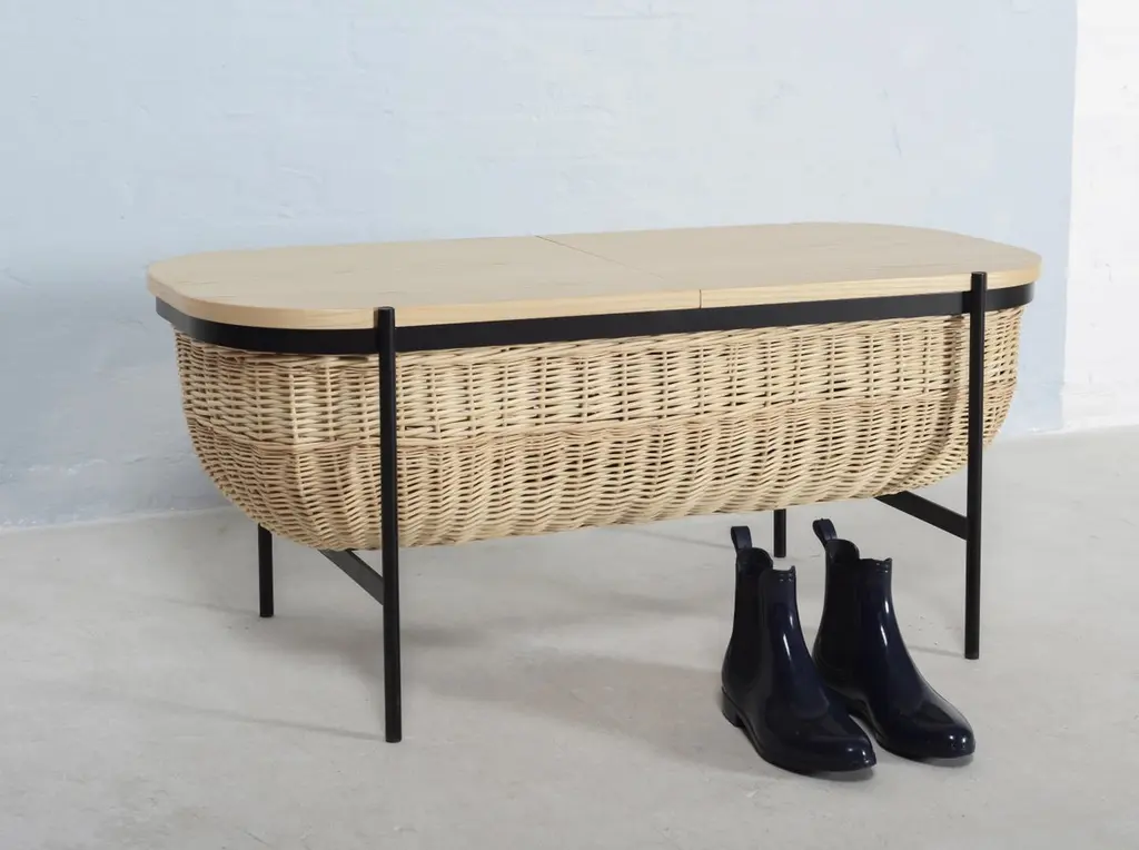 Willow Bench by OK DesignDimensions: D 45 x W 100 x H 44 cm.Materials: Powder-coated metal, willow wicker, MDF with ash veneer.Available in black or white frame. Please contact us.A subtle combination of a metal frame, an ash-veneered lid, and a natural willow basket, defines the wicker bench. The lid opens up like a picnic basket and the basket functions as a storage space.The Willow basket is manufactured in the South Eastern regions of Poland where the wicker craft is still practiced and the conditions for growing Willow are ideal. The lid in natural ash veneer is crafted in Denmark. The metal frame is available in a black or white powder coating.Traditionally the storage benches were used in the kitchen, the dining room, or living room. But this edition is also ideal for the bedroom or in the hallway or even as a coffee table.OK Design was founded by the Danish couple: Jacob Fasting and Kirsten Krogh. Jacob began his entrepreneurial life by founding the first bicycle courier company in Mexico City. Later his adventurous spirit led him down a new, creative path together with the architect Kirsten Krogh.Kirsten and Jacob initiated their success in Europe by introducing the traditional woven furniture from Mexico. Today they create in-house furniture as well as work in collaboration with international designers.OK Design is based in Copenhagen, the environmentally friendly production takes place in the EU, and the designs are sold in more than 40 countries worldwide.Their latest endeavour is Stella Atlántico in Isla de la Palma. A 4 floor building reaching towards the stars and located on the rim of the world’s largest erosion crater. Stella Atlántico functions as a combined visual showroom and holiday home.