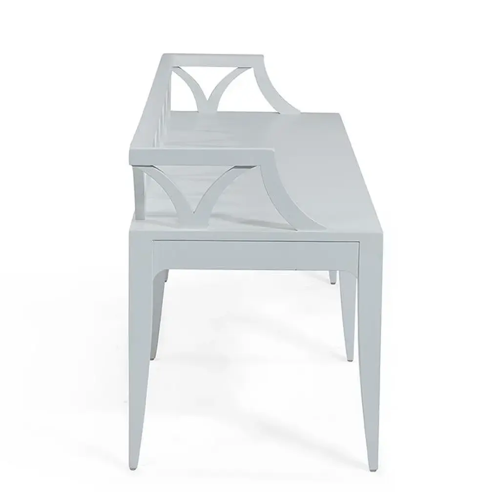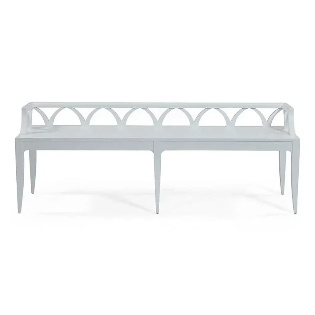 A delightful entryway or dining bench with a colonnade of wooden arches above a wood seat that is elevated on gracefully tapering legs. Seat height without cushion: 18" Care Instructions: Wipe with a soft clean cloth