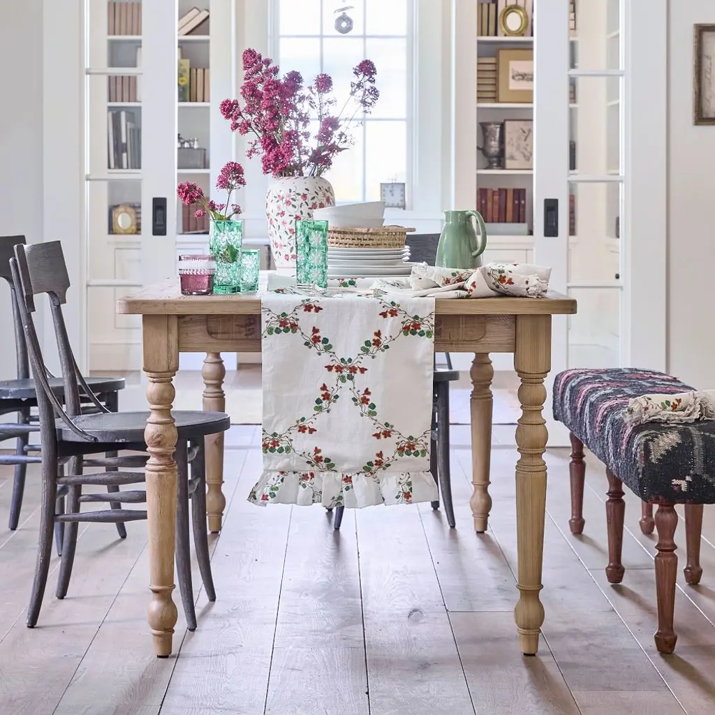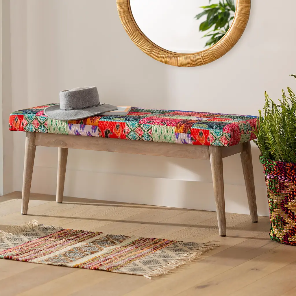 Useful and beautiful. Upholstered in a kilim rug, this FSC®-certified bench brings extra seating to a dining room, entryway, or hall. Turned solid wood legs and a floral flatweave wear beautifully over time.