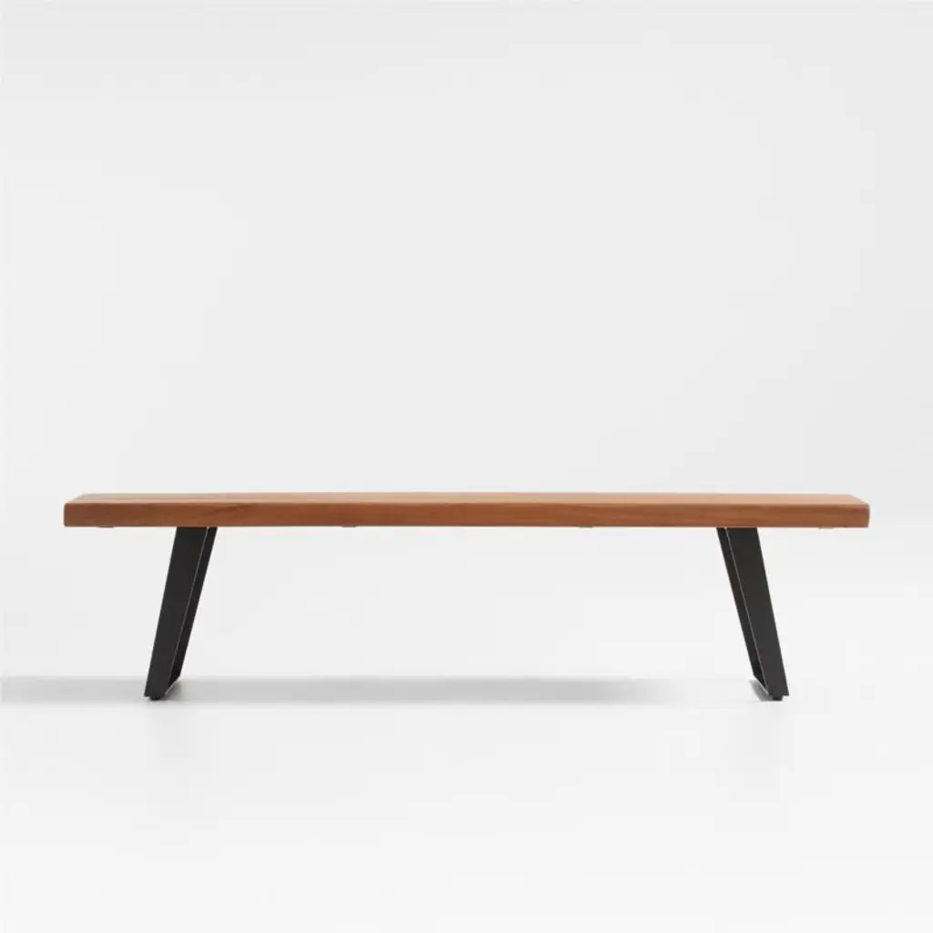 A solid slab of live-edge acacia wood creates a rustic, organic design that freshens the dining room or entryway. The undulating curves of the bench edges are sanded smooth, exposing natural wood tones. Angled U-shaped legs, fashioned from steel and finished in matte antique black, provide modern counterpoint. The unique graining, knots and fissures of the wood add to the distinct character of this exceptional statement piece.