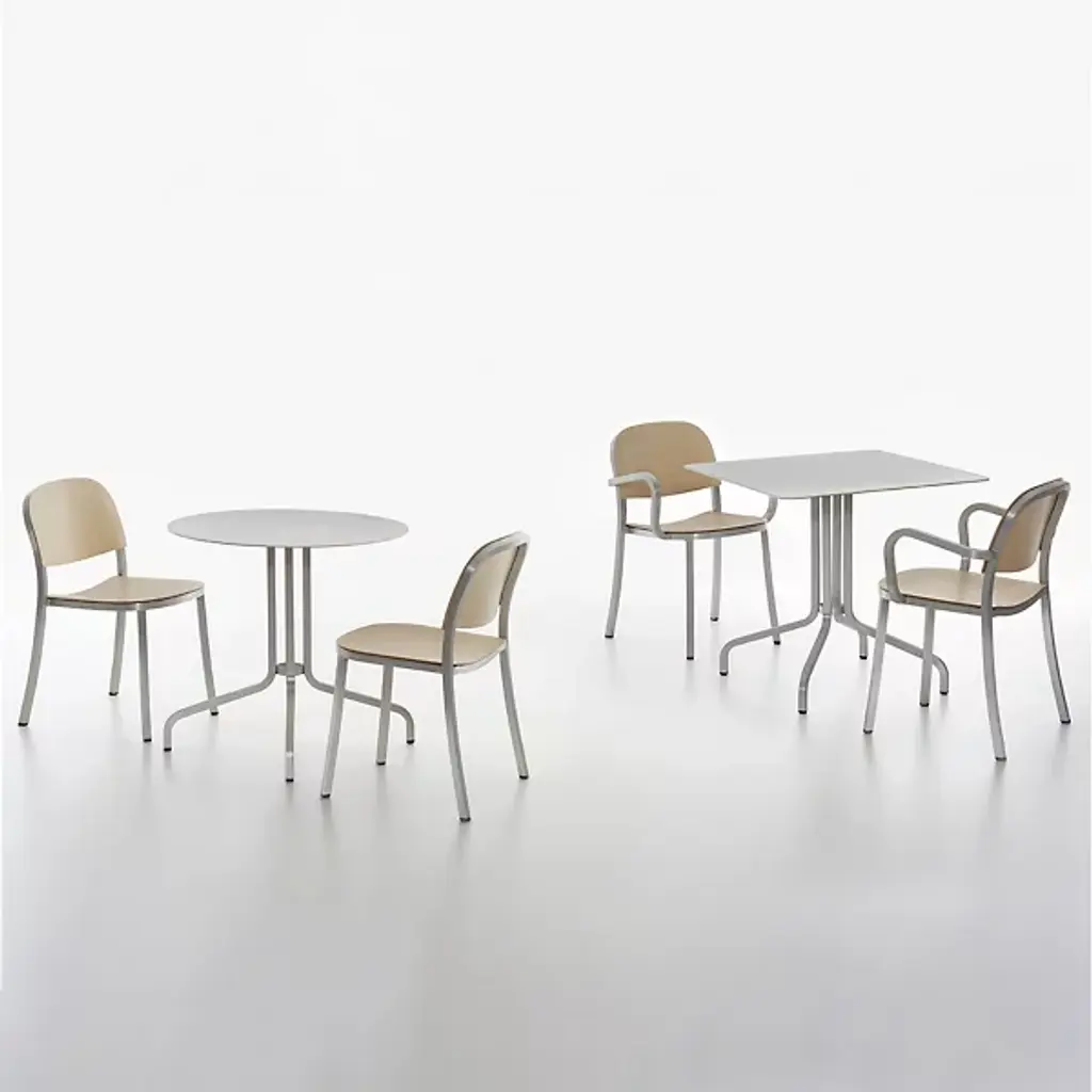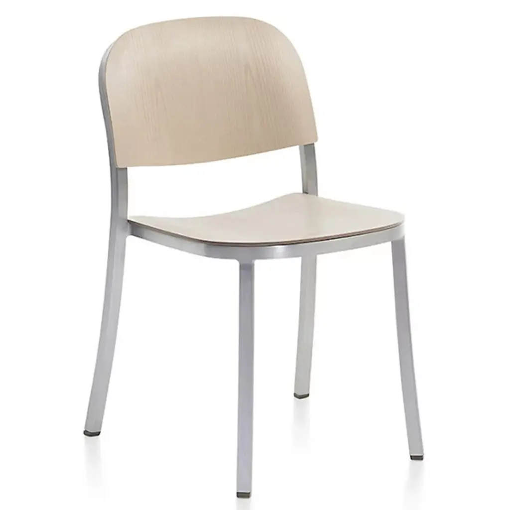 Effortless style and practicality unite in the 1 Inch Stacking Chair, Wood Seat and Back by Emeco. The frame is made of recycled aluminum to deliver a sleek look and enduring strength. Contrasting wood adds interest. For comfortable dining or working, the backrest and seating are gently curved. Lightweight, yet sturdy, this contemporary handcrafted furniture is designed so that you can easily stack up to six chairs for convenient storage and effortless rearranging.